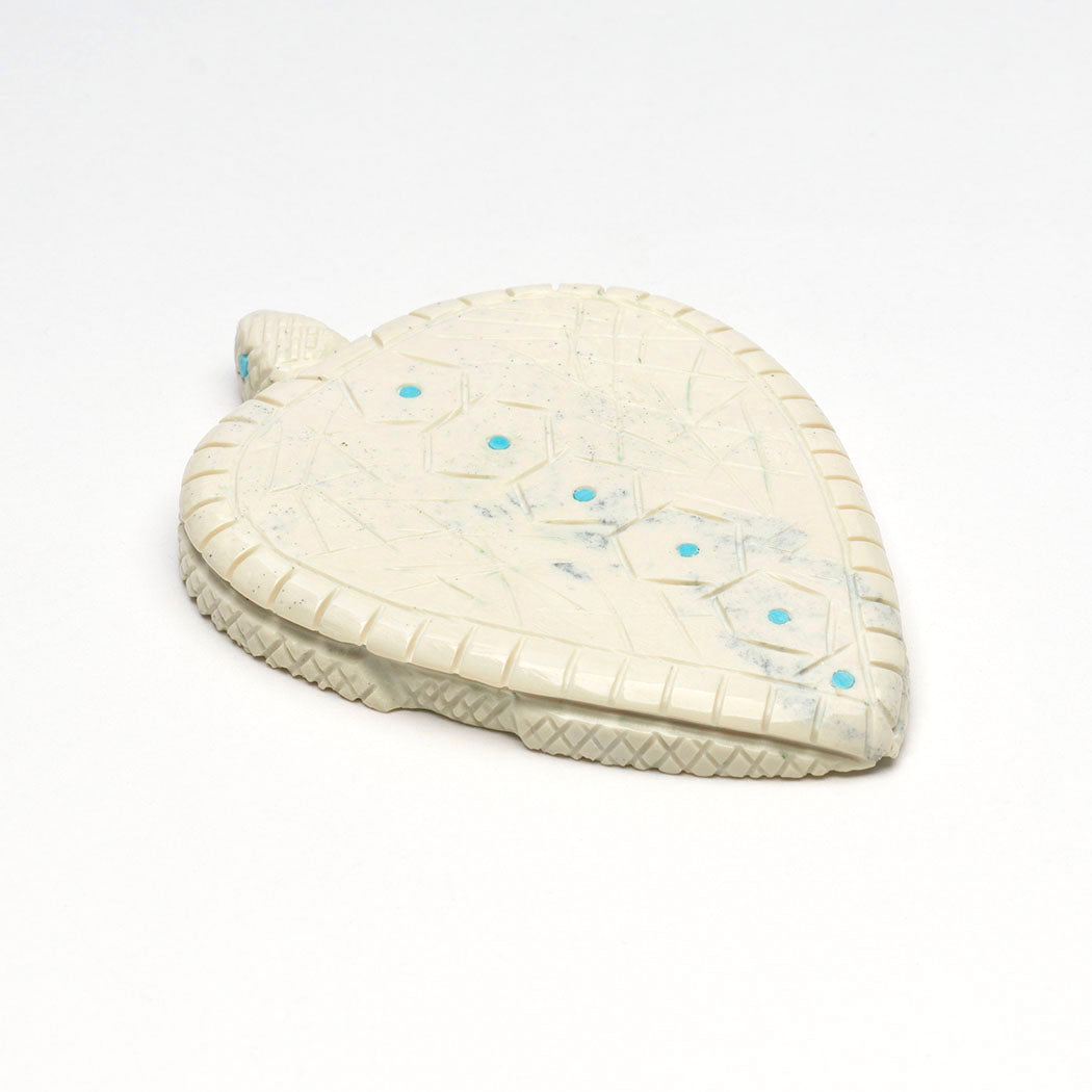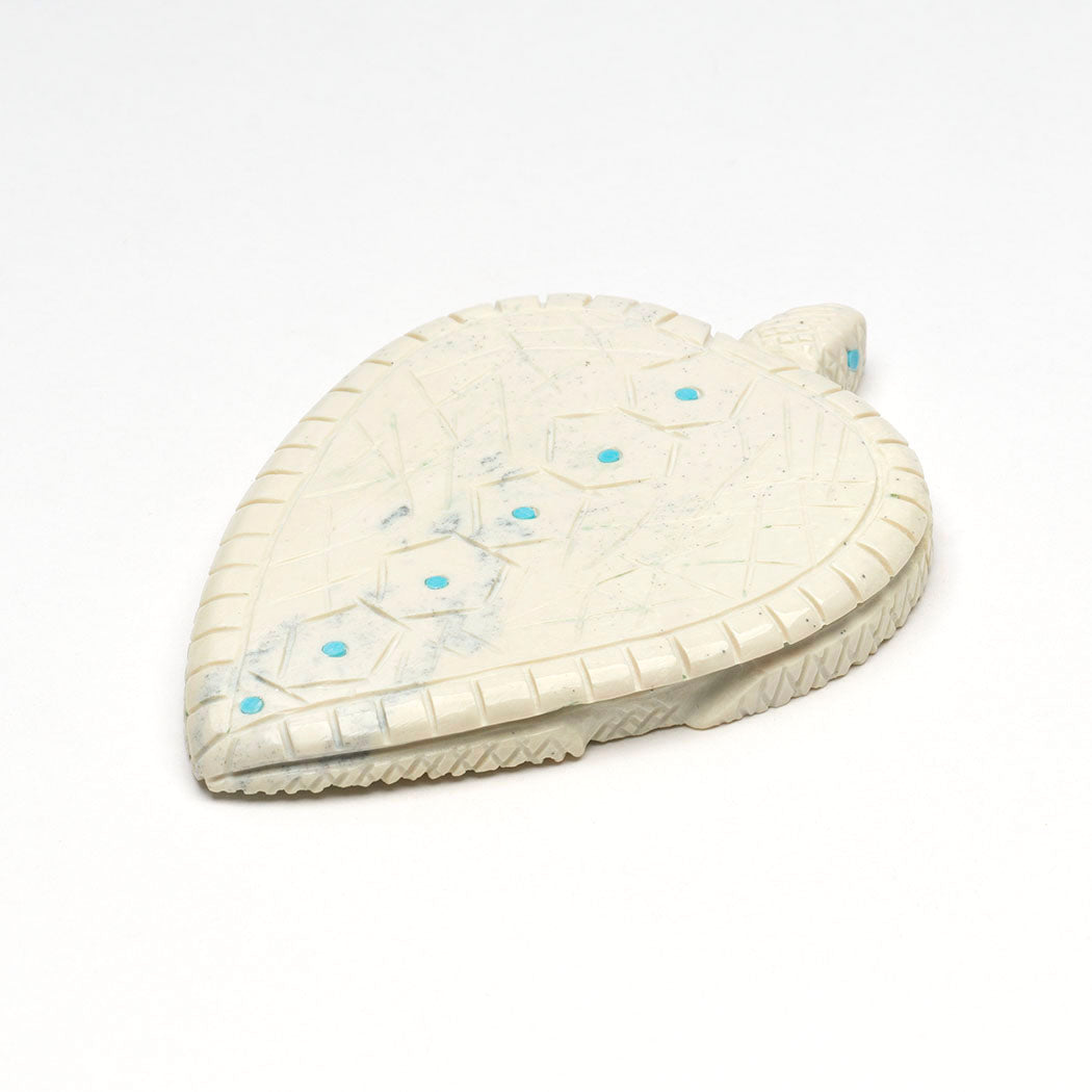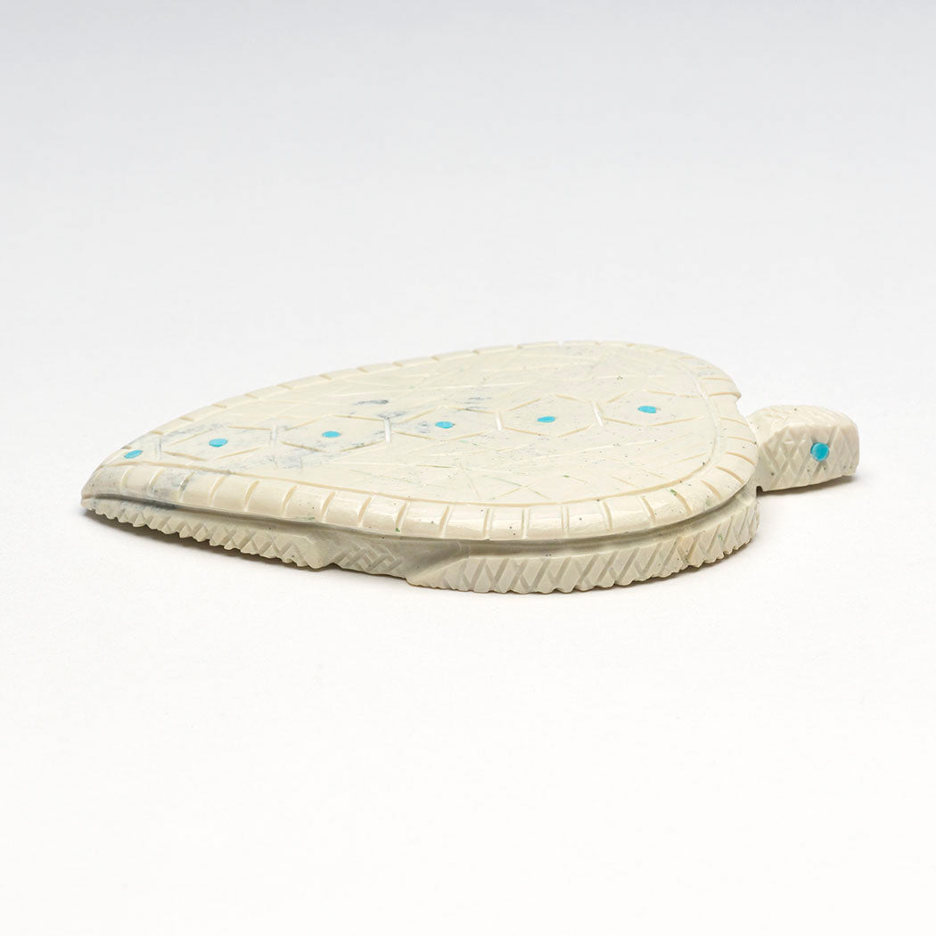 turtle carved from fish rock serpentine with wonderful carapace and body incising. Endearing eyes and spots are from turquoise inlays. About 3 3/4" long, 2 5/8" wide and 3/8" tall.