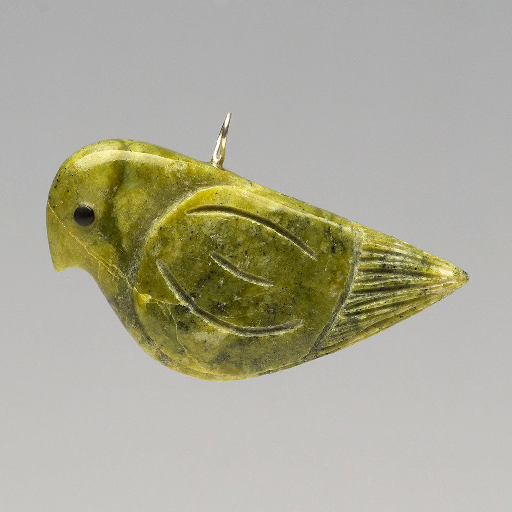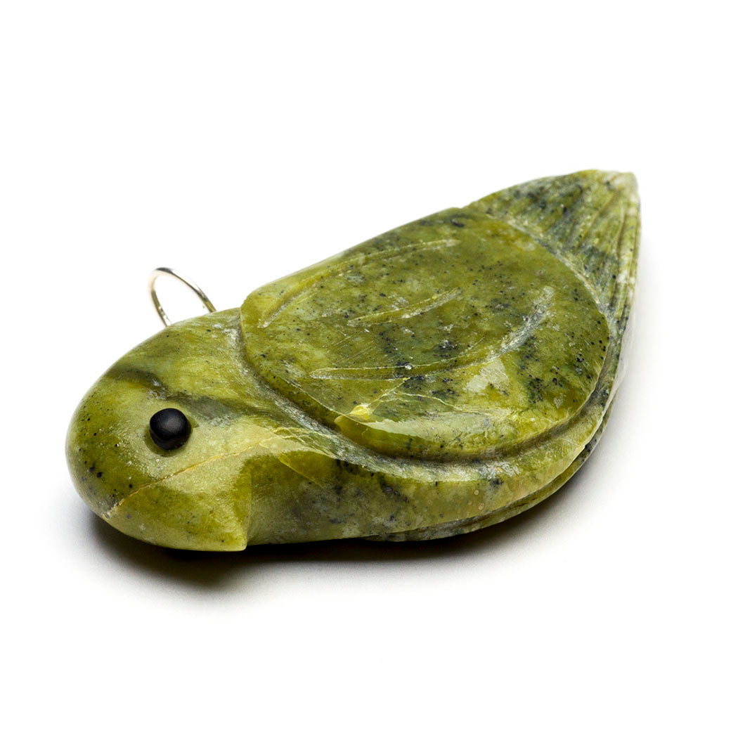 Kateri Quandelacy Sanchez's wonderful songbird pendant has been sculpted from a refreshing serpentine with minimal grooving for wing and tail feather definition. Listening to melodious songbirds fills our hearts with joy and hope. Sweet eyes are from jet inlays. Dimensions of this reversible delight including the silver bale are approximately 1 1/4" long, 2 1/8" wide and 3/8" deep.