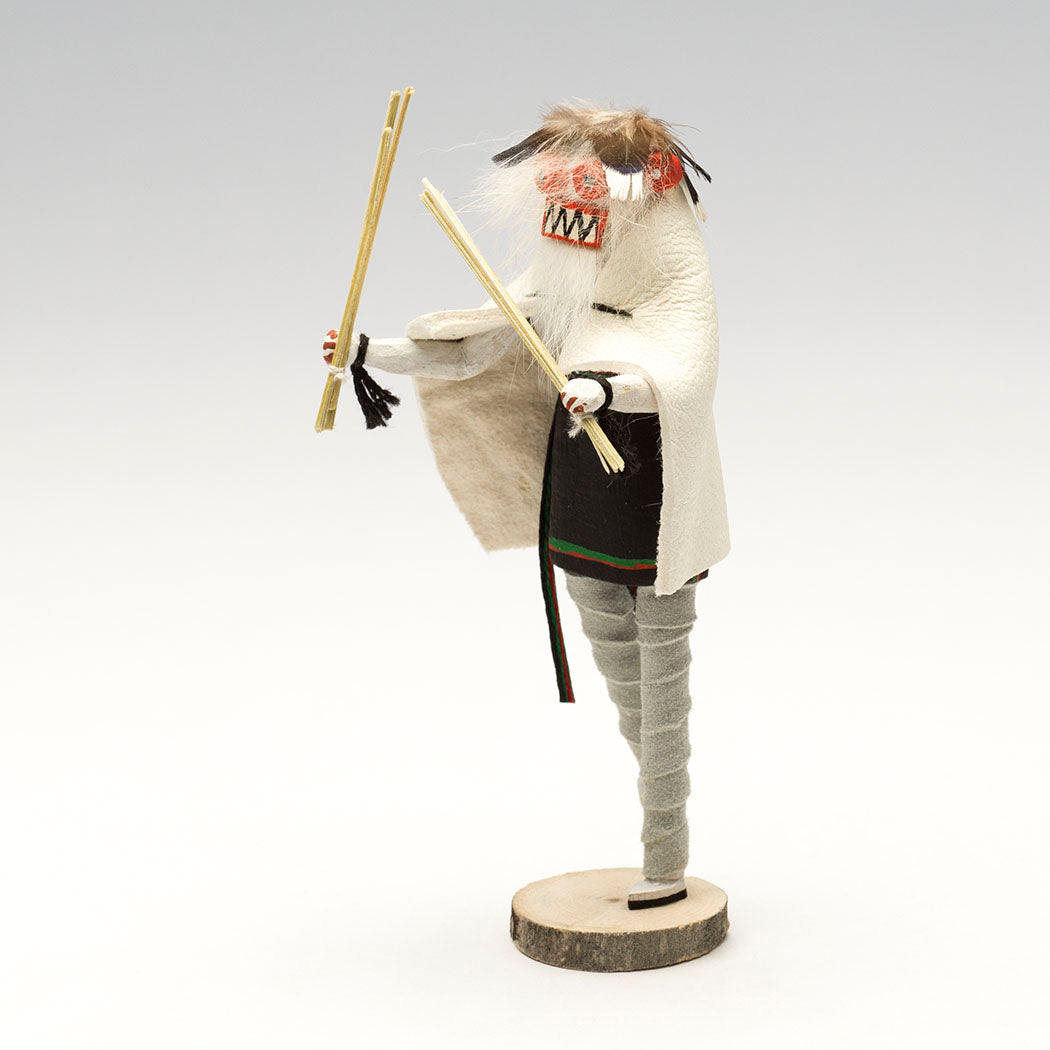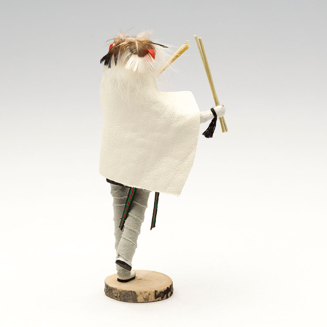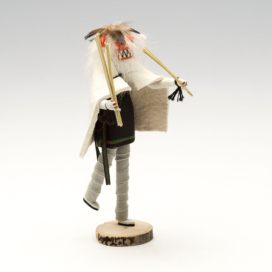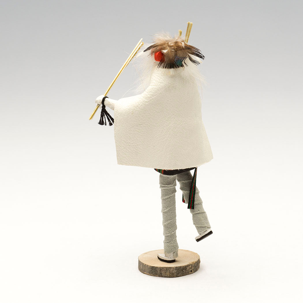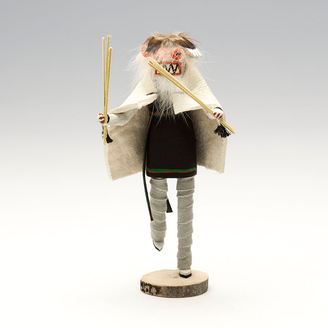 The Hopi Cold Bringing Woman Katsina prompts the white cold of the winter season. She carries bundles of reeds used as traditional combs to rumple people's hair. Alvin Leon's wonderful katsina doll is carved from cottonwood and painted with acrylic paints. Leather, yucca, feathers, fur and embroidery thread details this fine woodwork. Measurements are about 4 1/4" tall, 2 1/4" wide and 1 3/4" deep, including the base. Signed by the artist.