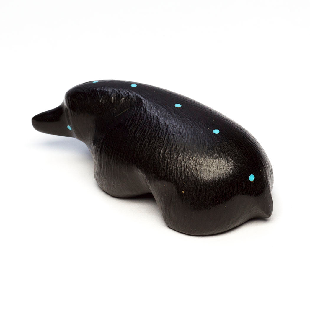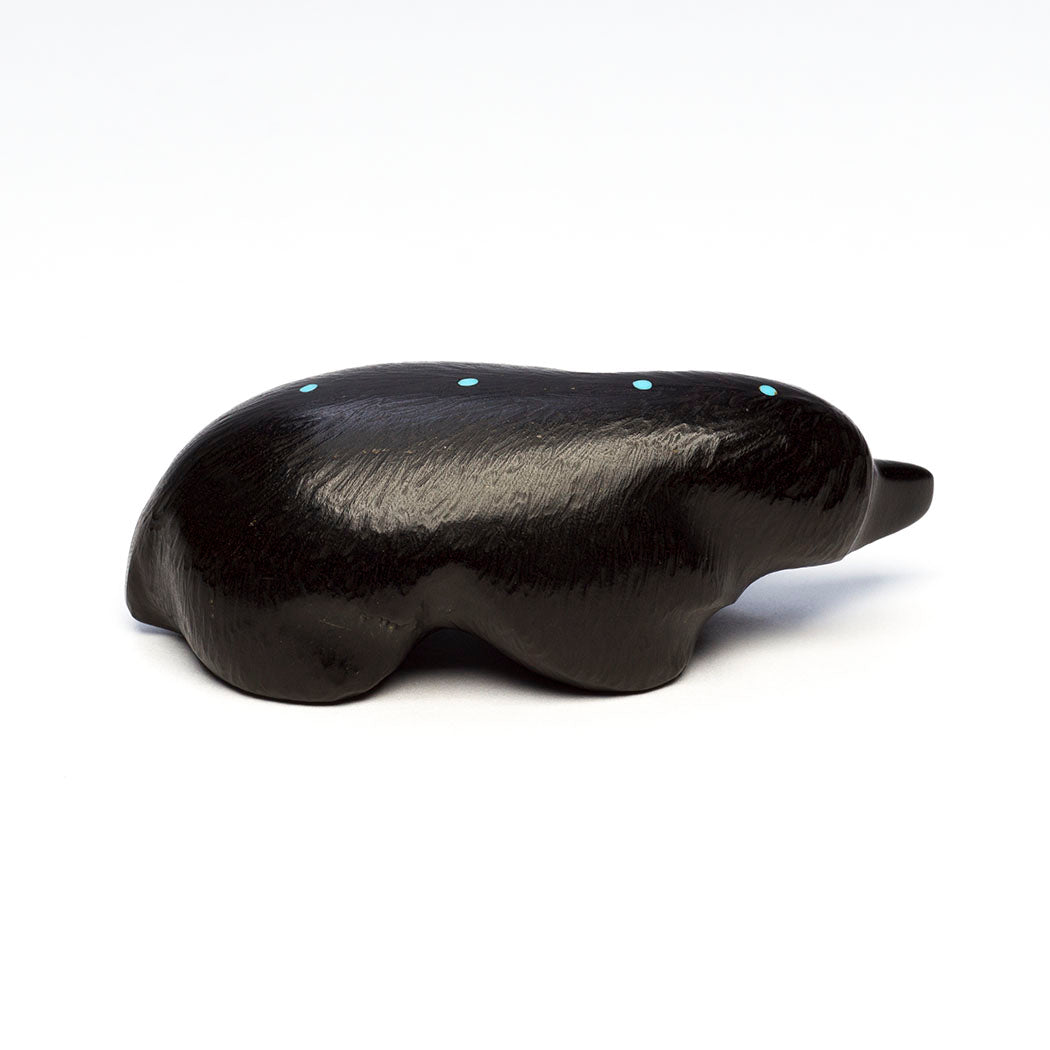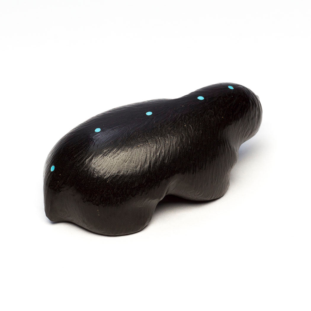 No need for great eyesight as Herbert Halate's lightly-etched jet Mole already knows where to go and what to do as it trusts other instincts to survive. Lovely turquoise inlays adorn the length of this underground creature, while turquoise eyes are set into a slightly turned head. A mole's way of life teaches us to rely on our inner voice not just the visuals. Approximately 3" long, 1 3/8" wide and 1" tall.