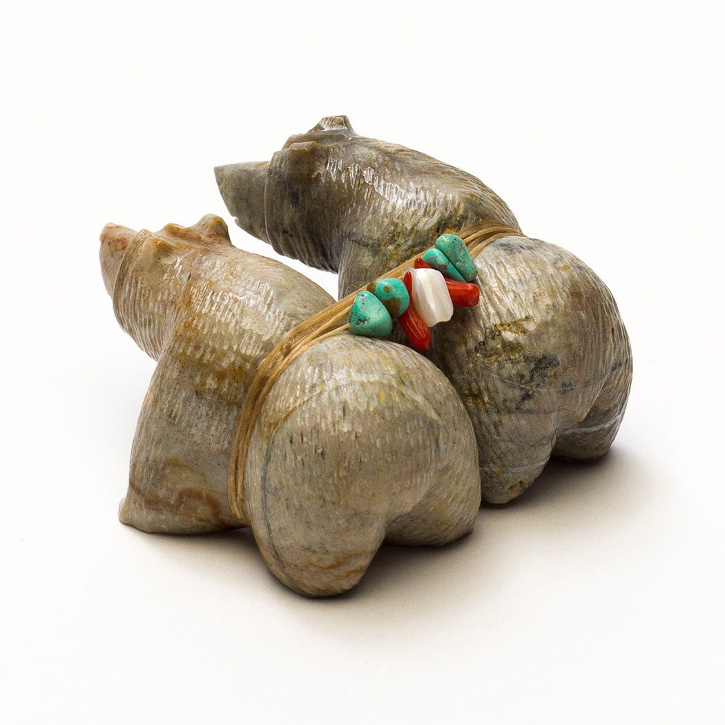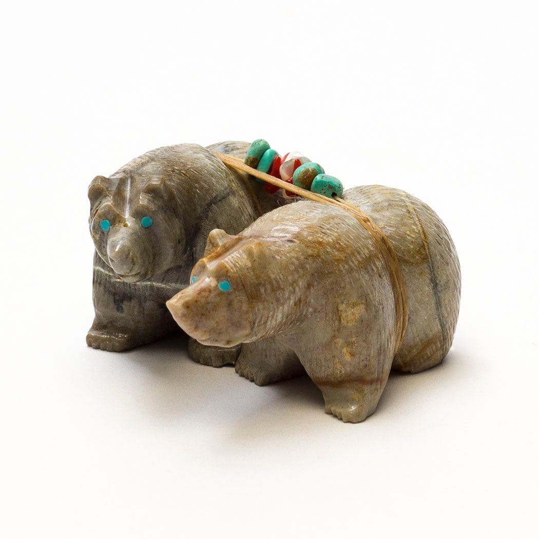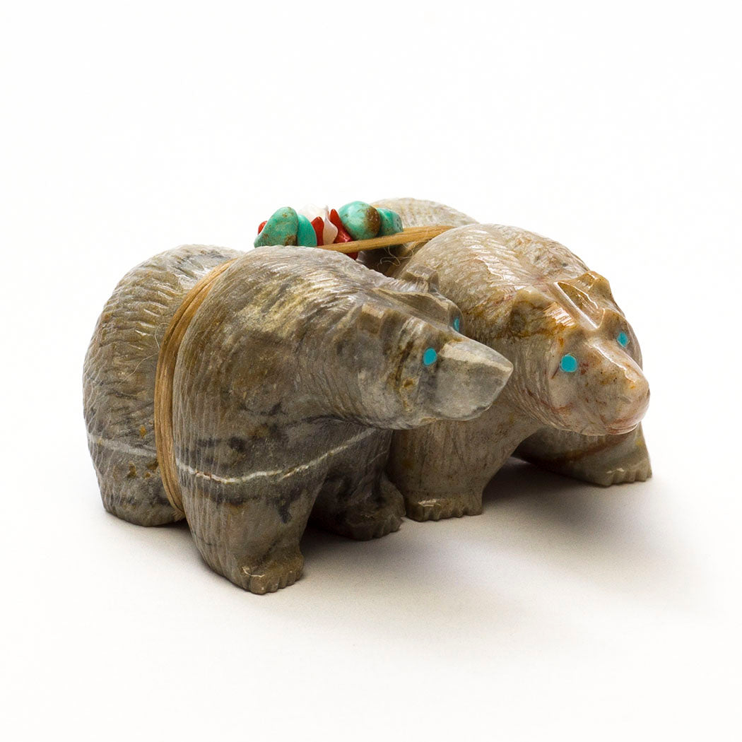 Bears happily journey to the land of the beehives where nutrient-rich larvae and sweet honey from the hives will fill their bellies. Wise bears seek out the entire hive's contents for a complete meal. Each turquoise-eyed bear is wonderfully carved from Picasso marble and etched for lovely fur-effect. Together they measure approximately 2 1/8" long, 2" wide and 1 3/8" tall.