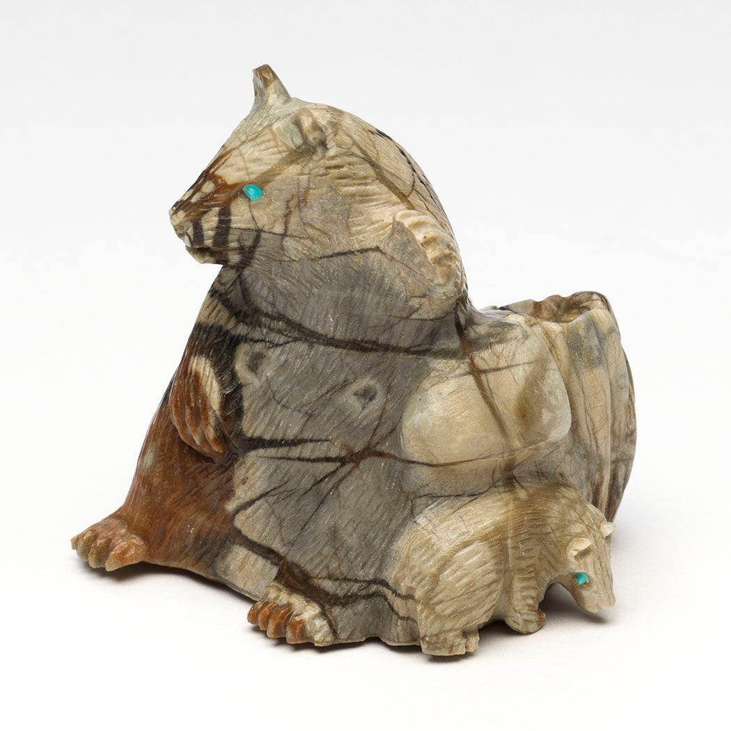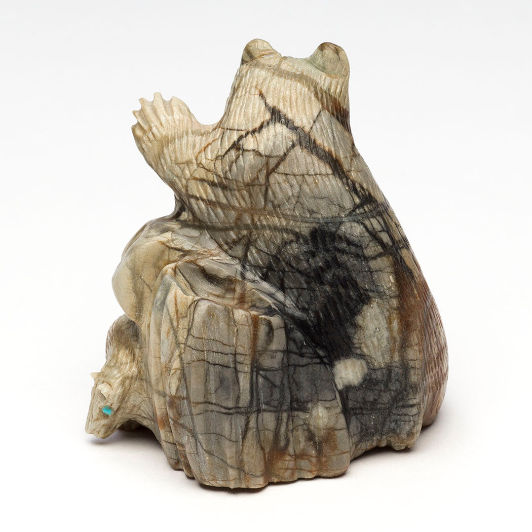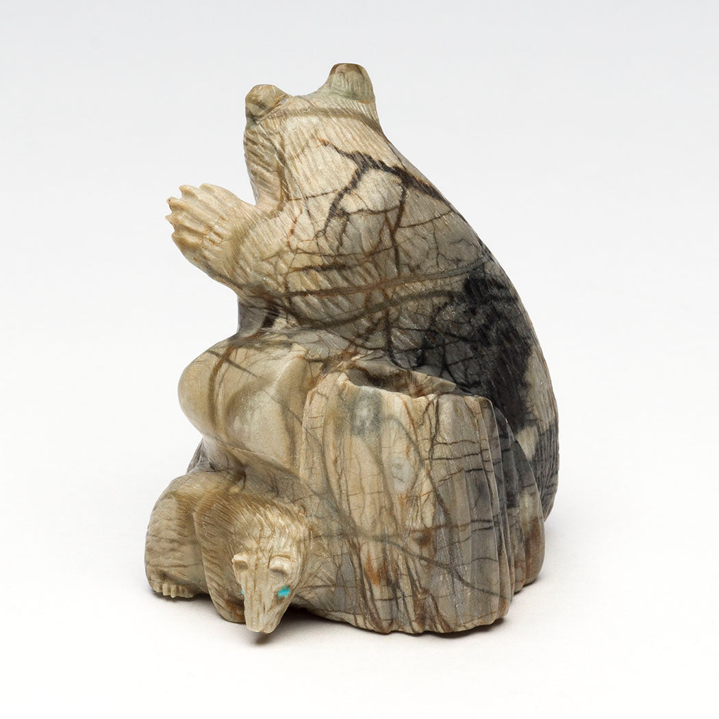 Bears are renowned for a staunch dedication and protective nature towards their offspring surpassing that of any other species on Mother Earth. Bear medicine teaches us about the parent-child relationship that should focus on the nurturing, safeguarding and caring for our young. Lance Cheama's Picasso marble sculpture depicts a resting mother Bear leaning against an old tree stump while baby explores. Their eyes are from turquoise inlays. The lovely natural inclusions in the stone suggest mother bear is nursing little cub. Dimensions all together are about 2 1/4" tall, 2" wide and 2" deep.