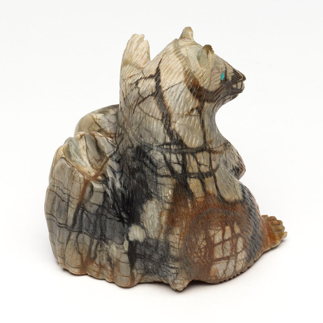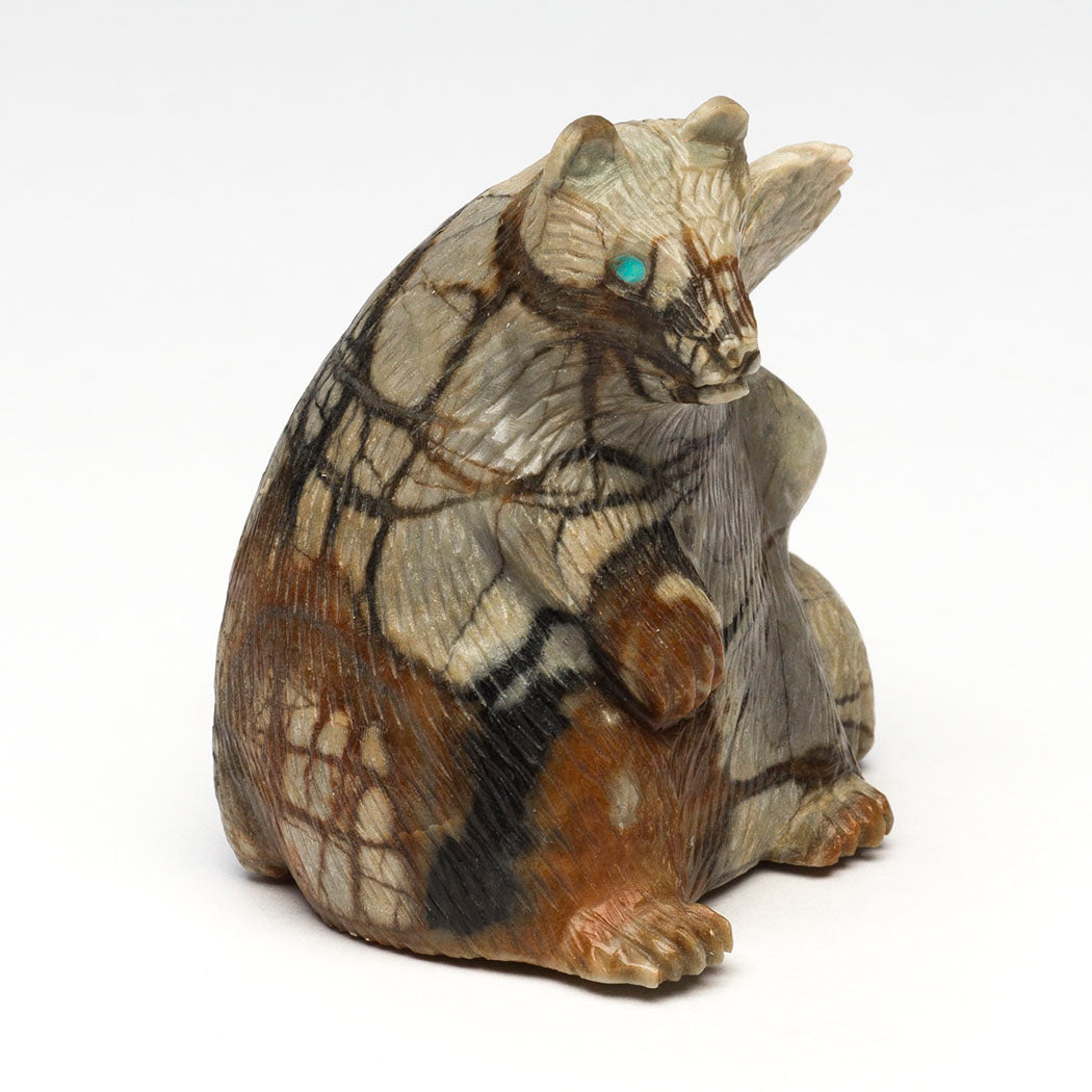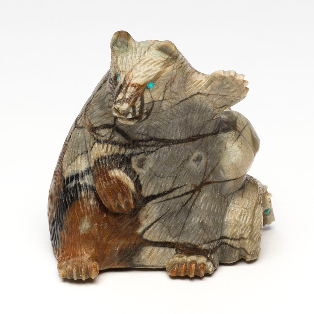 Bears are renowned for a staunch dedication and protective nature towards their offspring surpassing that of any other species on Mother Earth. Bear medicine teaches us about the parent-child relationship that should focus on the nurturing, safeguarding and caring for our young. Lance Cheama's Picasso marble sculpture depicts a resting mother Bear leaning against an old tree stump while baby explores. Their eyes are from turquoise inlays. The lovely natural inclusions in the stone suggest mother bear is nursing little cub. Dimensions all together are about 2 1/4" tall, 2" wide and 2" deep.