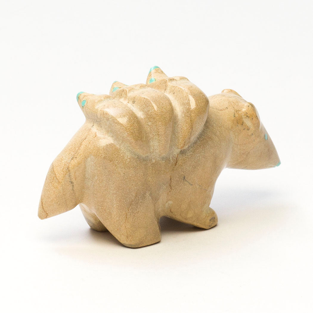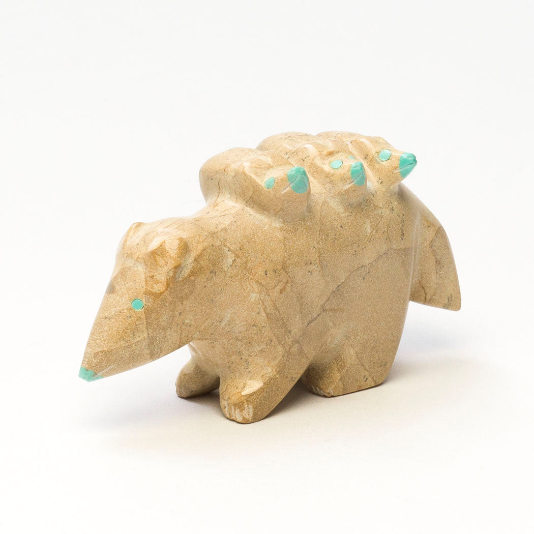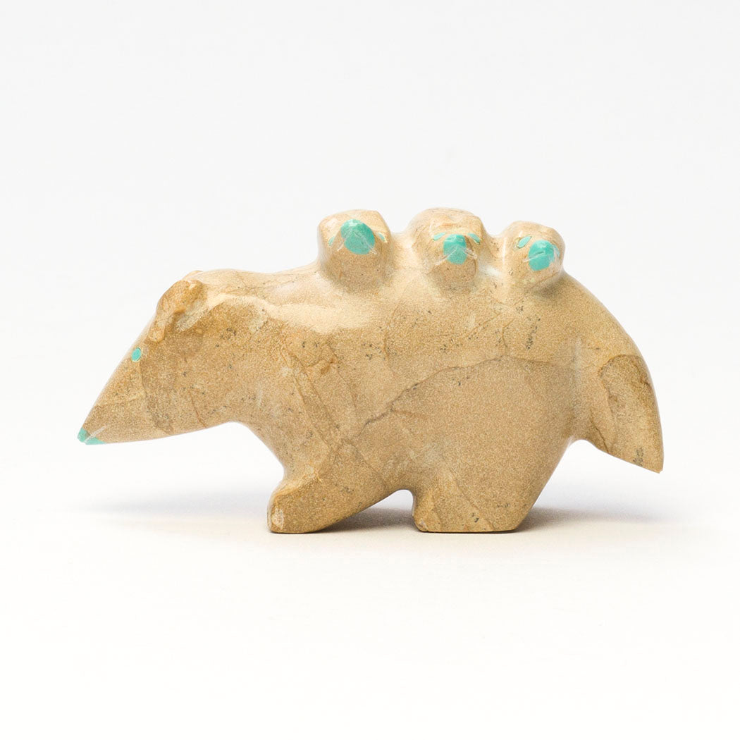Opossum are amazing prehensile-tailed marsupials, the only of their kind existing in North America. They are considered living fossils because ancient fossil finds reveal skeletons of small mammals that have remain unchanged for millions of years, the ancestors of modern day opossum. Like kangaroos, mother opossum carry the babies in a pouch but when they get too big, they'll adorably hitch a ride on her back. Enrike Leekya's adorable Zuni travertine opossum family have endearing eyes from turquoise inlays ready to grasp your heart. Sweet nose tips are from turquoise as well. A delightful tree-climbing clan that measures approximately 3 1/4" long, 1" wide and 1 3/4" tall. Opossum benefit the environment because they are natural pest controllers and clean up fallen fruit.
