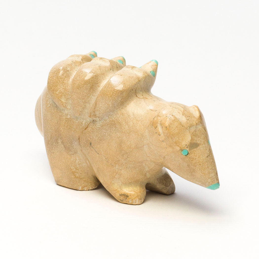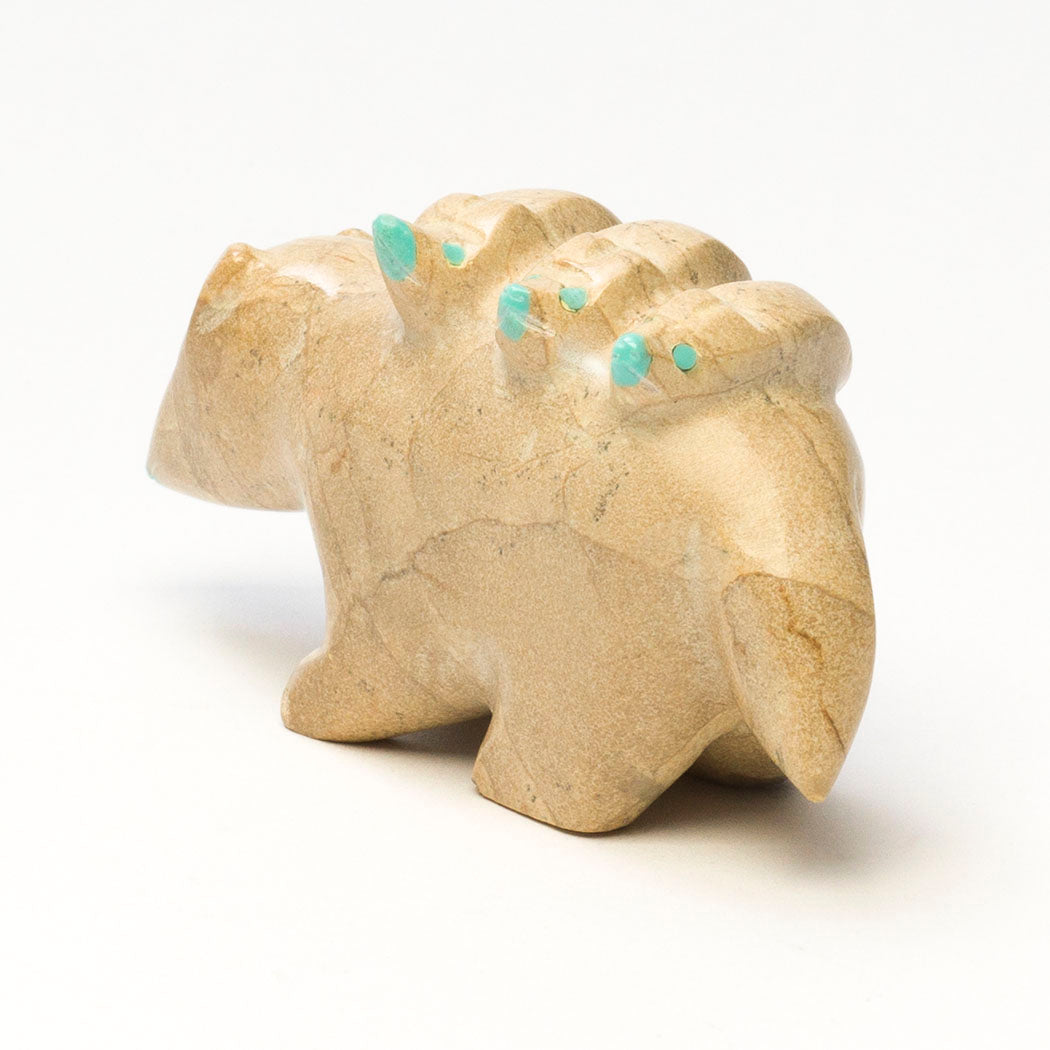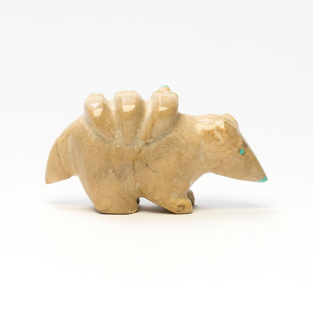 Opossum are amazing prehensile-tailed marsupials, the only of their kind existing in North America. They are considered living fossils because ancient fossil finds reveal skeletons of small mammals that have remain unchanged for millions of years, the ancestors of modern day opossum. Like kangaroos, mother opossum carry the babies in a pouch but when they get too big, they'll adorably hitch a ride on her back. Enrike Leekya's adorable Zuni travertine opossum family have endearing eyes from turquoise inlays ready to grasp your heart. Sweet nose tips are from turquoise as well. A delightful tree-climbing clan that measures approximately 3 1/4" long, 1" wide and 1 3/4" tall. Opossum benefit the environment because they are natural pest controllers and clean up fallen fruit.