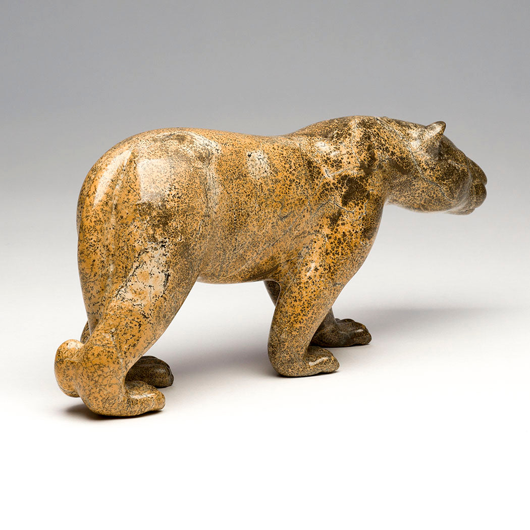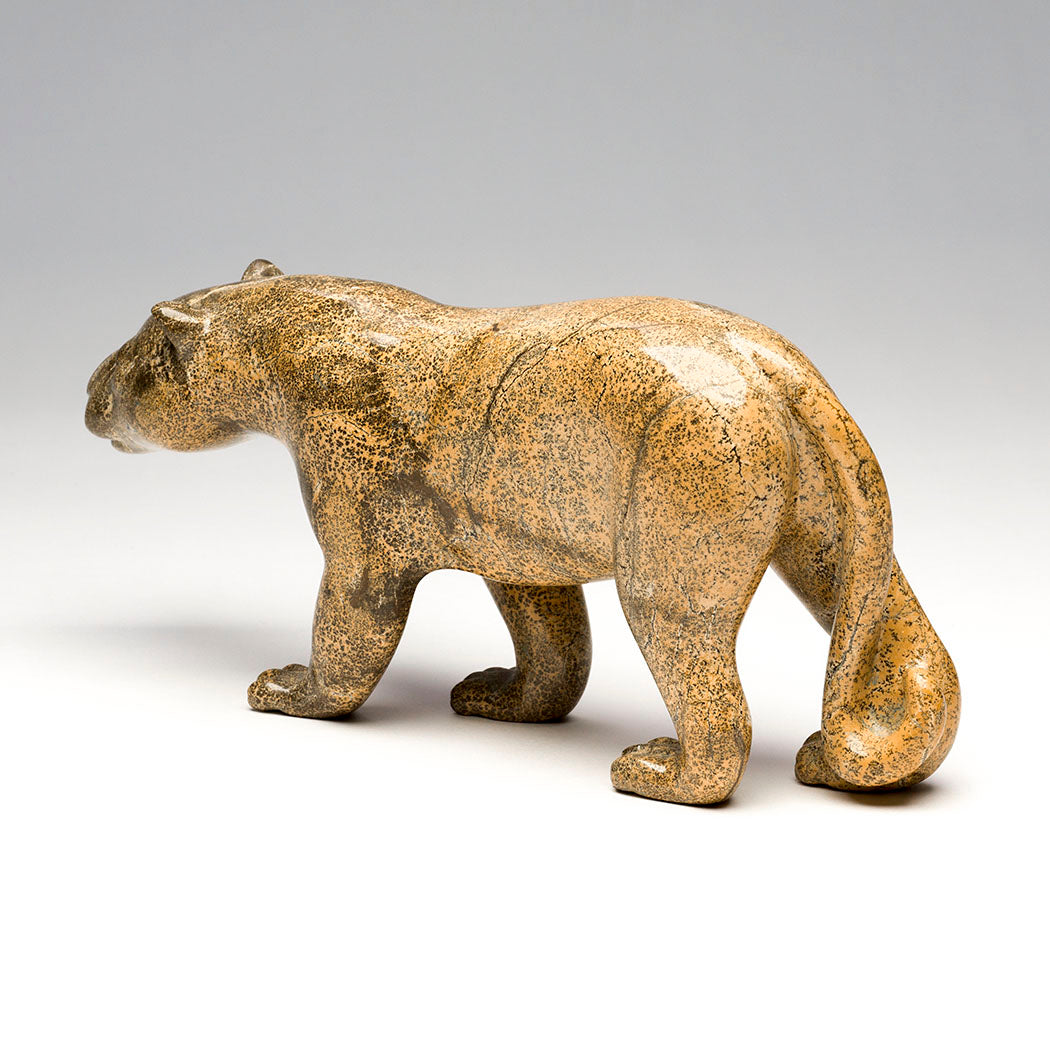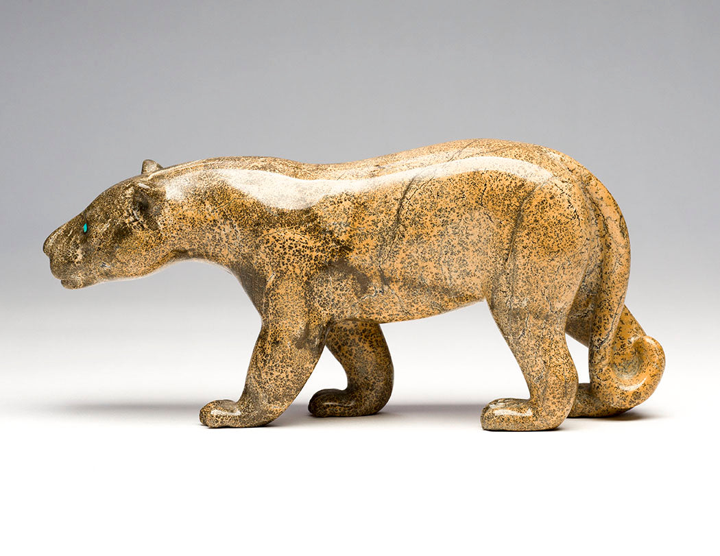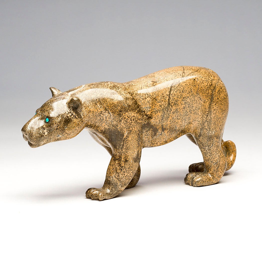 Melvin Eriacho's exceptional technical skills and natural artistry bring a museum-quality Mountain-lion (cougar, puma or panther) to life. Walking gracefully, the feline's presence evokes awe. Spirited eyes are from sky blue turquoise inlays. The rich Zuni travertine is polished beautifully enhancing the mineral's tawny hues and speckled inclusions. The realism of the sculpture awakens our appreciation for the incredible power and majesty of the great cats. Approximately 9" long, 2 1/8" wide and 4 1/4" tall.