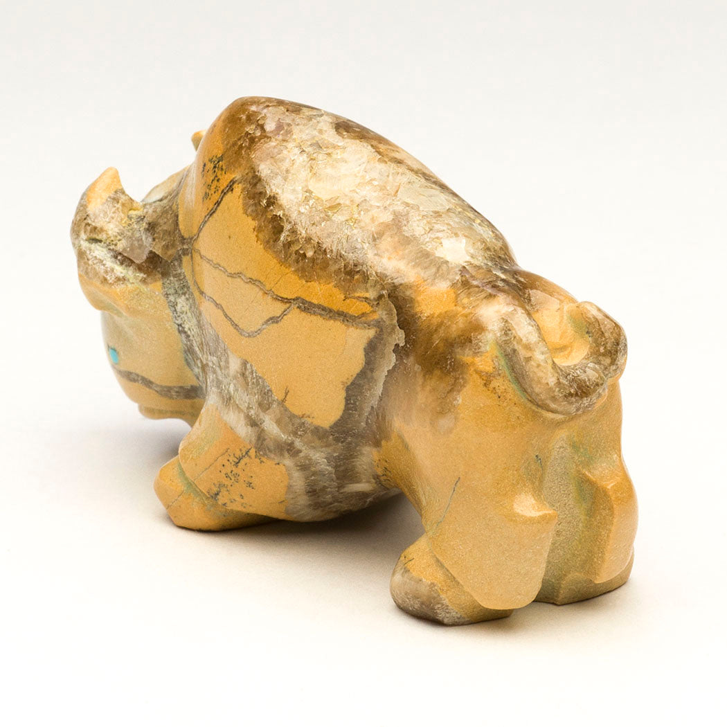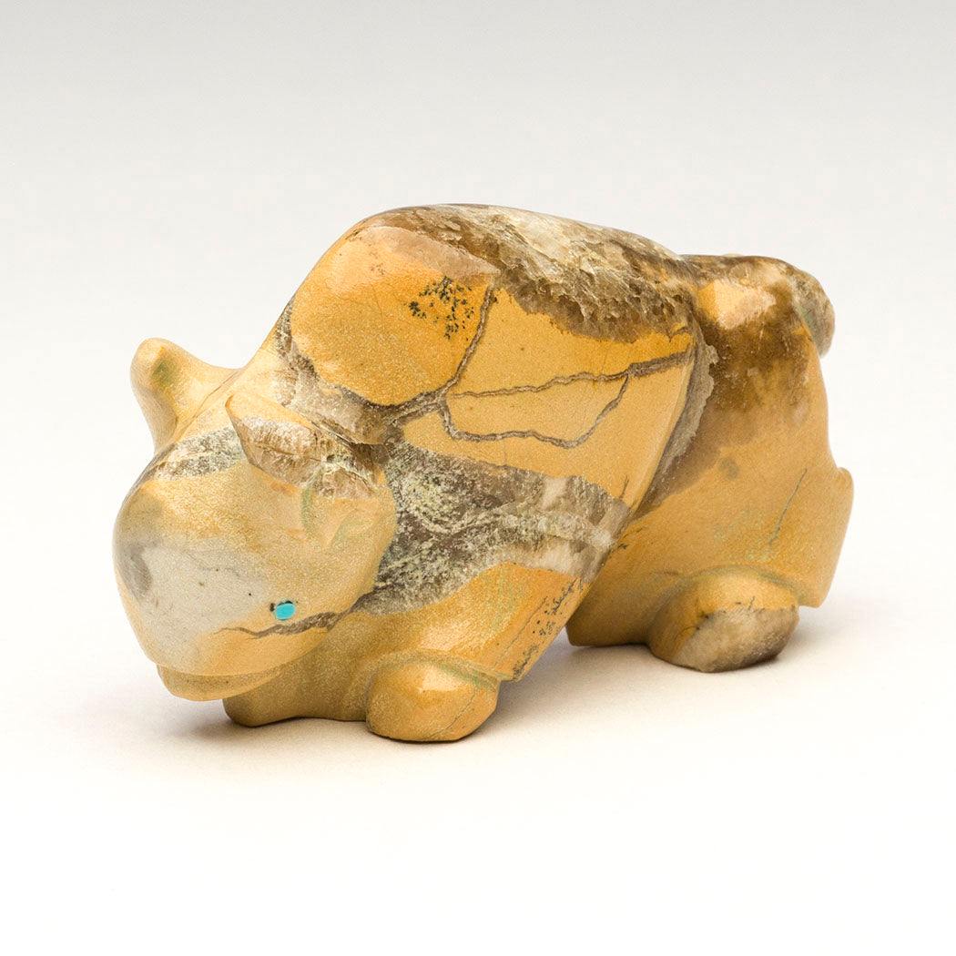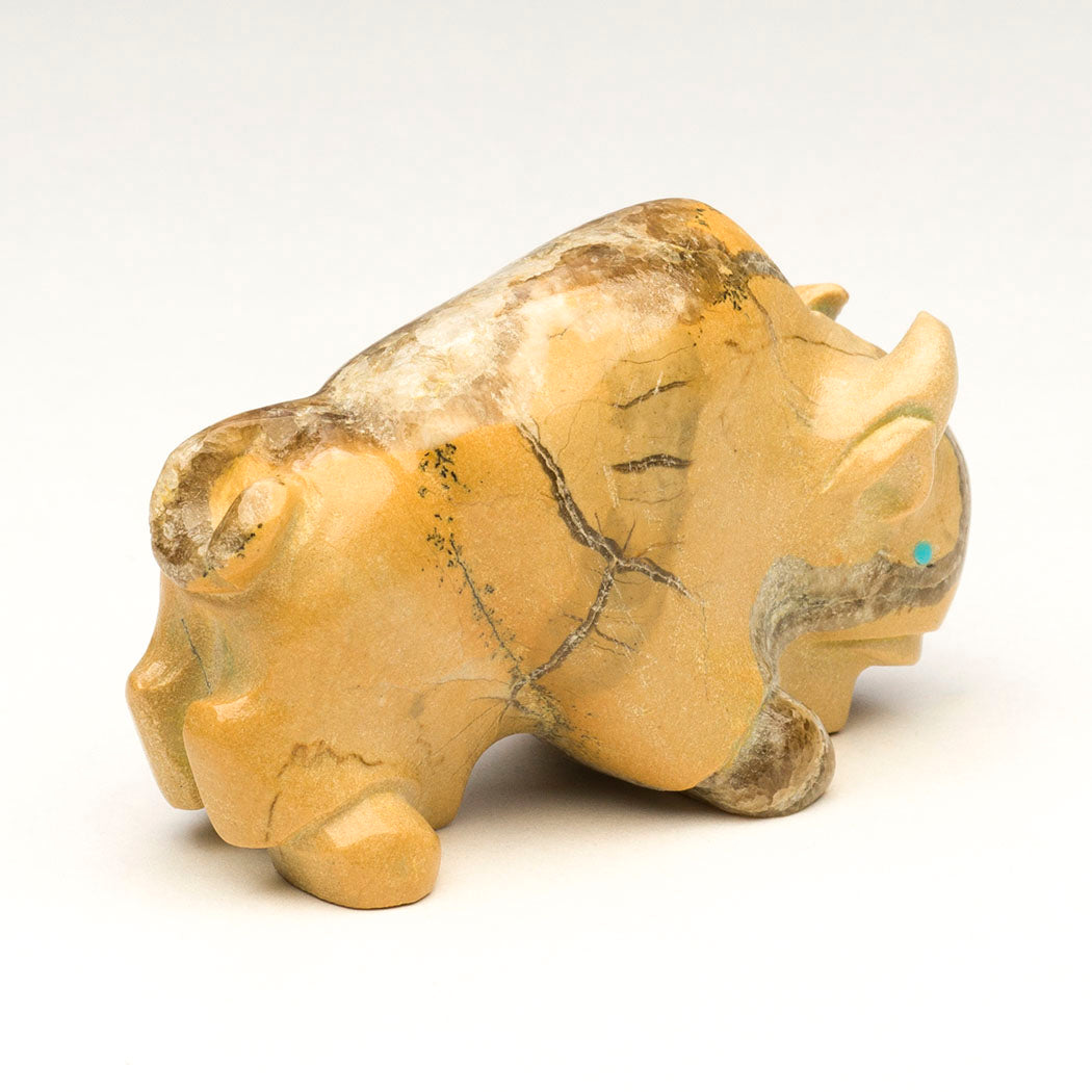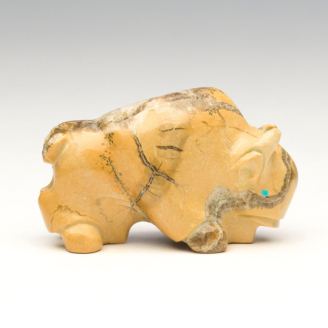 A local Zuni travertine Bison is sculpted by Vince Chavez. We love the gorgeous crystalline inclusions throughout the indigenous stone especially the section on the bison's back and whipped up tail. Bison give generously providing physical and spiritual nourishment for Indigenous Peoples. Their sacred presence summons snowfall and brings prosperity to all. Powerful horns and turquoise inlaid eyes adorn this approximately 2 3/8" long, 1" wide and 1 3/8" tall bovine.