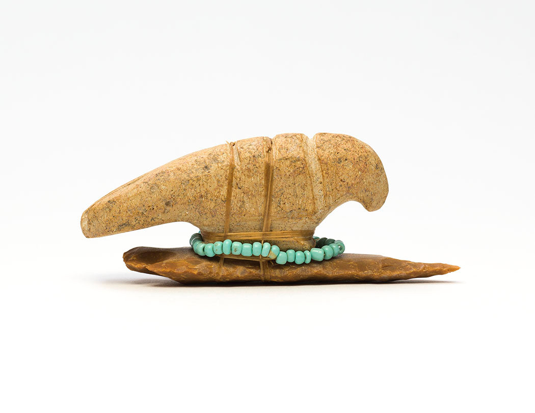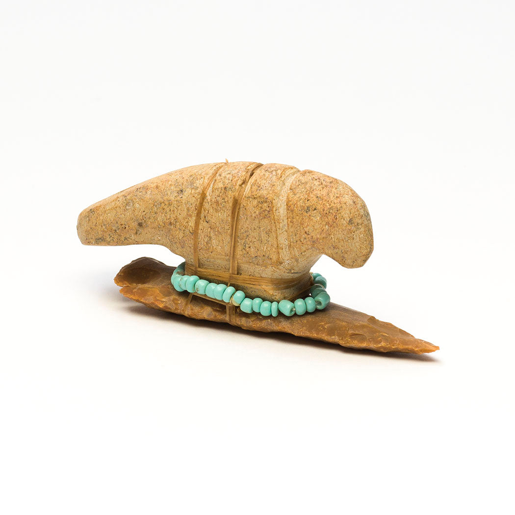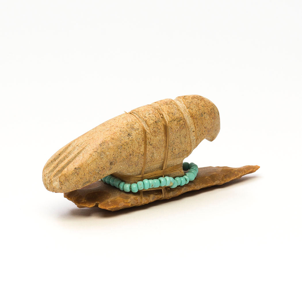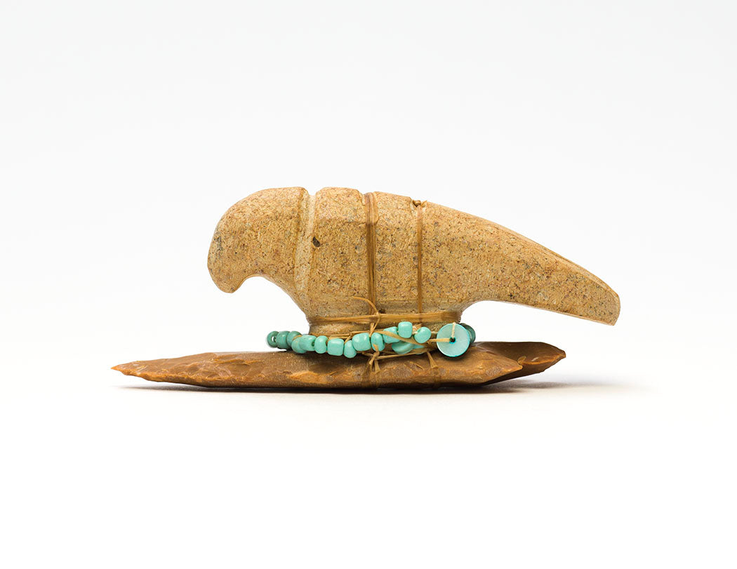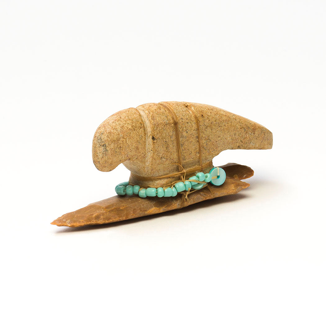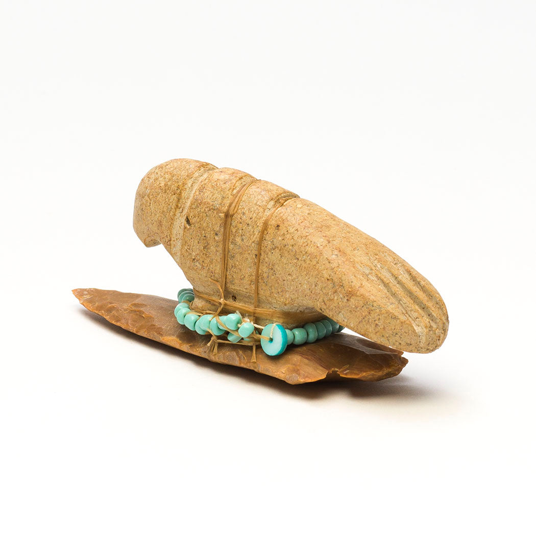 An old-style Hawk (or Eagle) summons a sense of deep connection to the cosmos, ancestors and the natural forces of Mother Earth. Essentially carved from found stone originating from the sacred lands at Cochiti Pueblo, the raptor with incised tails feathers rests on an oversized chert arrow point adorned with a scrumptious strand of seafoam green-hued turquoise beads. Artist Salvador Romero says "The stone has the animal in it. I just find it." About 4 7/8" long, 1 3/8" wide and 2" tall.