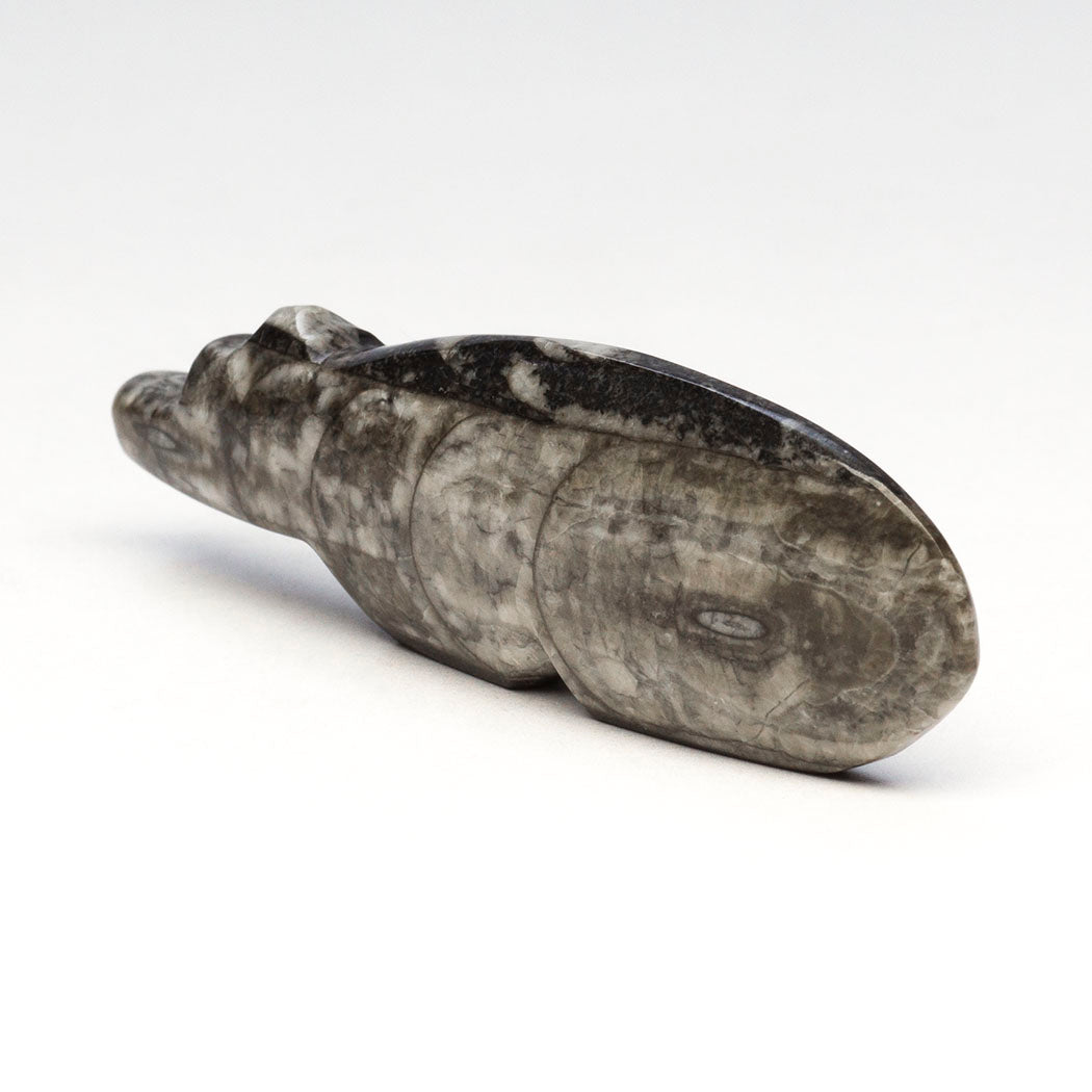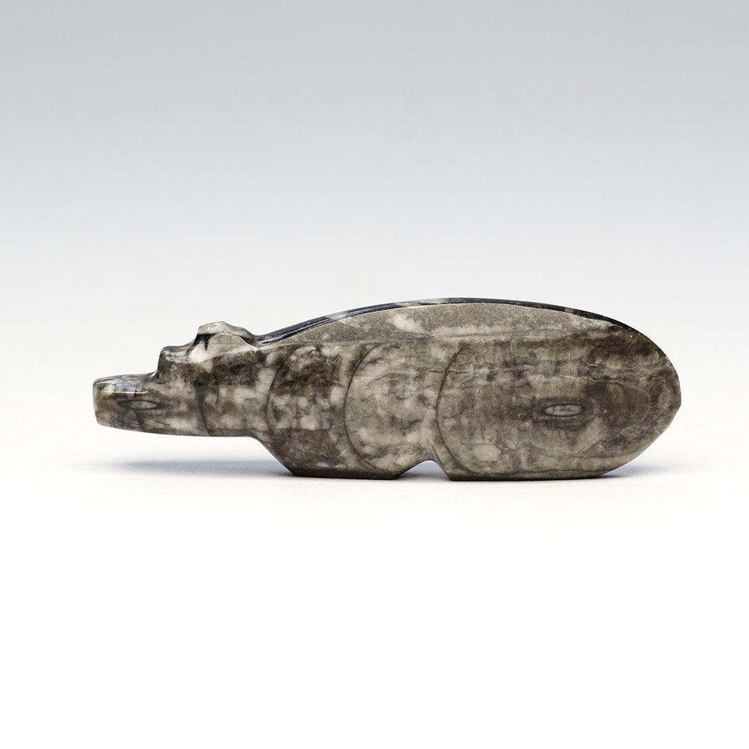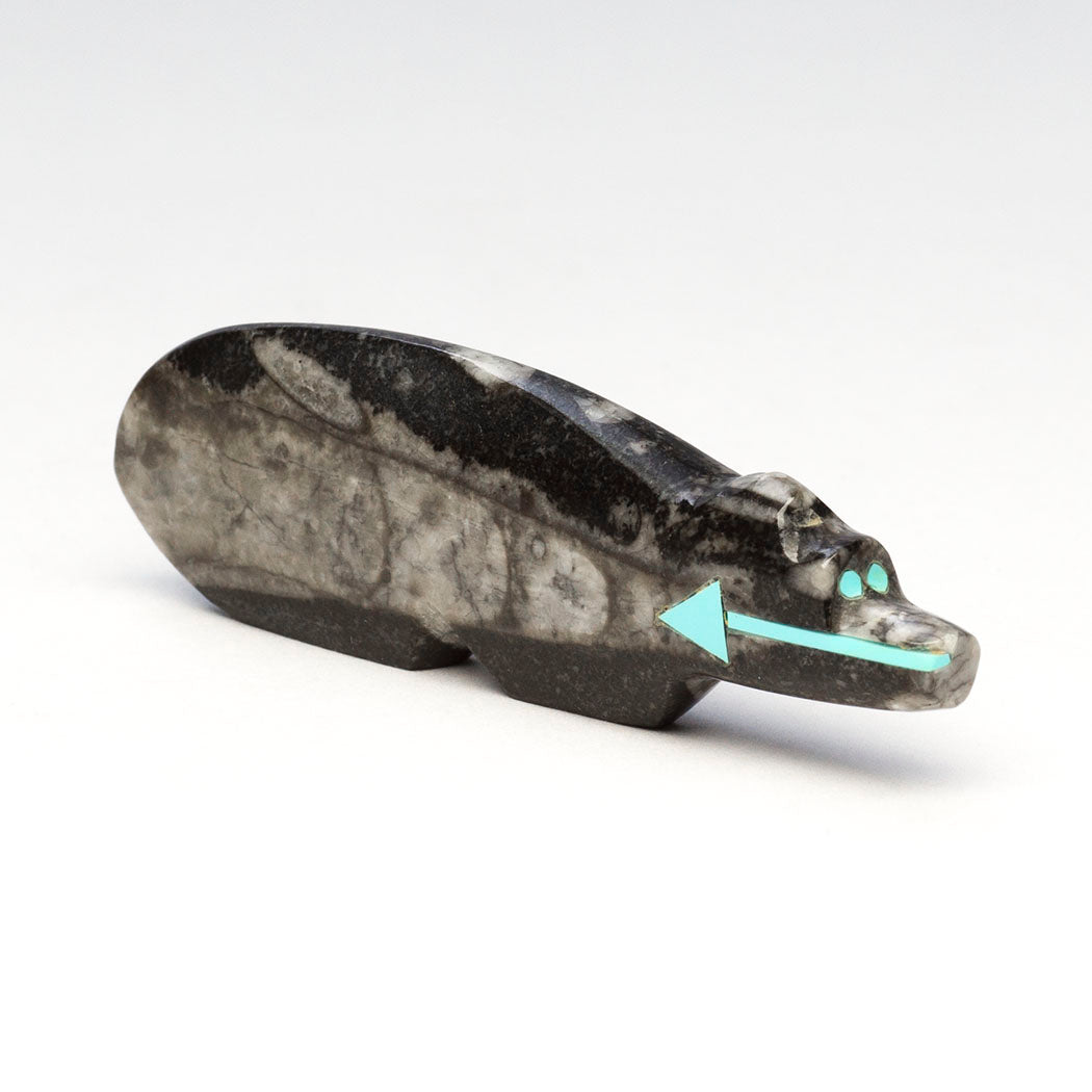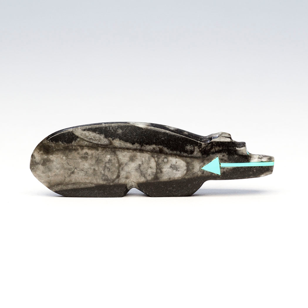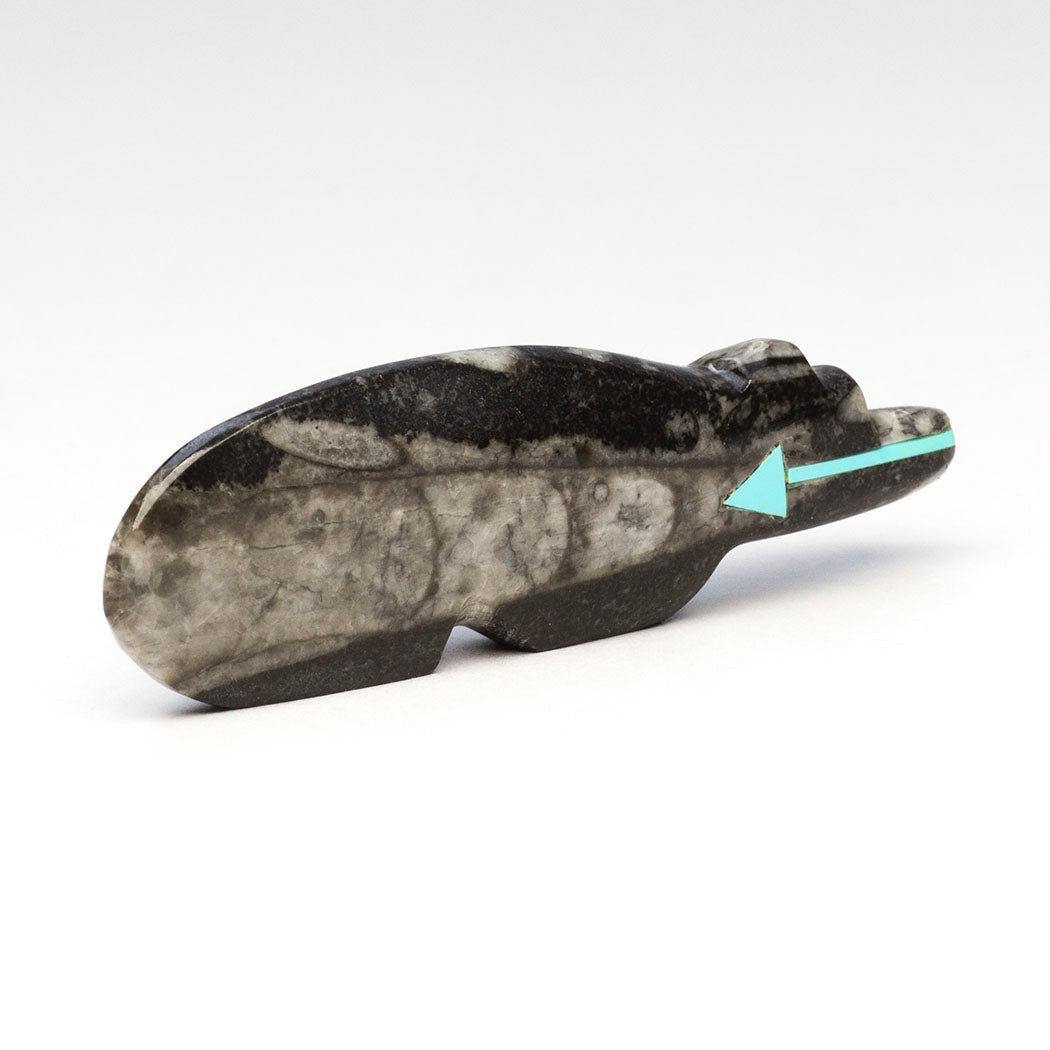 Orthoceras mollusks lived in ancient Ordovician oceans millions of years ago. Their aragonite shells fossilized into a white-like calcite, which now is an attractive contrast to the dark limestone they hardened in. Bernard Laiwakete's wonderful Bear has been carved from a fascinating orthoceras to a dimension of about 2 7/8" long, 3/8" wide and 7/8" tall. A heartline or breath path and eyes are from turquoise inlays.