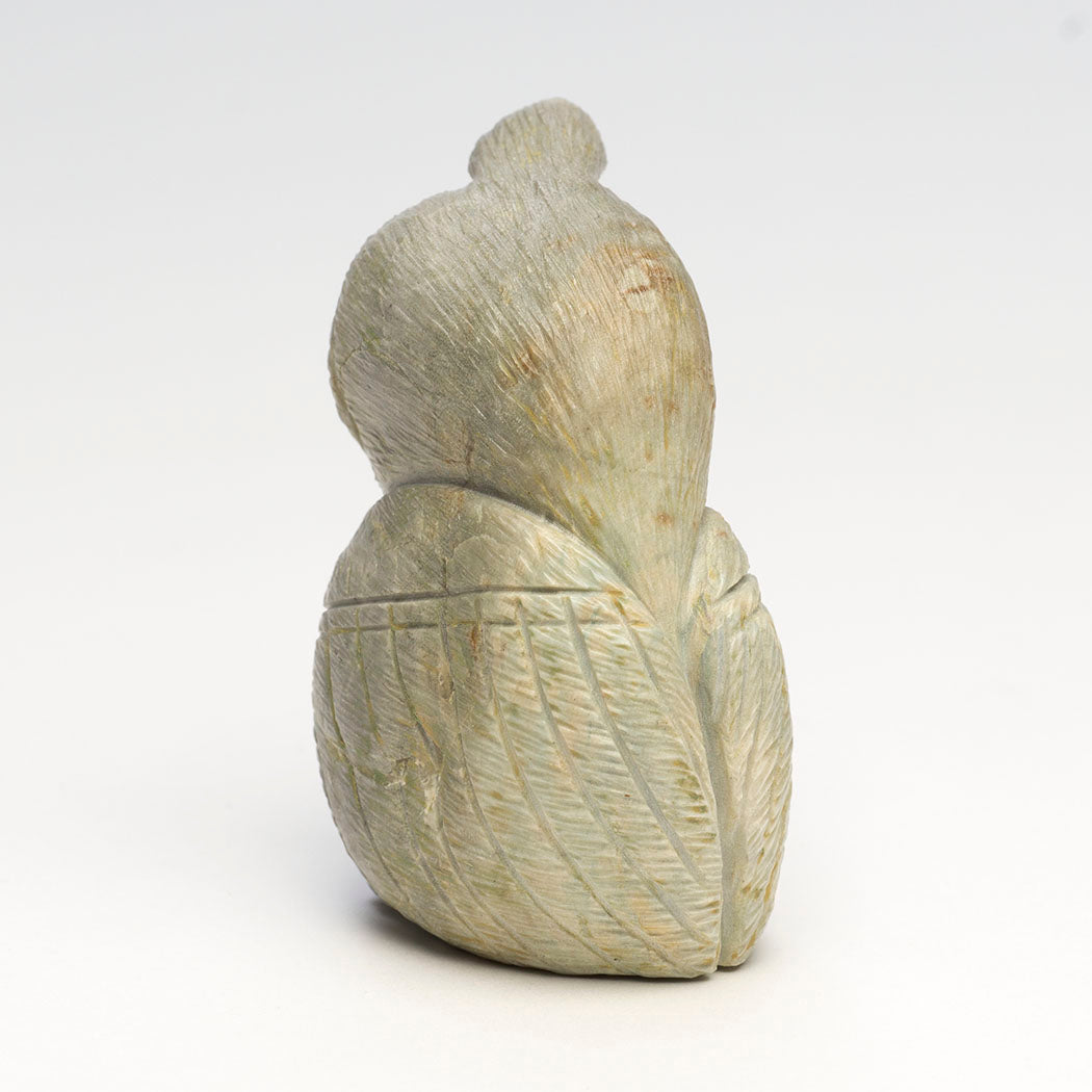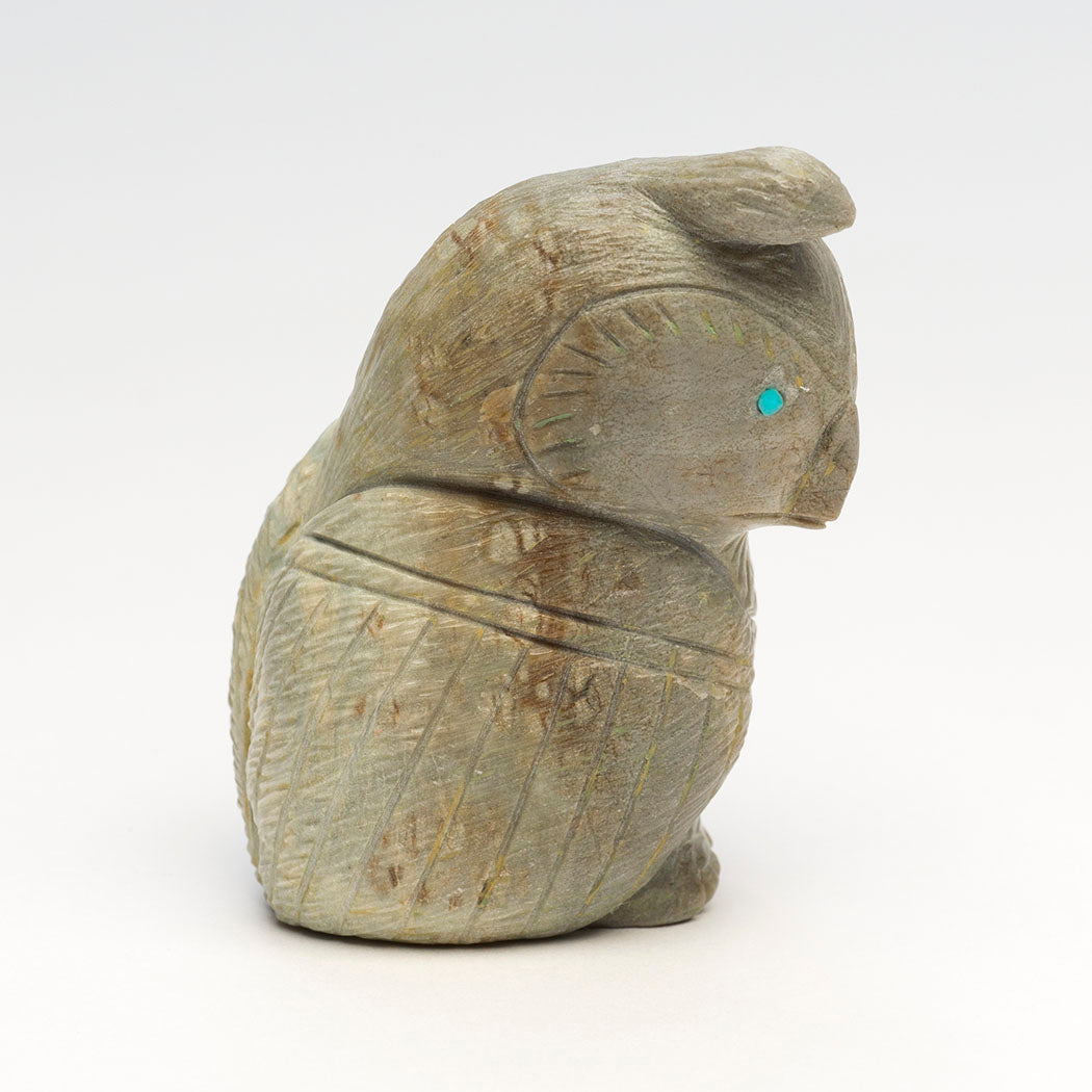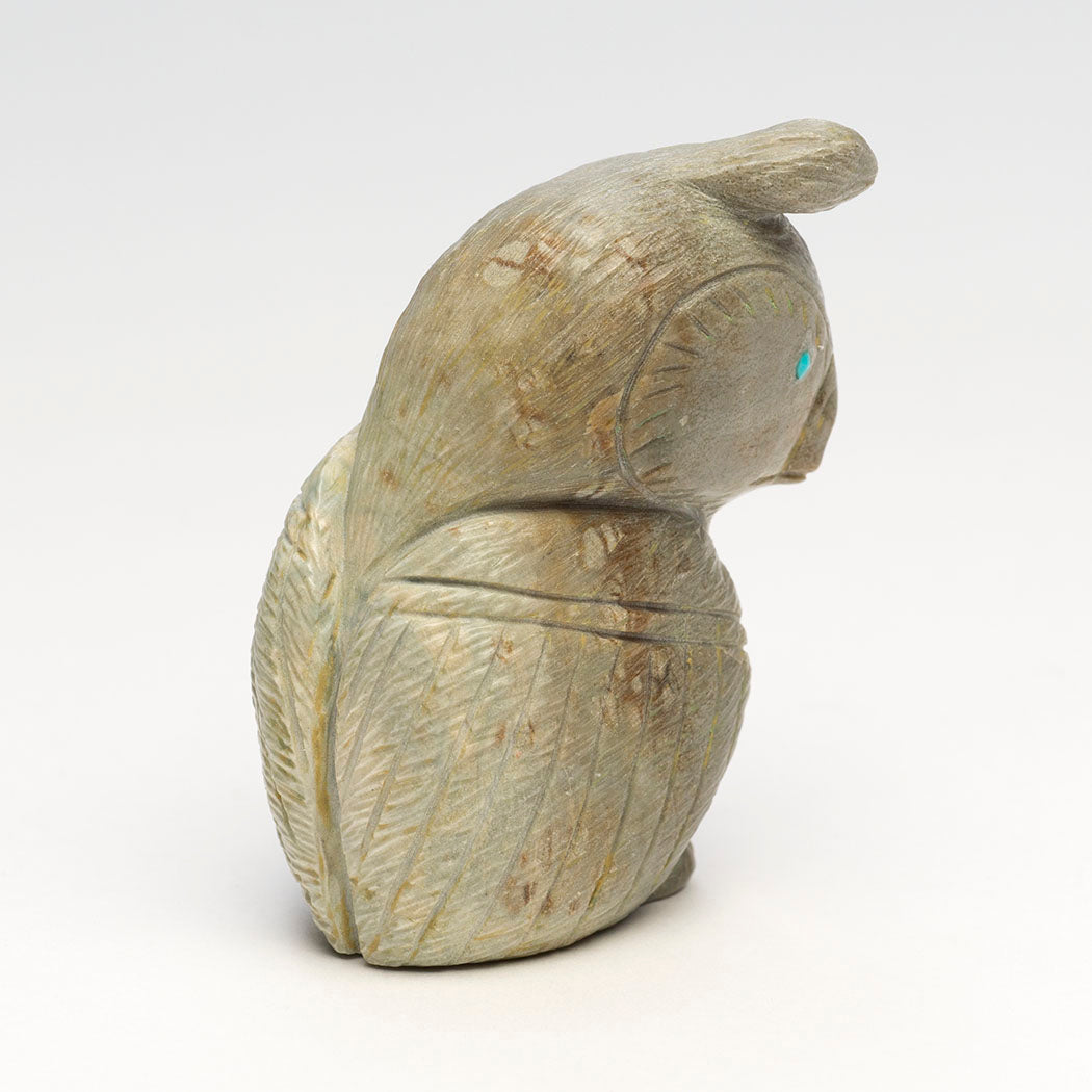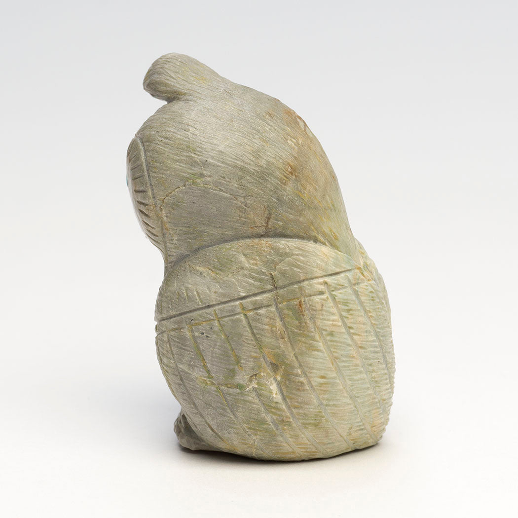 Now that summer's grasshoppers have gone to sleep, Jonas Hustito's foraging scaled quail will peck at autumn's insects like ants and beetles. Native plants and forbs are also on the menu for this approximately 1 3/4" long, 1 1/4" wide and 2 1/2" tall top-knot friend sculpted from Picasso marble. Focused eyes are from sky blue turquoise inlays and an assortment of clean incising marks result in lovely plumage.