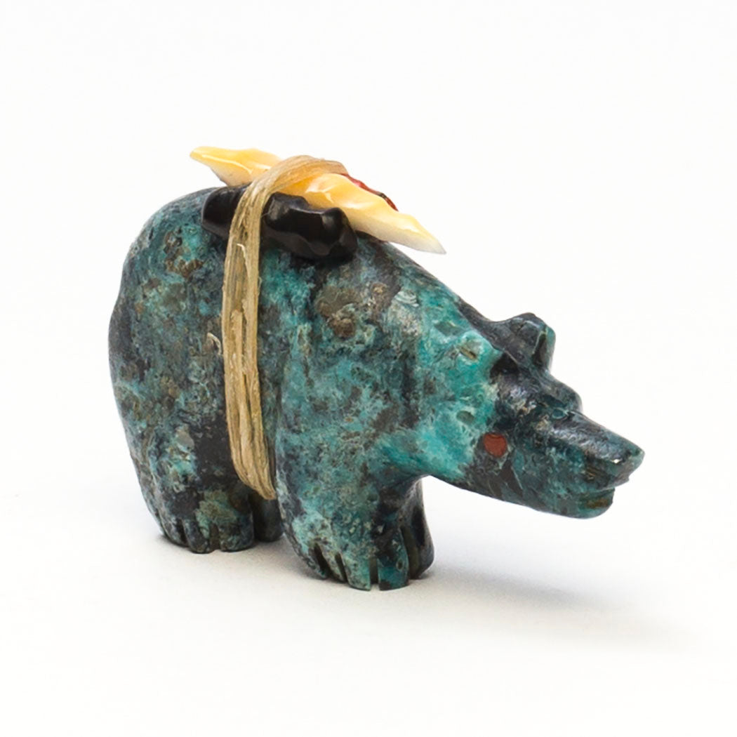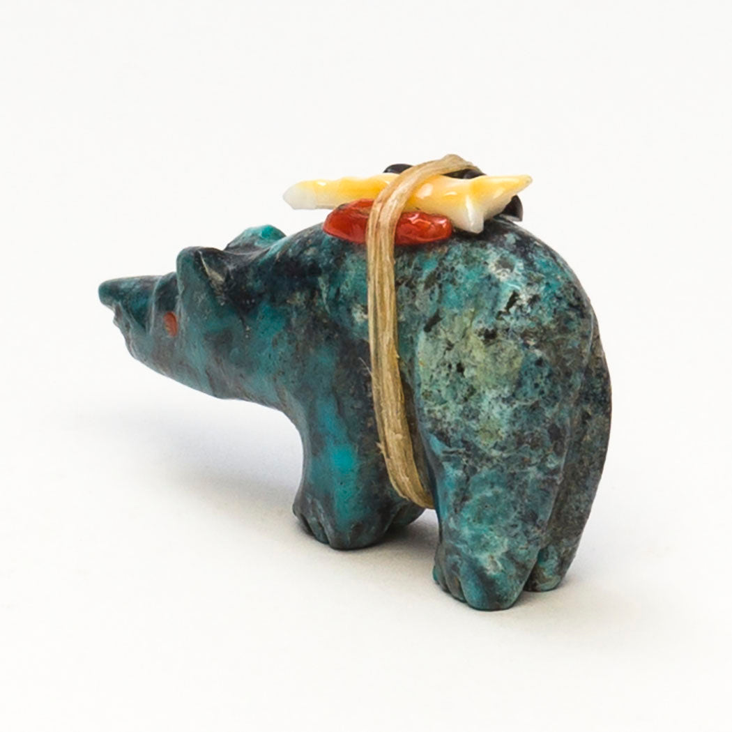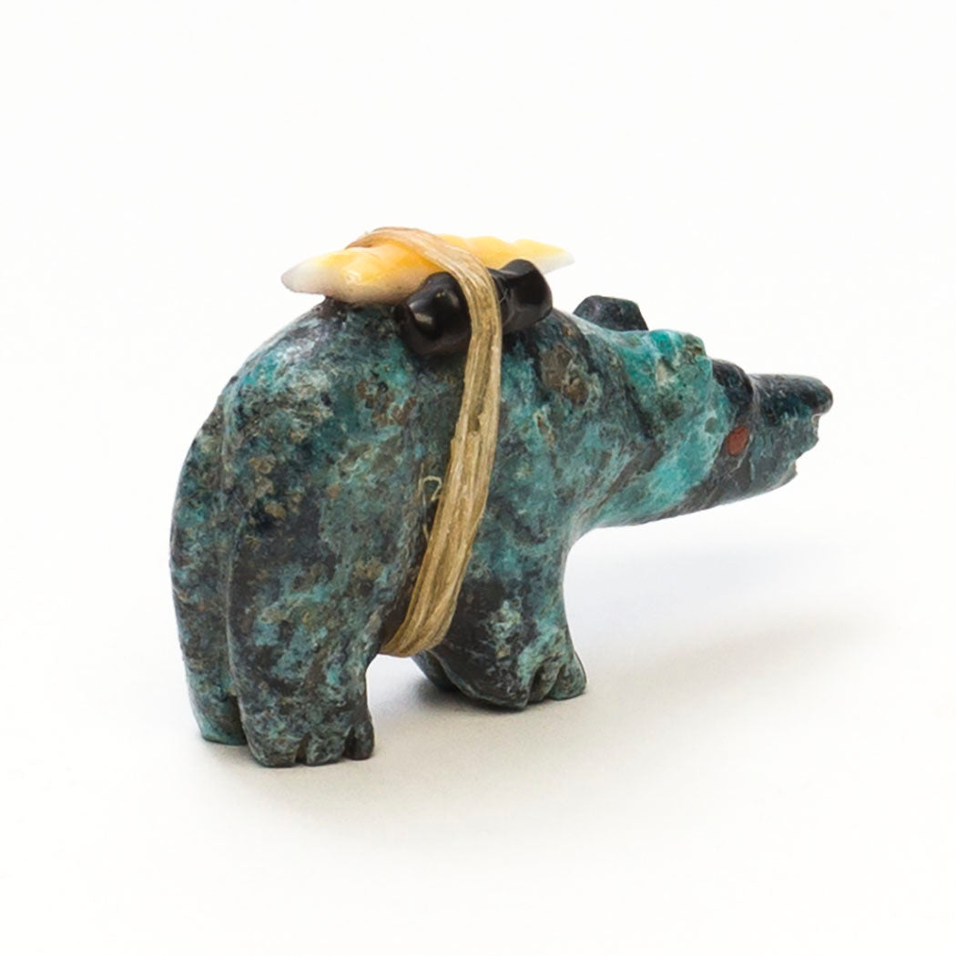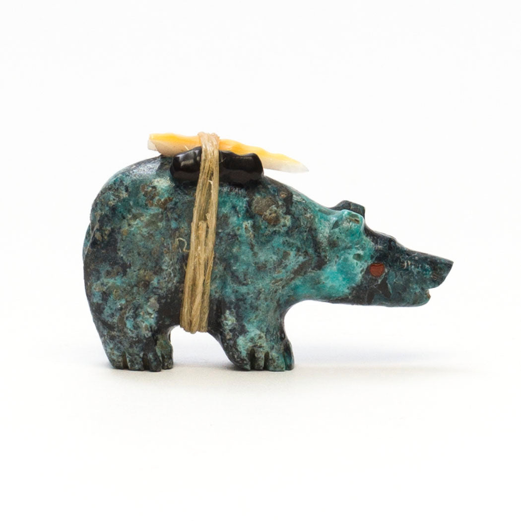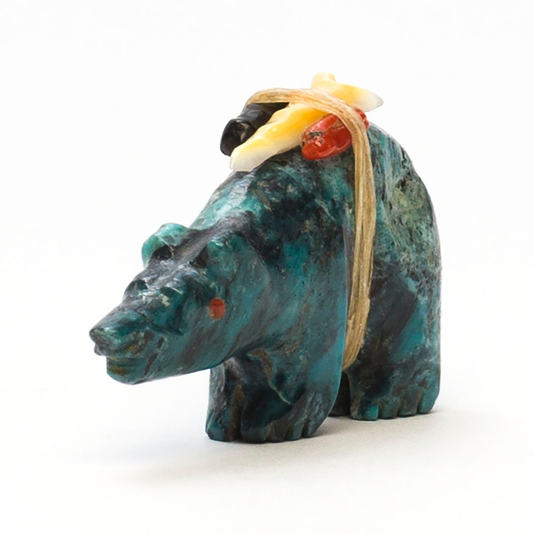 Bears are revered by the A:Shiwi (The People) because they are stronger, faster and have powers that humans do not. By respecting and honoring these qualities, we can find them in ourselves. Allow the late Andres Quandelacy's gorgeous turquoise bear serve as a reminder of these life-changing natural traits. Endearing eyes are from red coral while an offering bundle has an iridescent gold lip mother-of-pearl shell point flanked by jet and red coral. About 1 7/8" long, 1/2" wide and 1 1/4" tall.