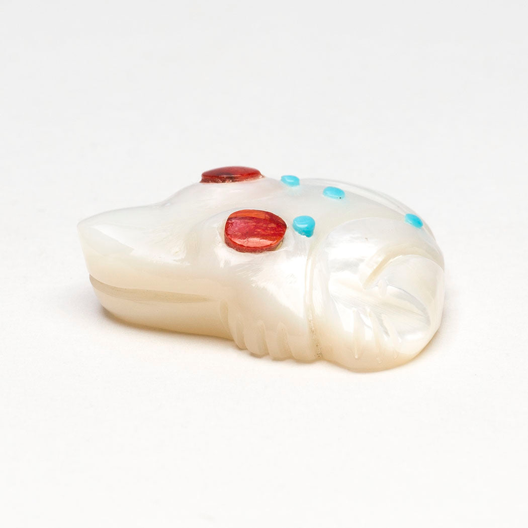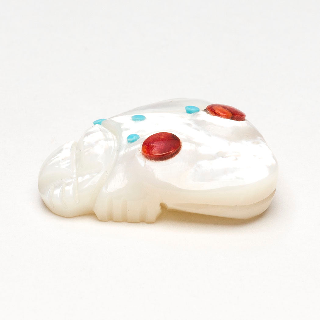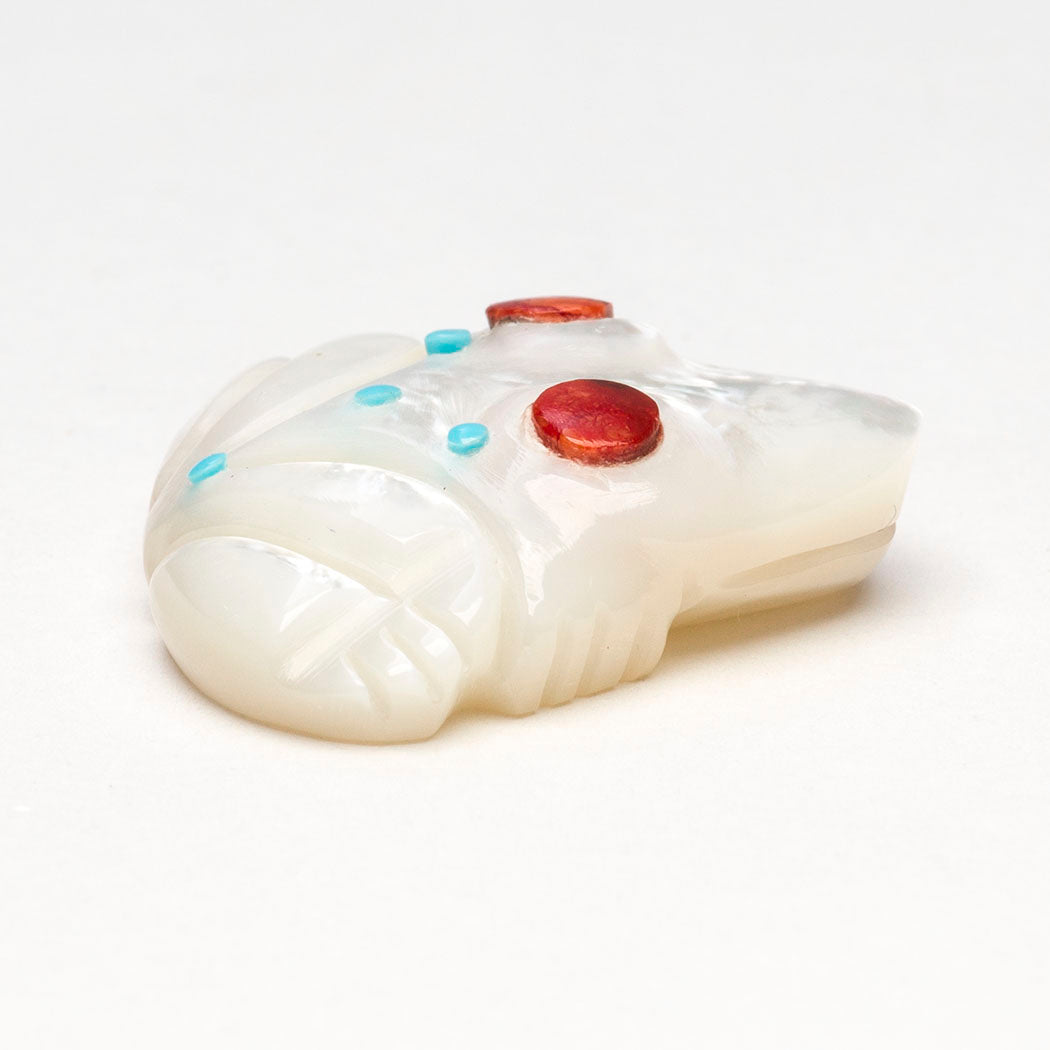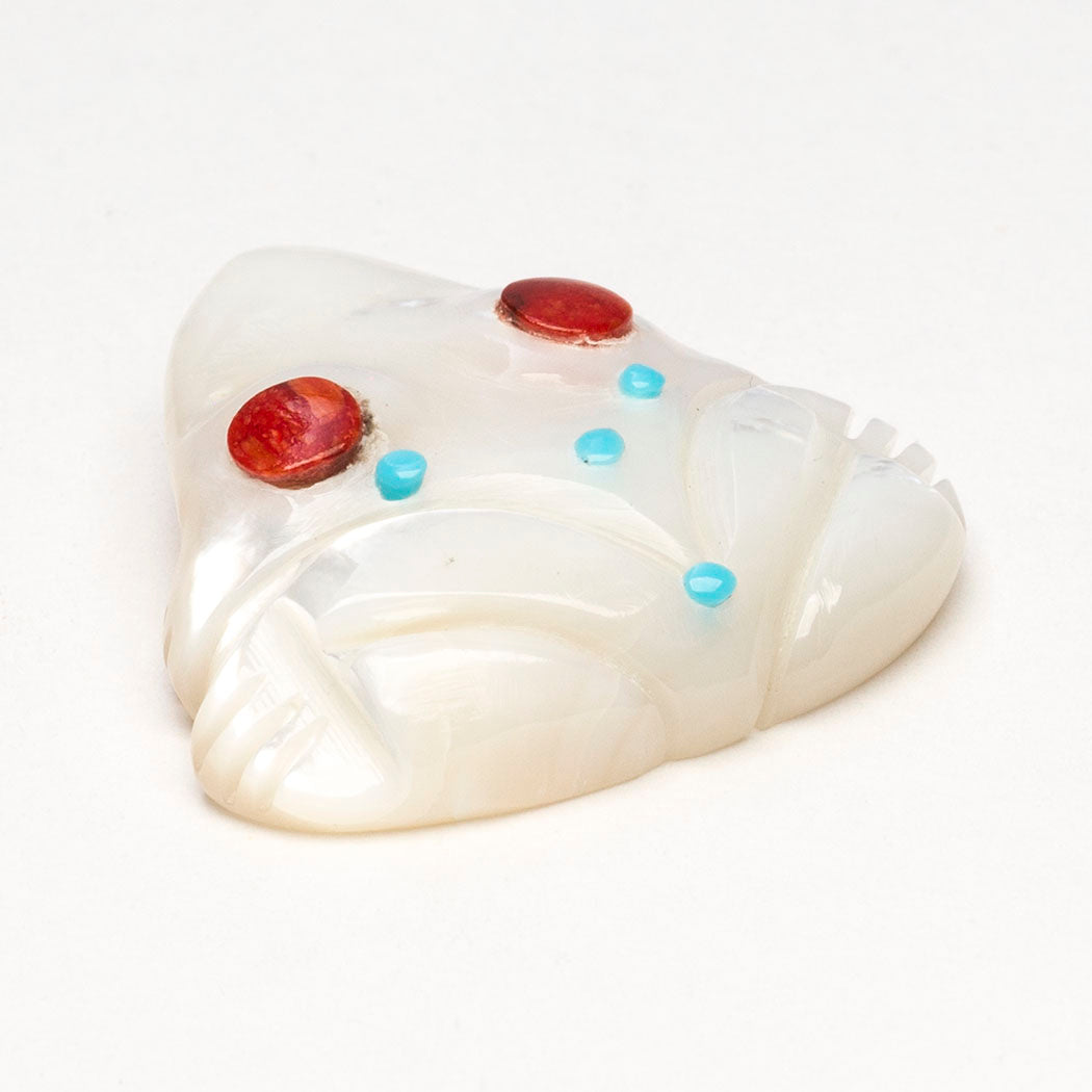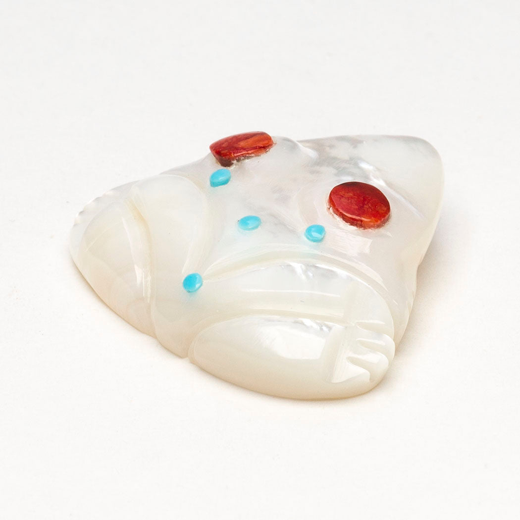 In 1985 Zuni artists Georgette Quam Lunasee and Reynold Lunasee started carving together. Her first carving was a Frog while his was a Bear. Over forty years later, they're still creating wonderful animal carvings together. Georgette sculpts the frogs and does the inlay work while Reynold does the sanding and buffing. They've collaborated in the creation of an iridescent amphibian from mother-of-pearl adorned with sky-blue turquoise inlays. Large cute eyes are from bright apple coral inlays. About 1 1/8" long, 1 1/4" wide and 3/8" tall.