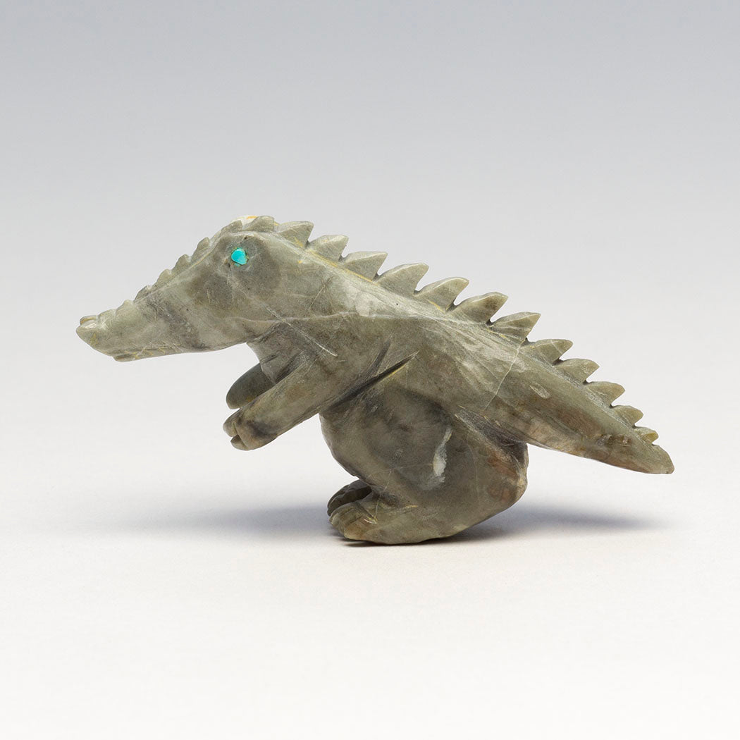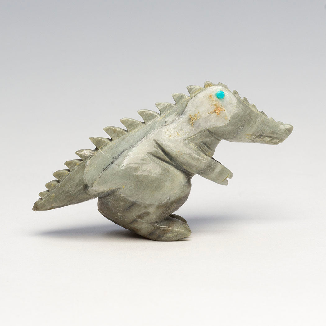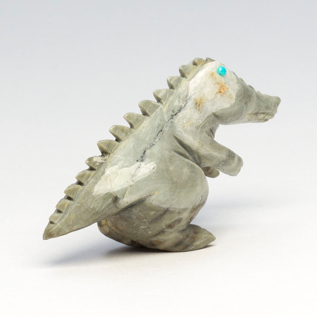 From a primordial world walks Jonas Hustito's whimsical dinosaur who sparks curiosity about what life was like before we existed. This precious reptile is sculpted from Picasso marble with wonderful spikes and turquoise inlaid eyes. It stands at about 2 3/4" long, 3/4" wide and 1 5/8" tall.