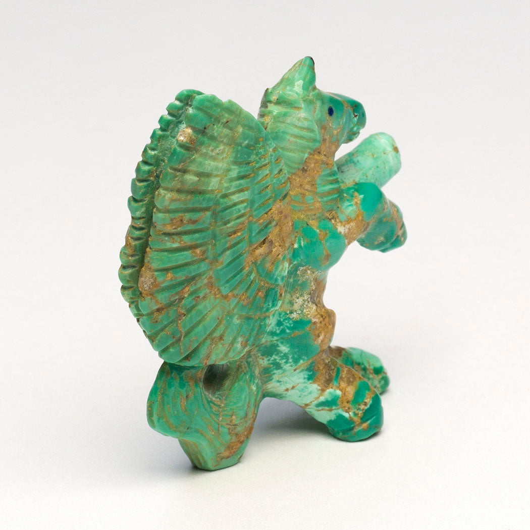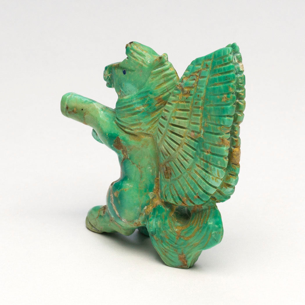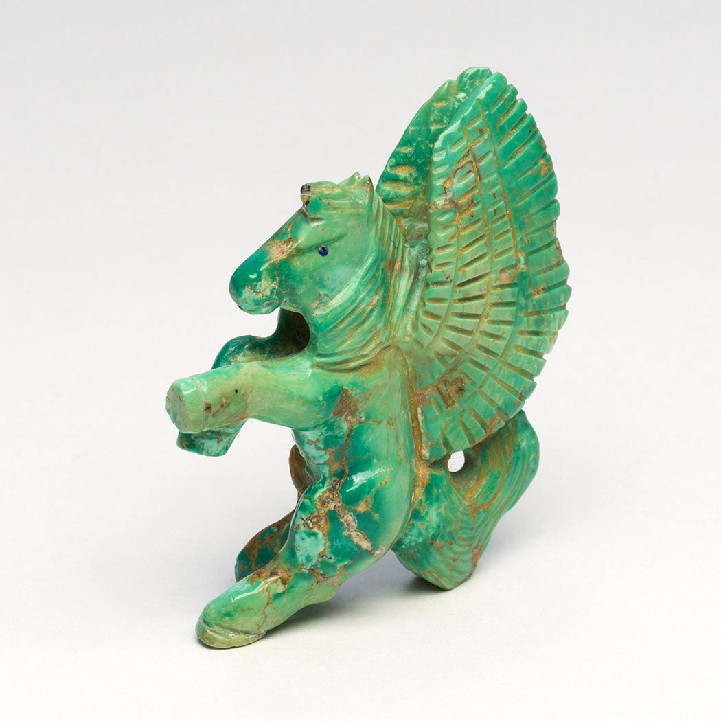 Pegasus is a mythical winged Horse of Greek mythology born of Poseidon and Medusa. It's been said that whenever Pegasus' hooves struck the Earth bountiful springs of water appeared which inspired many. Presented in a green turquoise with gorgeous golden matrix, Bryston Bowannie's pegasus with majestic wings and flowing tail measures about 2 1/8" tall, 5/8" wide and 1 3/4" deep. Vibrant lapis lazuli inlaid eyes express great energy. Please note the wonderful carving can only be positioned as shown.