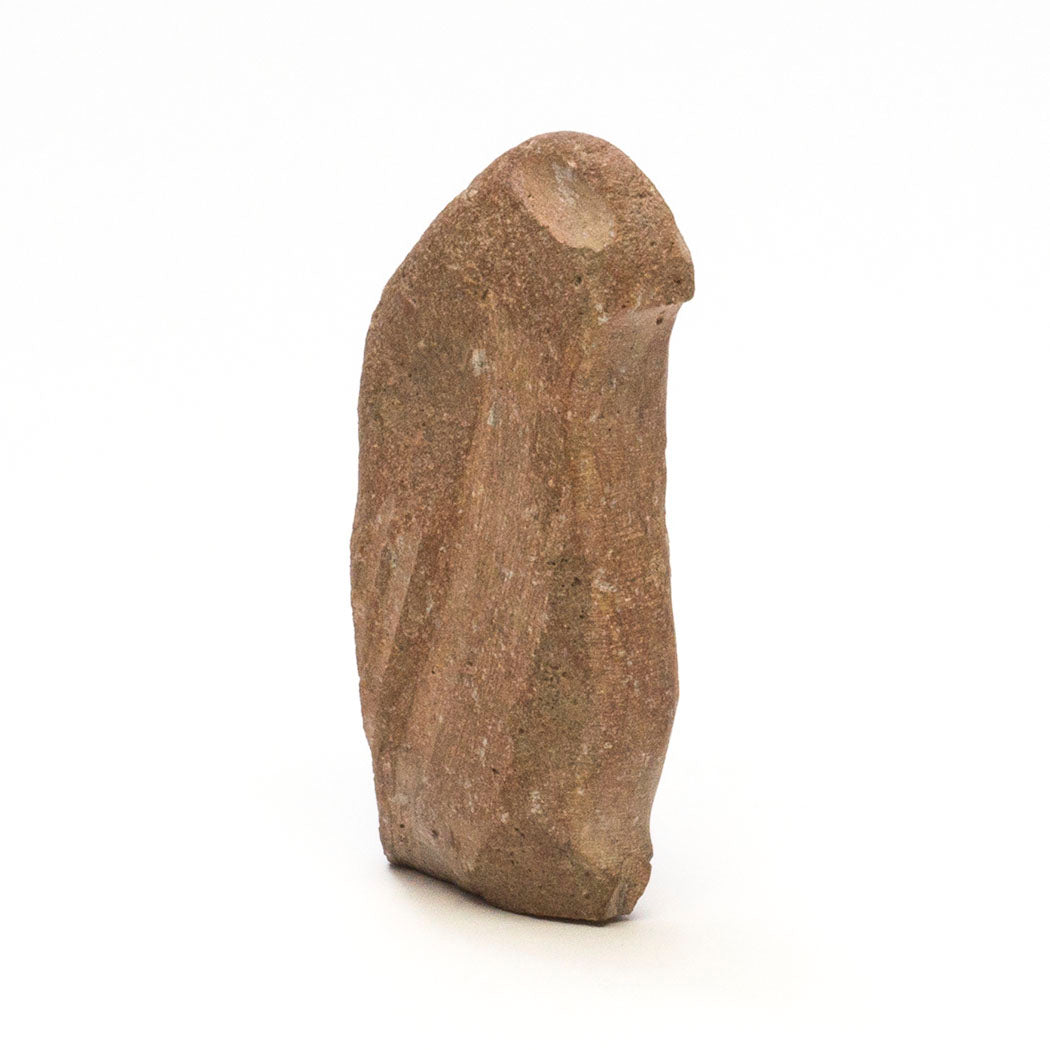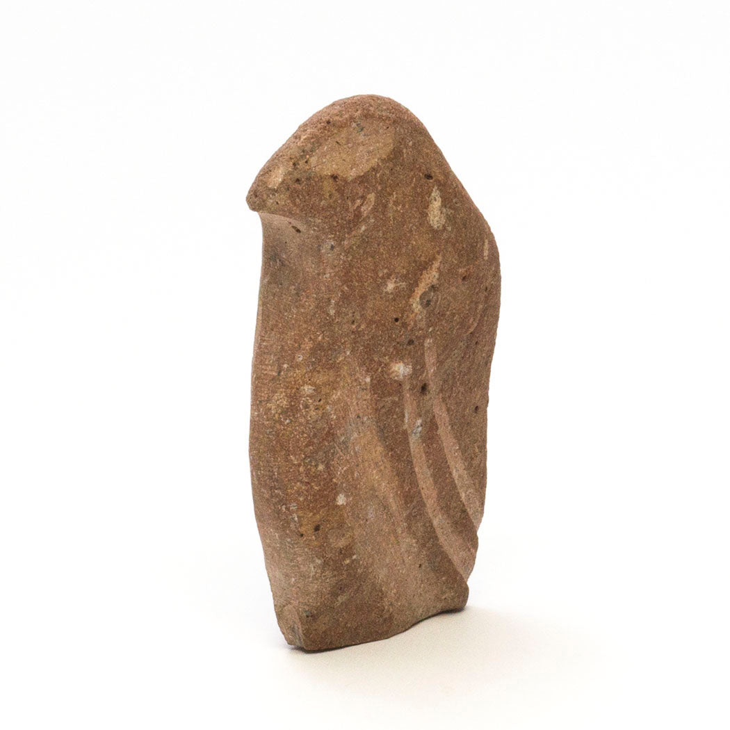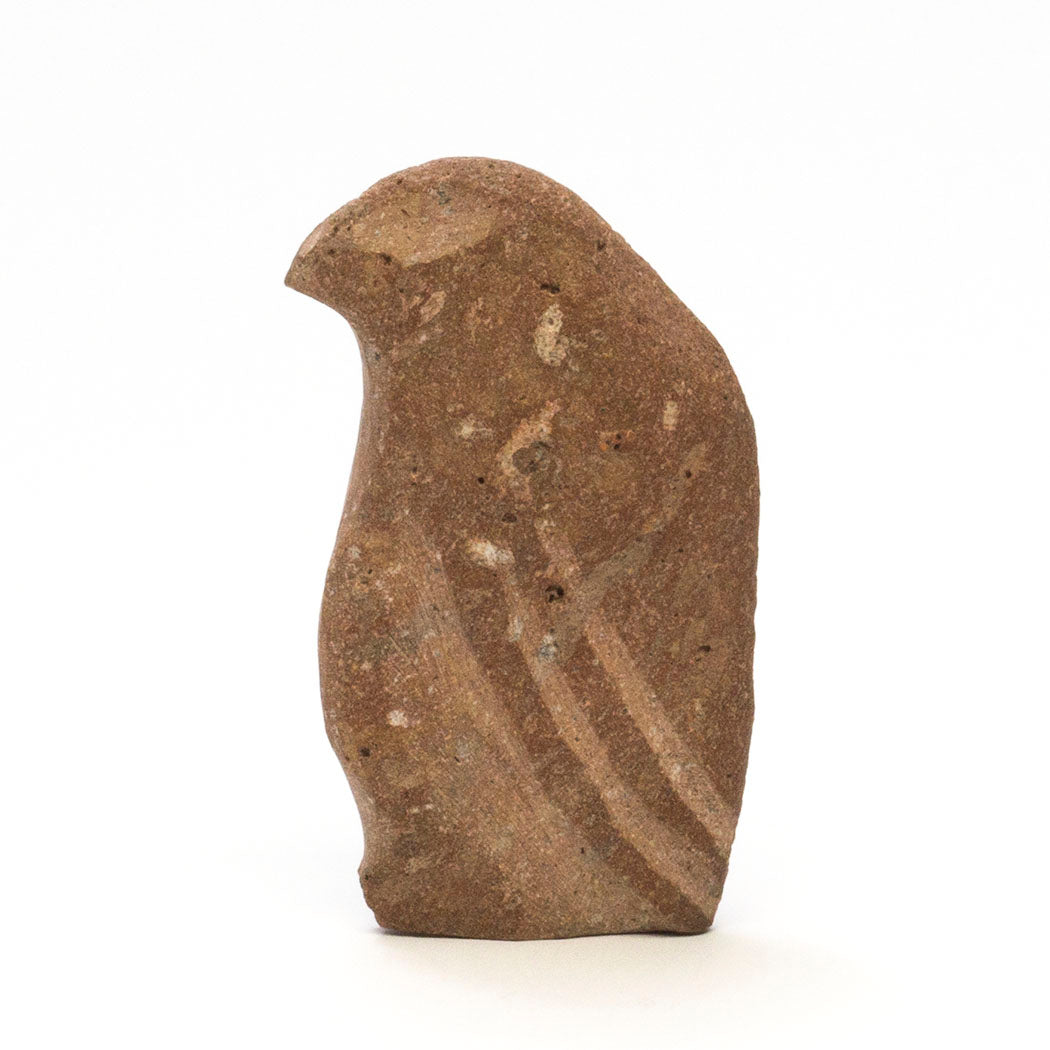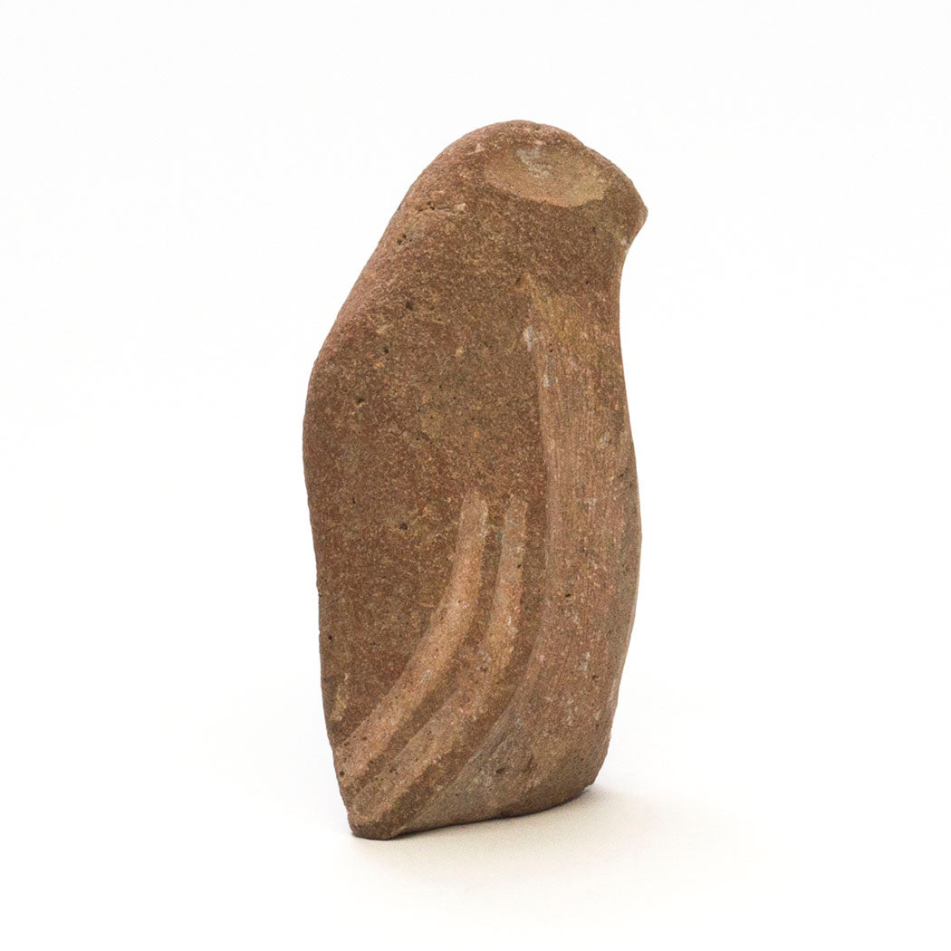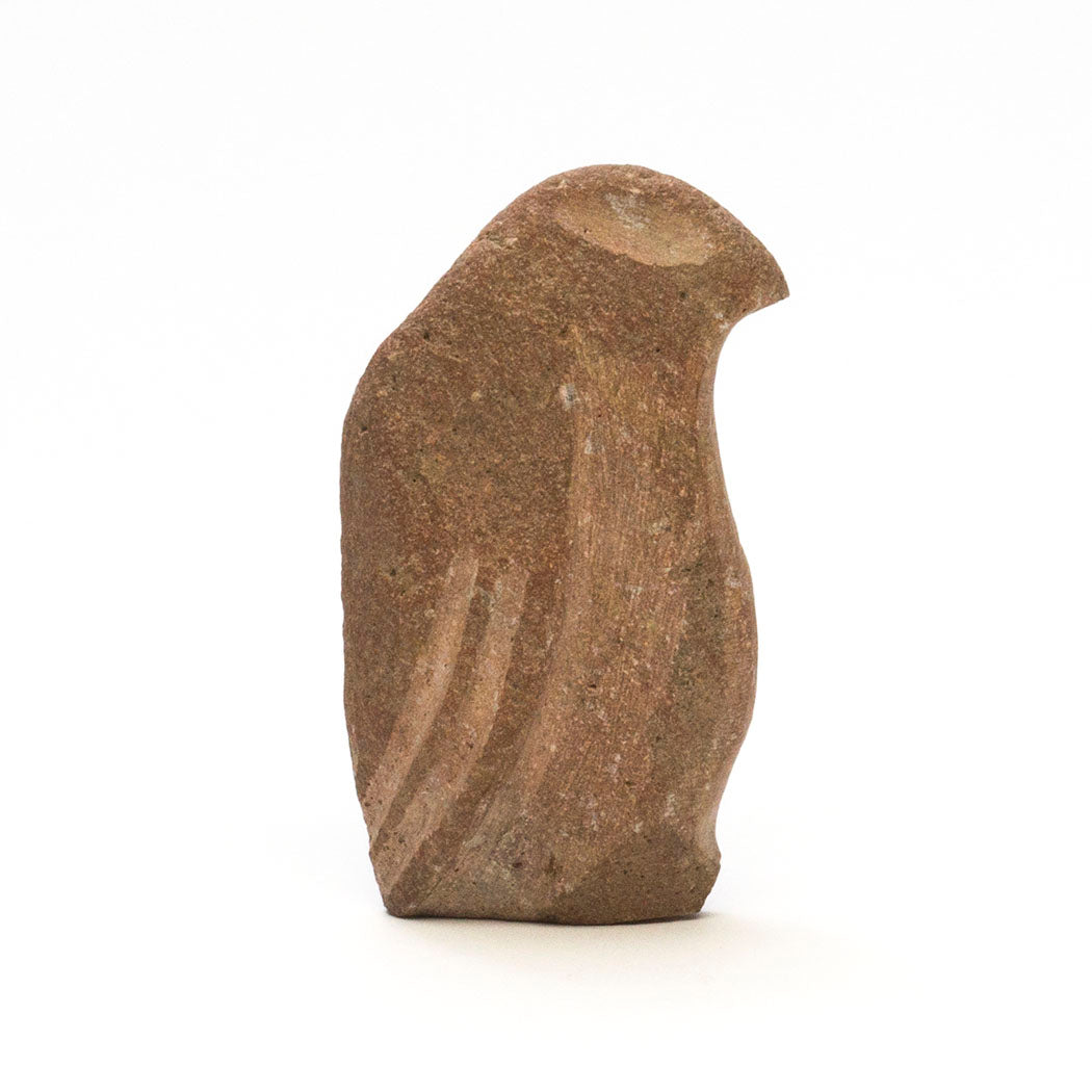 For some Pueblo cultures in New Mexico, the red-tailed hawk is known as a red Eagle. For the A:Shiwi (The People) a Hawk is considered to be the little brother to eagle. Red-tailed hawks have a unique coat of brownish feathers shaped like a V. They are monogamous, mating for life. Carved from found stone, Wilson Romero's minimal hawk is a beauty at approximately 4" tall, 3/4" wide and 2 1/4" from nose to tail. Large eyes signifying great vision and plumage are etched.