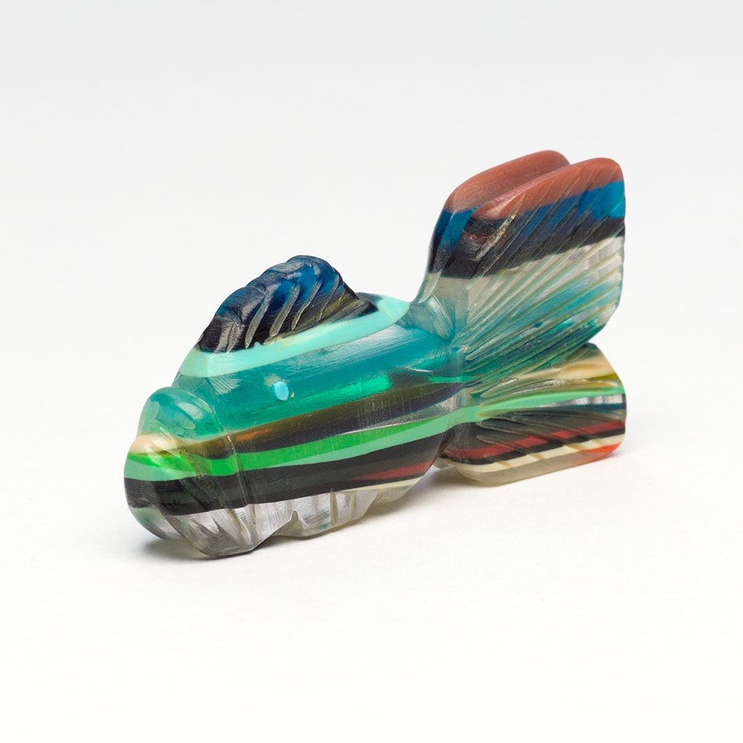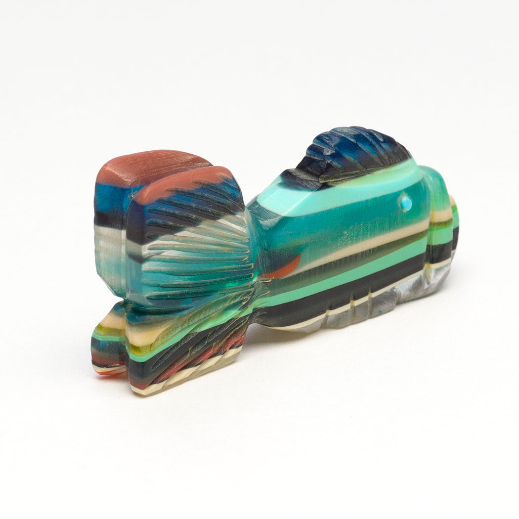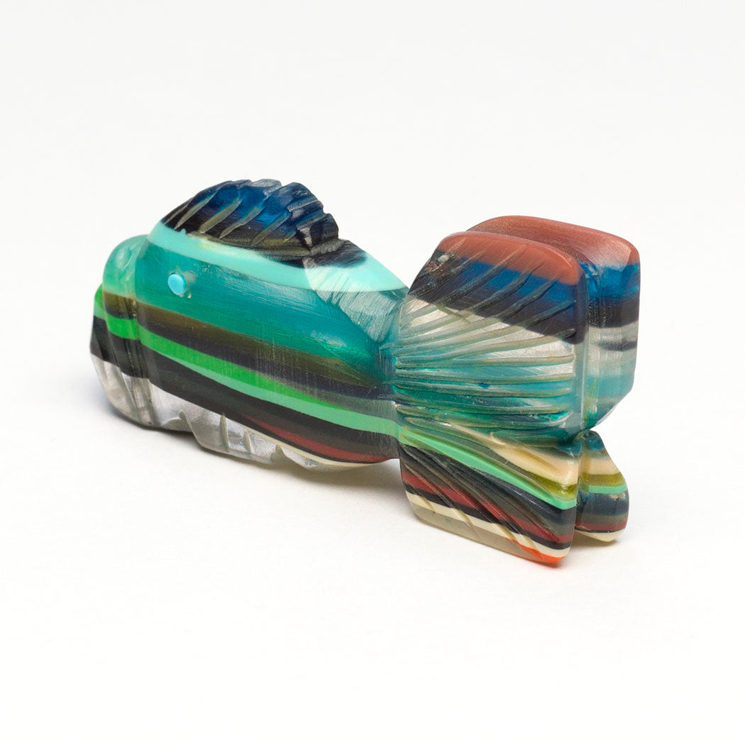 Indigenous Coastal tribes revere reefs as sacred breathing entities with life force residing within the corals that must be protected. Cody Chavez's fish friend has horizontally layered hues such as red, blue, black, turquoise, green and yellow within the upcycled surfite specimen. In nature, the colors and patterns help break up the fish's shape enabling perfect camouflage among the reef. Surfite is a by-product from surfboard manufacturing. Turquoise inlaid eyes are on the lookout for a mate in the enchanted underwater ecosystem. About 1 7/8" long, 1/4" wide and 7/8" tall.