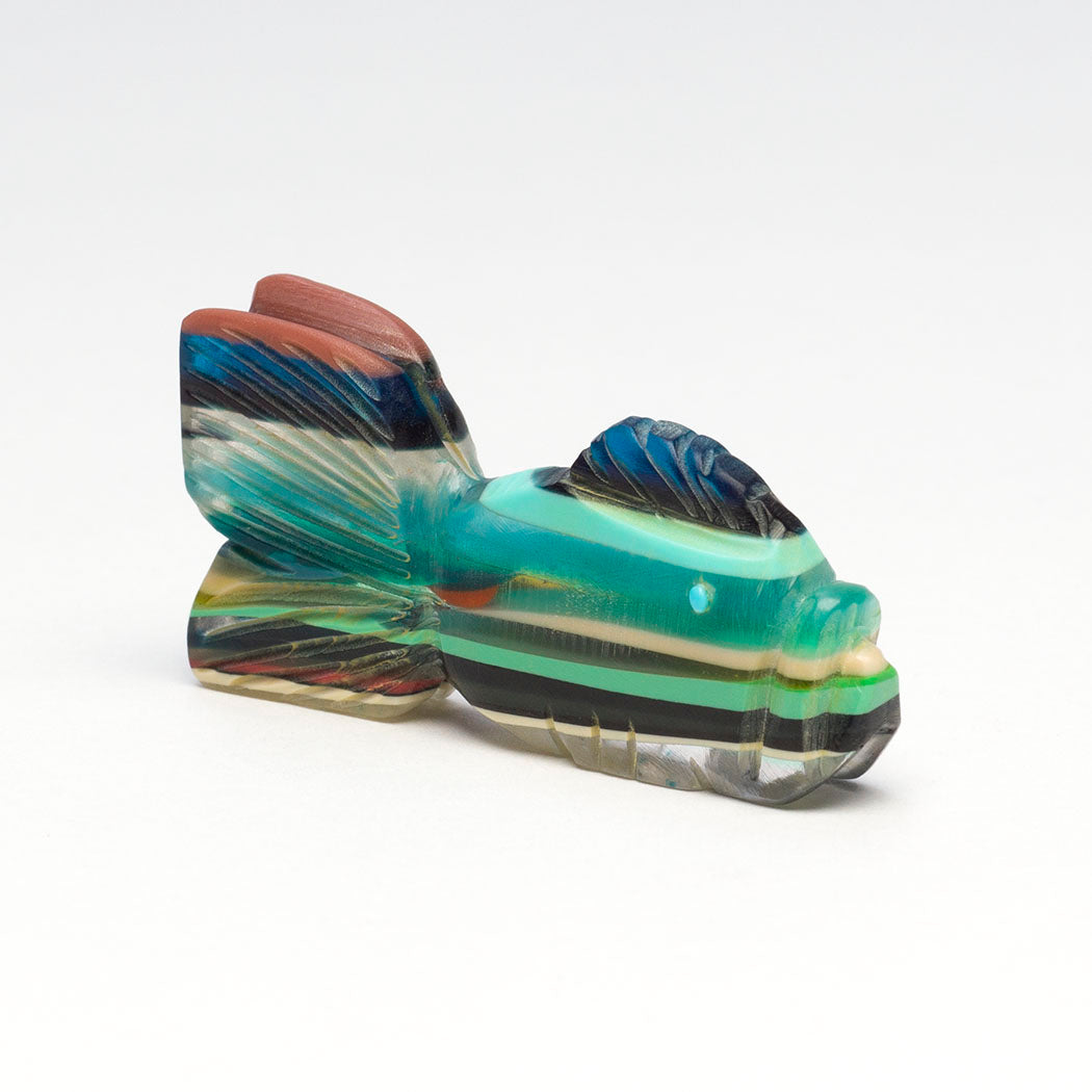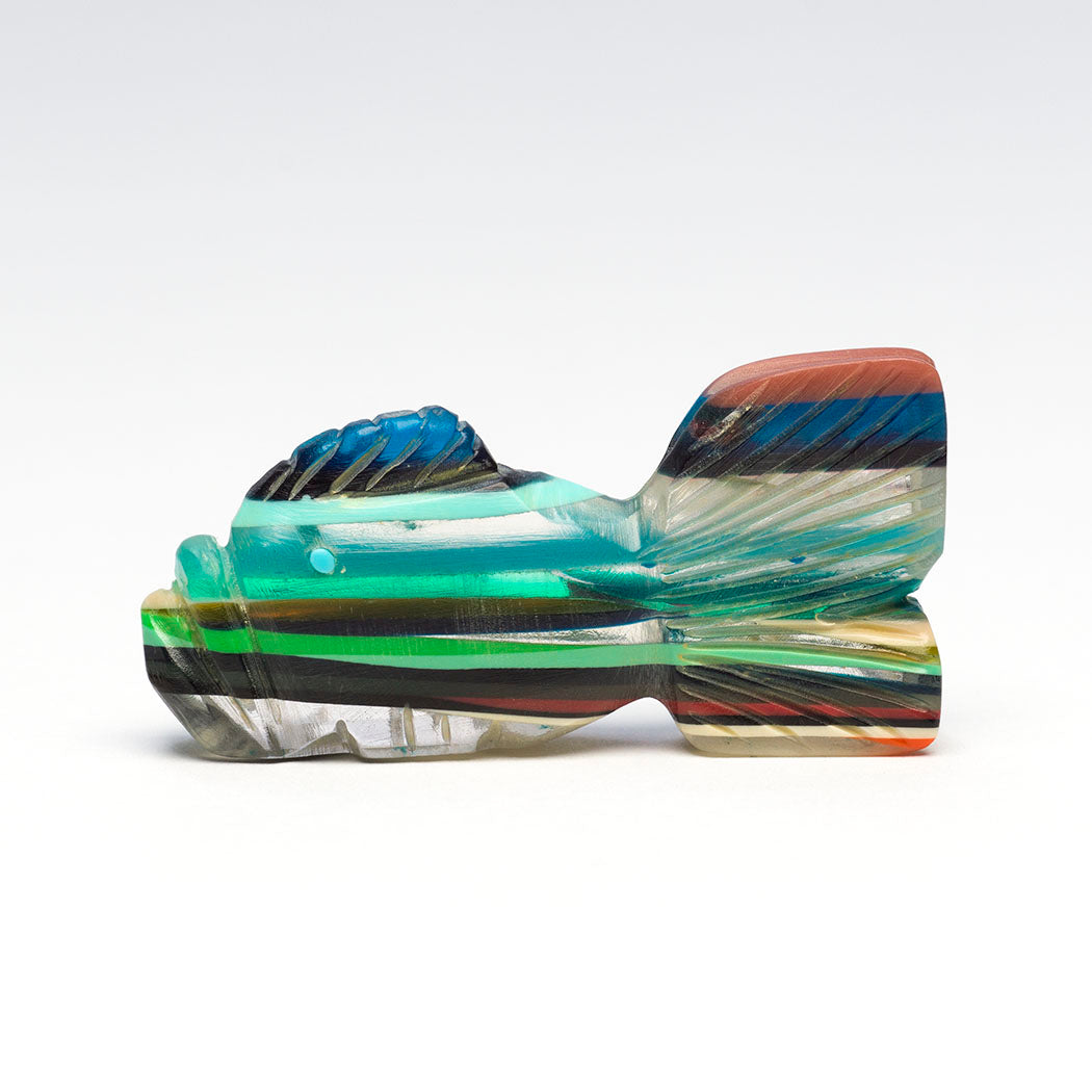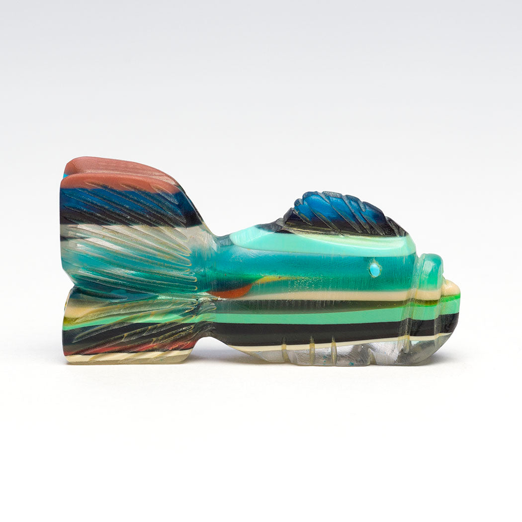 Indigenous Coastal tribes revere reefs as sacred breathing entities with life force residing within the corals that must be protected. Cody Chavez's fish friend has horizontally layered hues such as red, blue, black, turquoise, green and yellow within the upcycled surfite specimen. In nature, the colors and patterns help break up the fish's shape enabling perfect camouflage among the reef. Surfite is a by-product from surfboard manufacturing. Turquoise inlaid eyes are on the lookout for a mate in the enchanted underwater ecosystem. About 1 7/8" long, 1/4" wide and 7/8" tall.