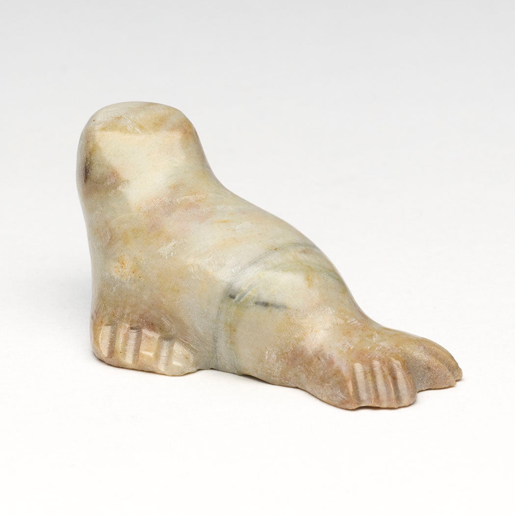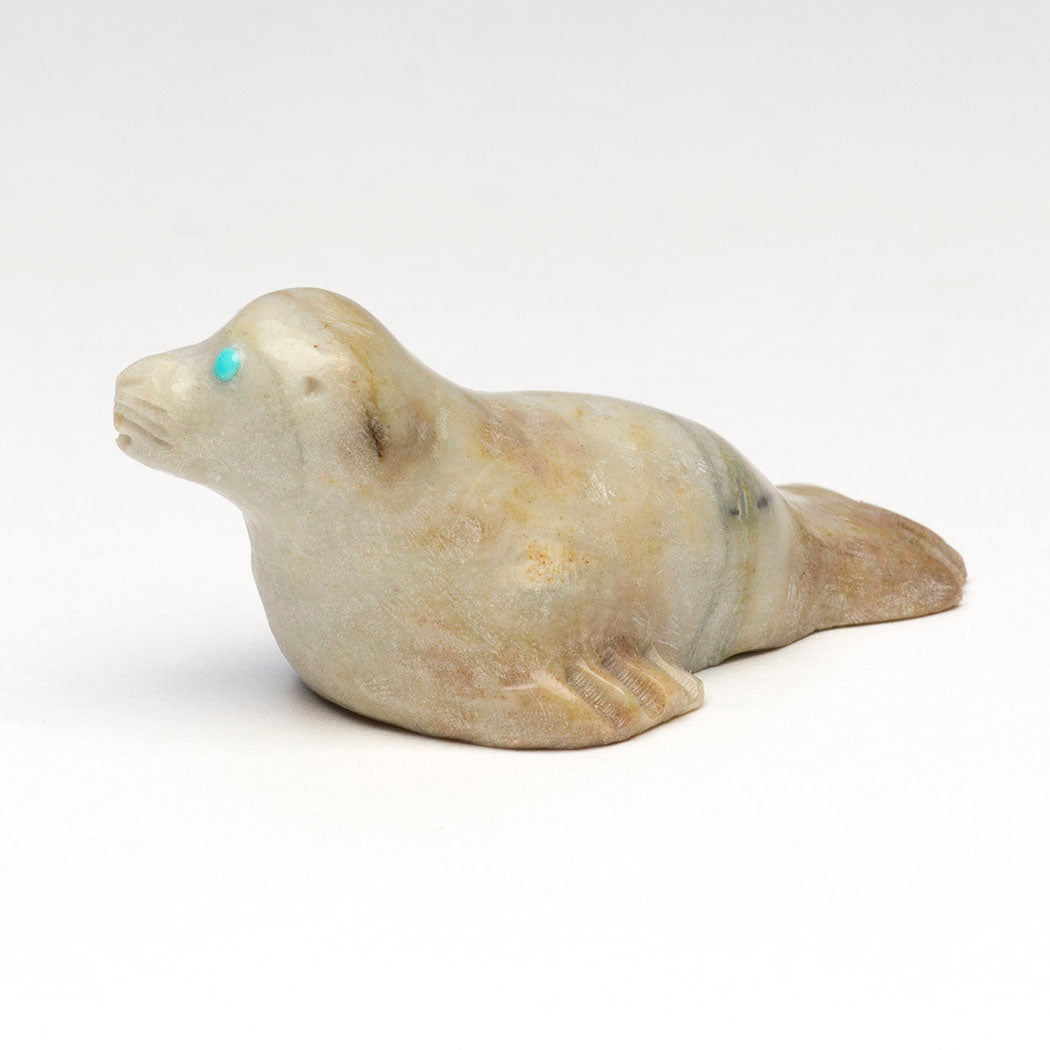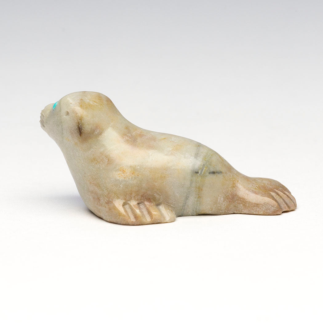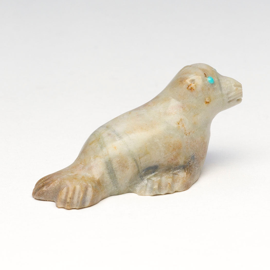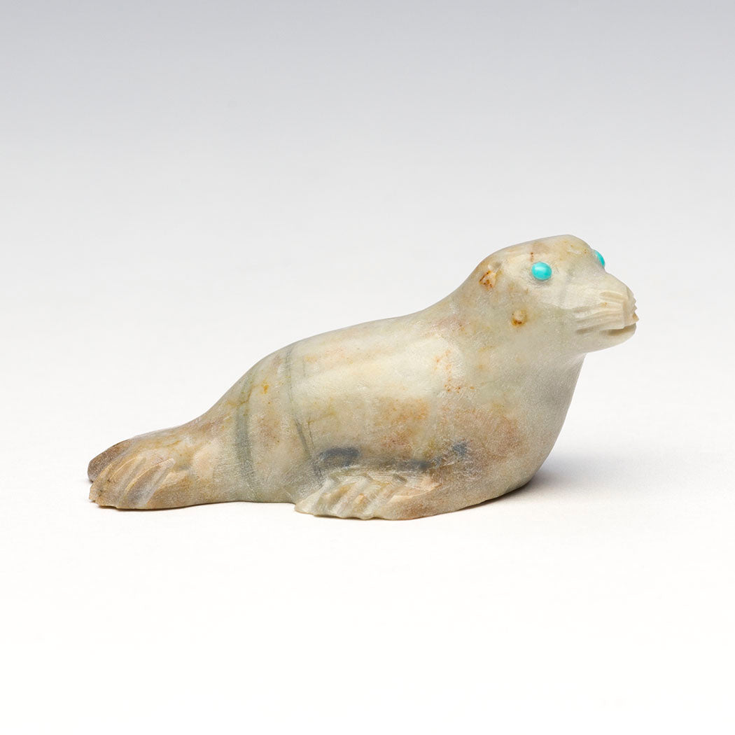 The cold glaciers, mighty ocean and animal brothers of the subarctic world of southeast Alaska is where Tlingit elders teach ancestral principles of responsible care and spiritual regard for seals or tsaa who have provided food and sustenance for thousands of years. Bernie Laselute's Picasso marble water creature has adorable eyes from turquoise inlays on a etched whiskered face. About 1 7/8" long, 1" wide and 7/8" tall.