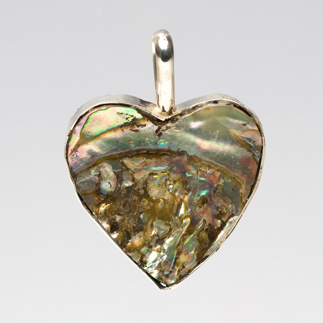 The Kewa tradition of overlay jewelry reaches back to a time way before the Spanish arrived in the ancestral lands of Rio Grande Valley of New Mexico. A colorful handmade mosaic heart pendant by Mary Frances Coriz Aguilar is a contemporary continuation of that ancient tradition. Sterling silver is inlaid with iridescent mother-of-pearl, pen shell, turquoise and red abalone in an approximately 2" long including bale, 1 1/2" wide and 1/4" deep reversible work of wearable art. Signed by the artist.