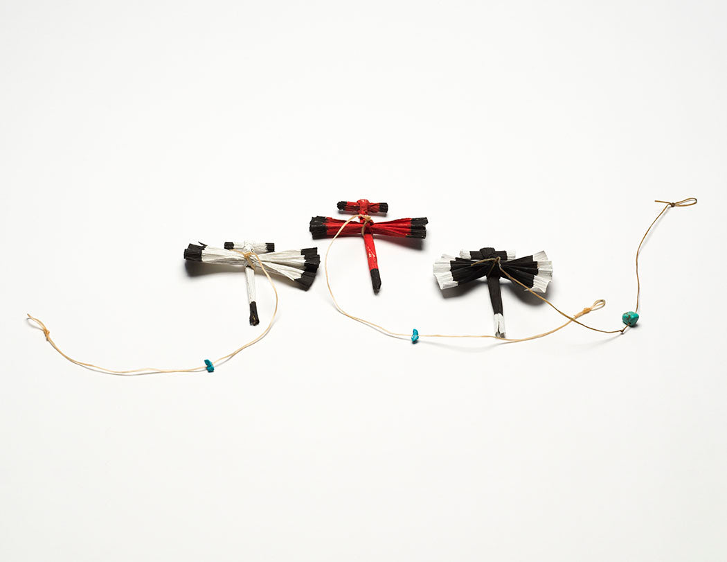 corn husks, painted with colorful acrylics and adorned with turquoise bead accents. They'd be lovely hanging in a window or adorning a Christmas tree. The longest ornament is about 12", while the shortest is 11" long. The smallest one is approximatey 3" wide and the largest is 3 1/2" wide.