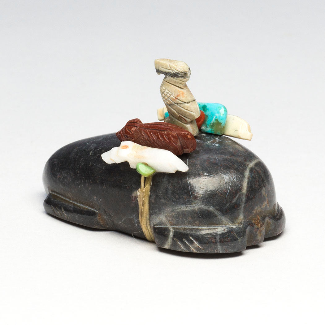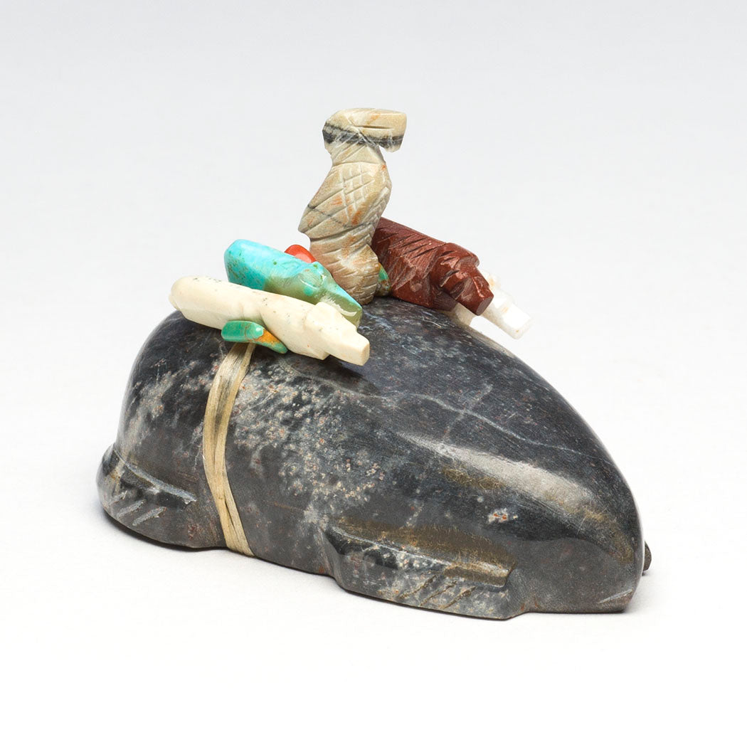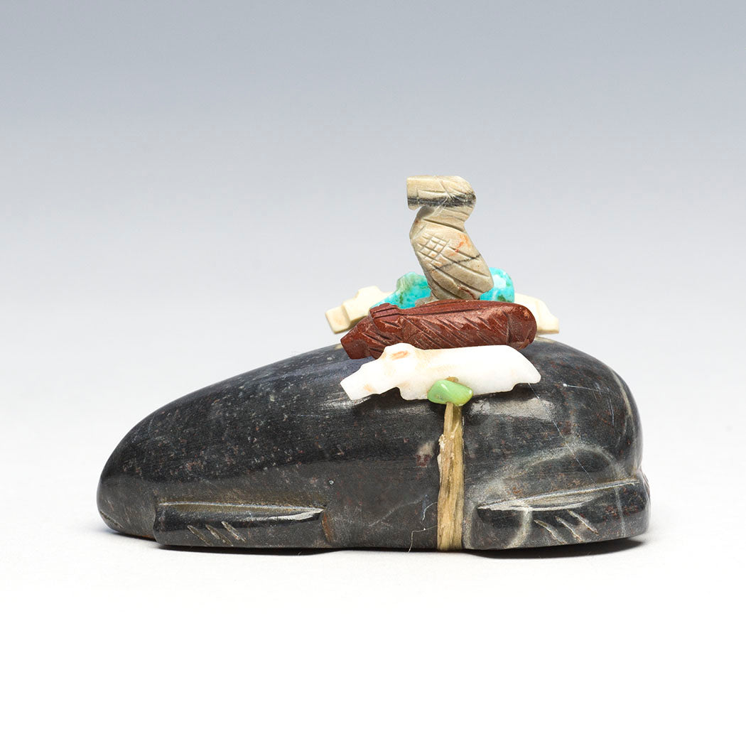 For A:Shiwi (The People), Six Directions are honored in life with a specific color and animal for each. Fitz and Marlo Kiyite's wonderful directional carving includes perhaps a marble Wolf, a pipestone Badger, a Picasso marble Eagle, a turquoise Bear and a fish rock serpentine Mountain Lion all securely attached to a handsome Picasso marble Mole. This creation has combined all Six Directions to easily place on your favorite spot. About 2 1/4" long, 1 1/4" wide and 1 5/8" tall.