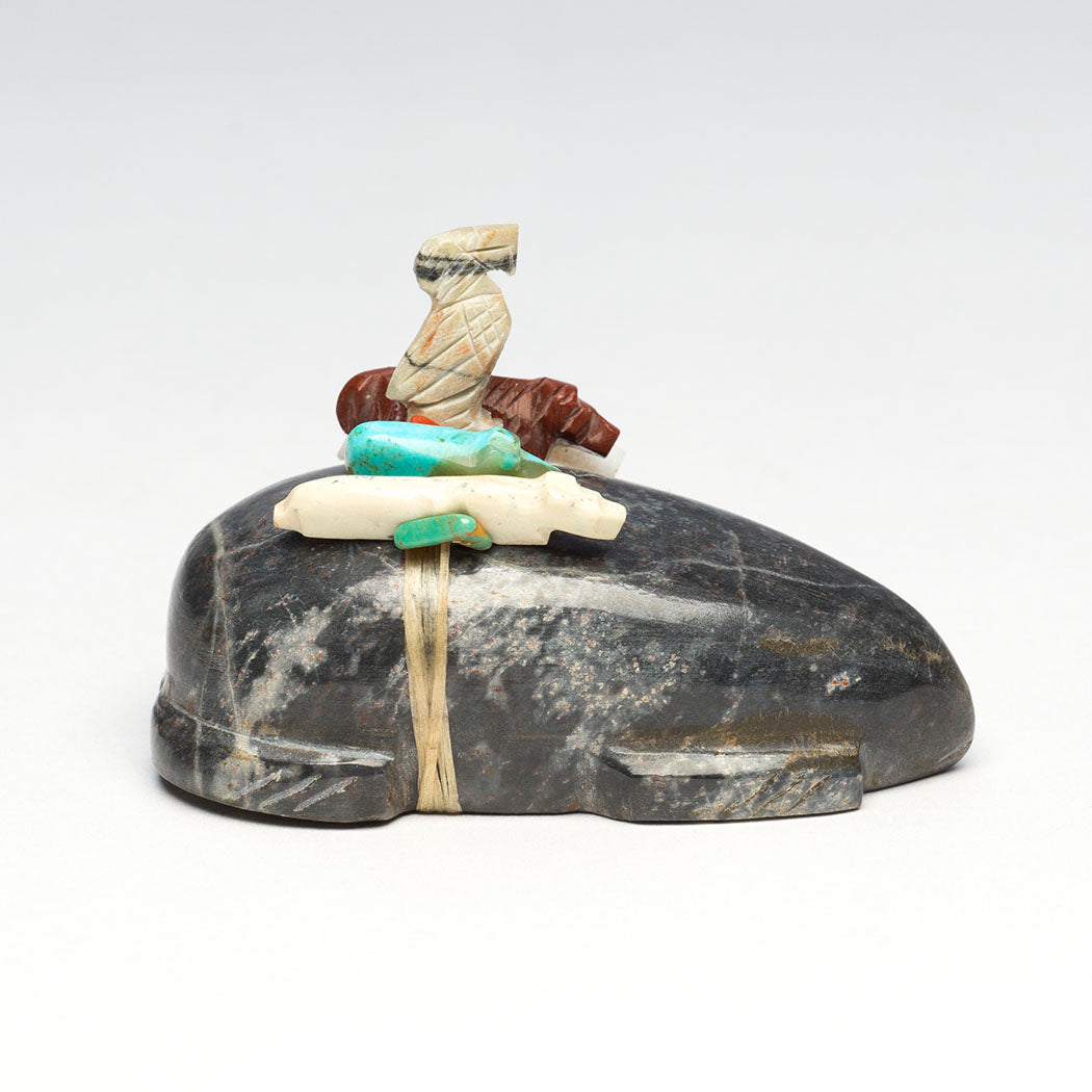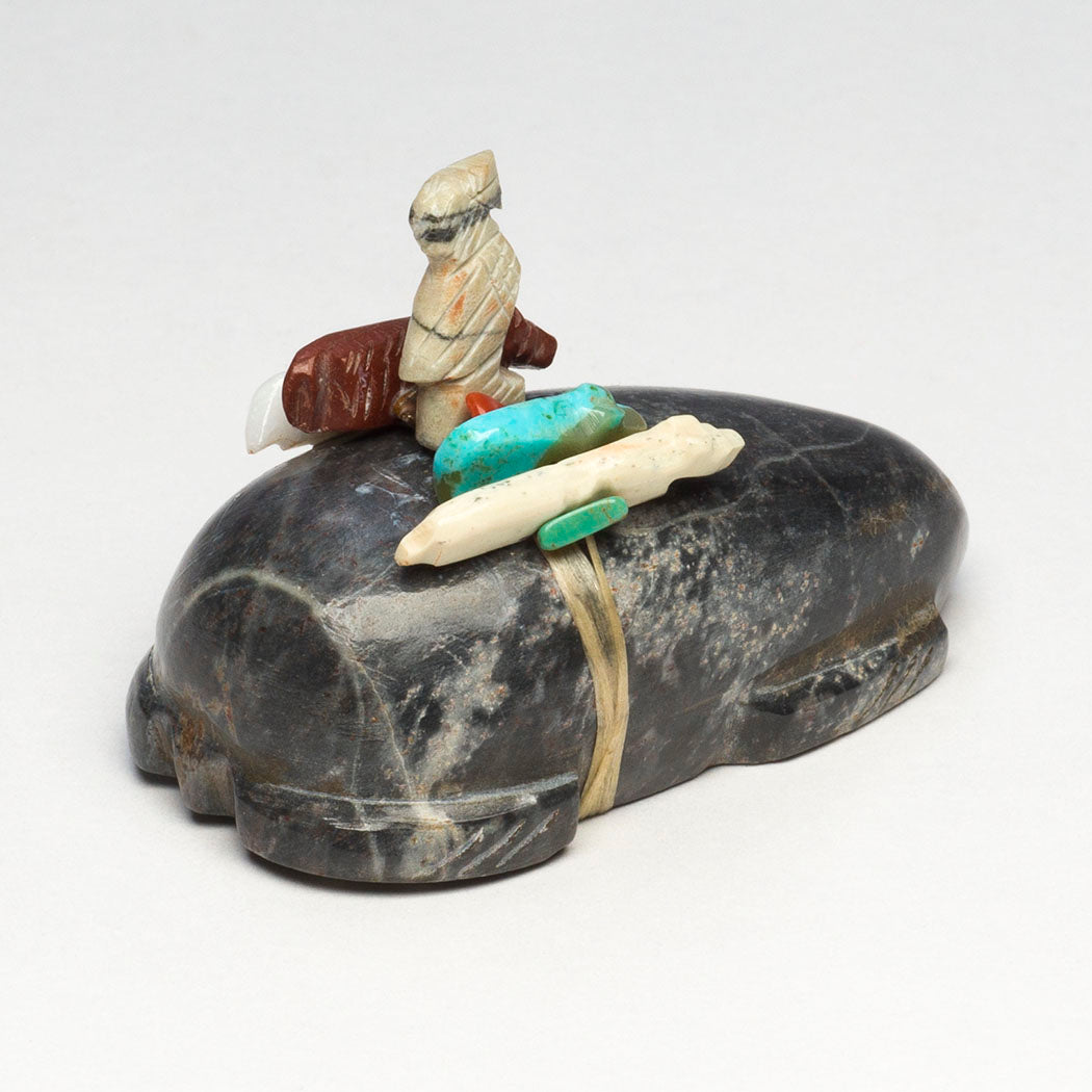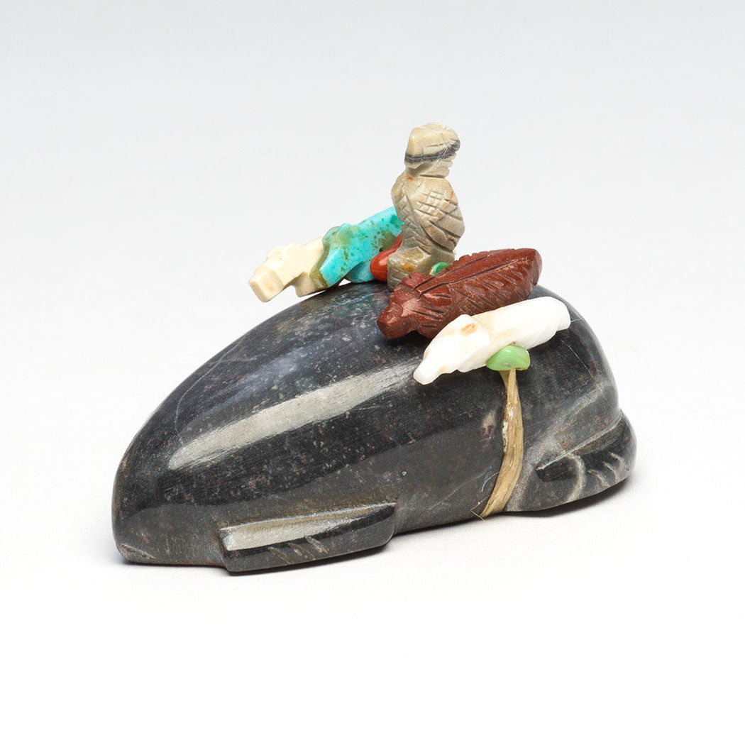 For A:Shiwi (The People), Six Directions are honored in life with a specific color and animal for each. Fitz and Marlo Kiyite's wonderful directional carving includes perhaps a marble Wolf, a pipestone Badger, a Picasso marble Eagle, a turquoise Bear and a fish rock serpentine Mountain Lion all securely attached to a handsome Picasso marble Mole. This creation has combined all Six Directions to easily place on your favorite spot. About 2 1/4" long, 1 1/4" wide and 1 5/8" tall.