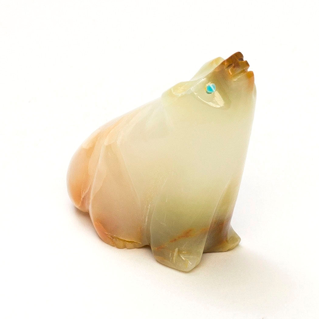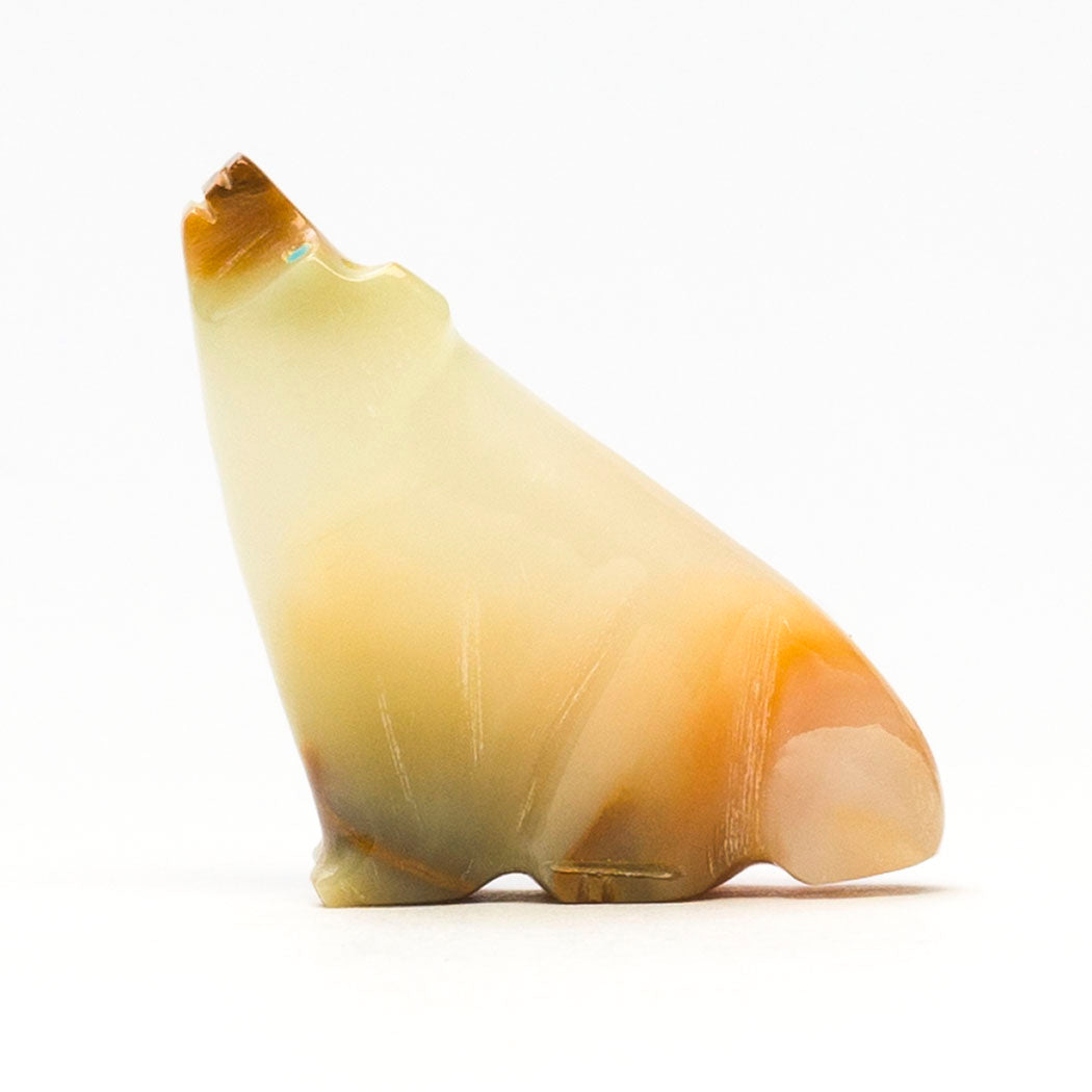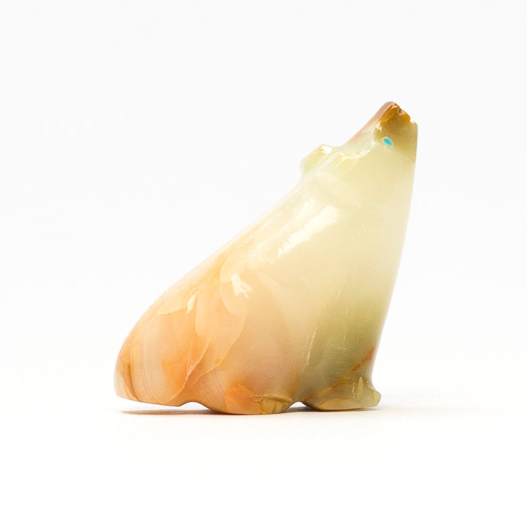 Camouflaging coyotes have fur coats that blend in well with the bare rocks and sandy soils of their desert homes. They promote biodiversity supporting a broad range of plant and animal life. For instance, they indirectly support ground-nesting bird populations by reducing predators. David Chavez, Jr.'s Coyote (Fox or Wolf) has been carved from onyx. Soulful eyes from turquoise inlays feel the spirit of the songs it sings. Approximately 1 1/2" long, 5/8" wide and 1 1/2" tall.