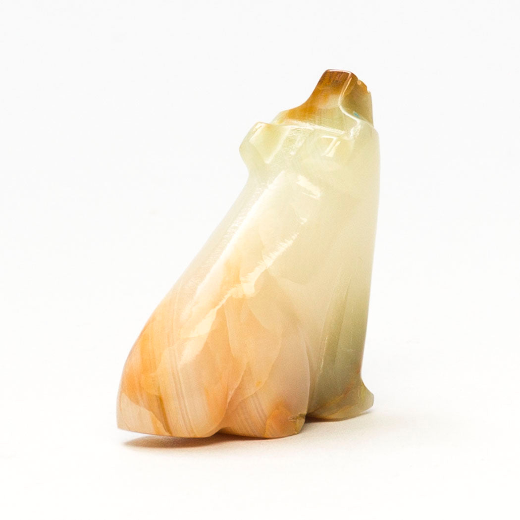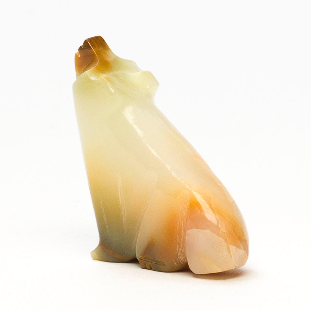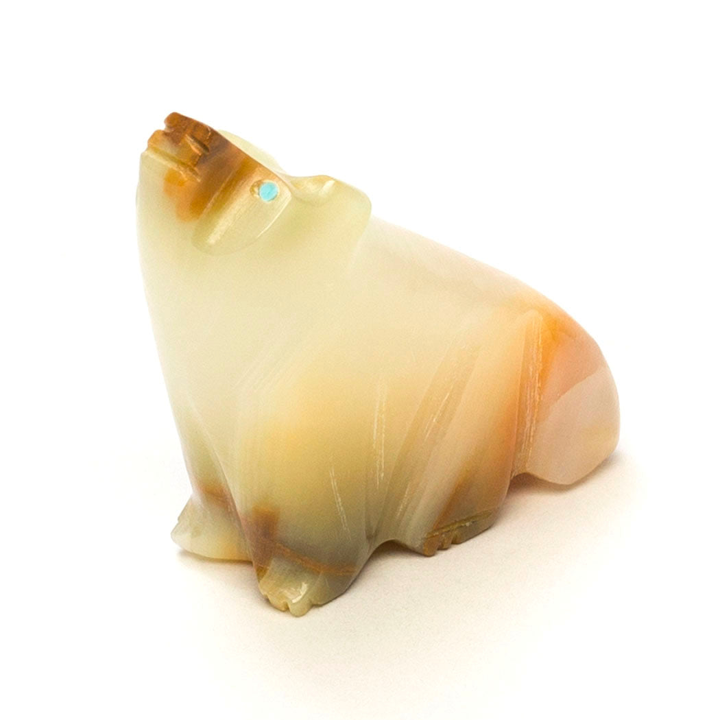 Camouflaging coyotes have fur coats that blend in well with the bare rocks and sandy soils of their desert homes. They promote biodiversity supporting a broad range of plant and animal life. For instance, they indirectly support ground-nesting bird populations by reducing predators. David Chavez, Jr.'s Coyote (Fox or Wolf) has been carved from onyx. Soulful eyes from turquoise inlays feel the spirit of the songs it sings. Approximately 1 1/2" long, 5/8" wide and 1 1/2" tall.