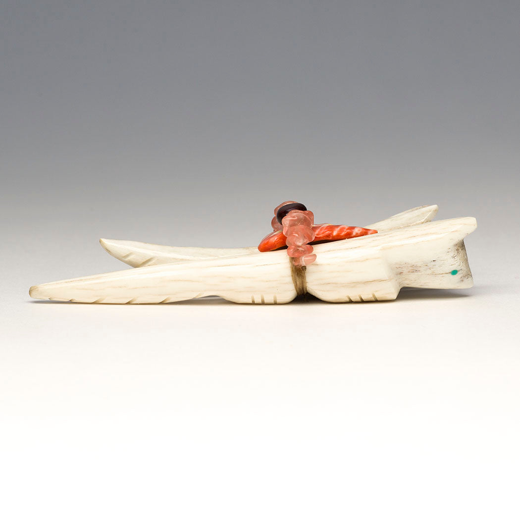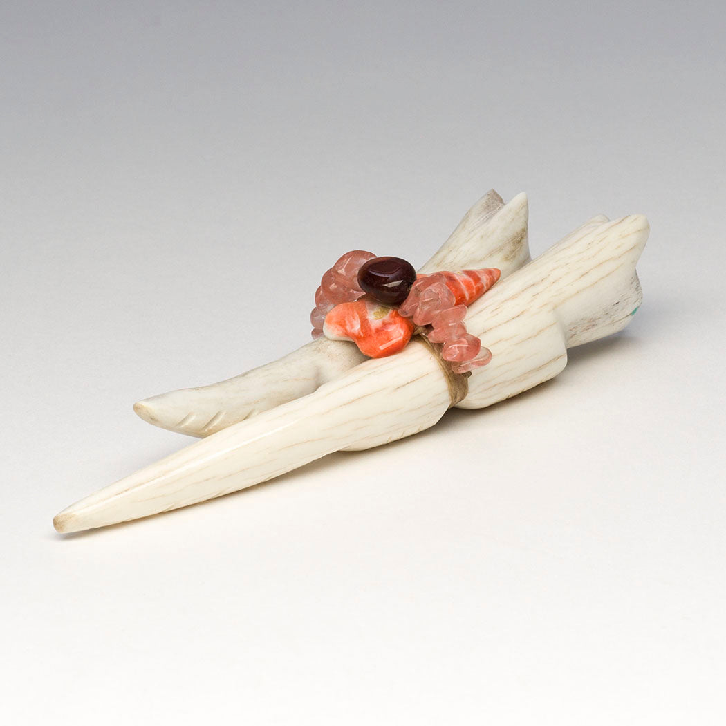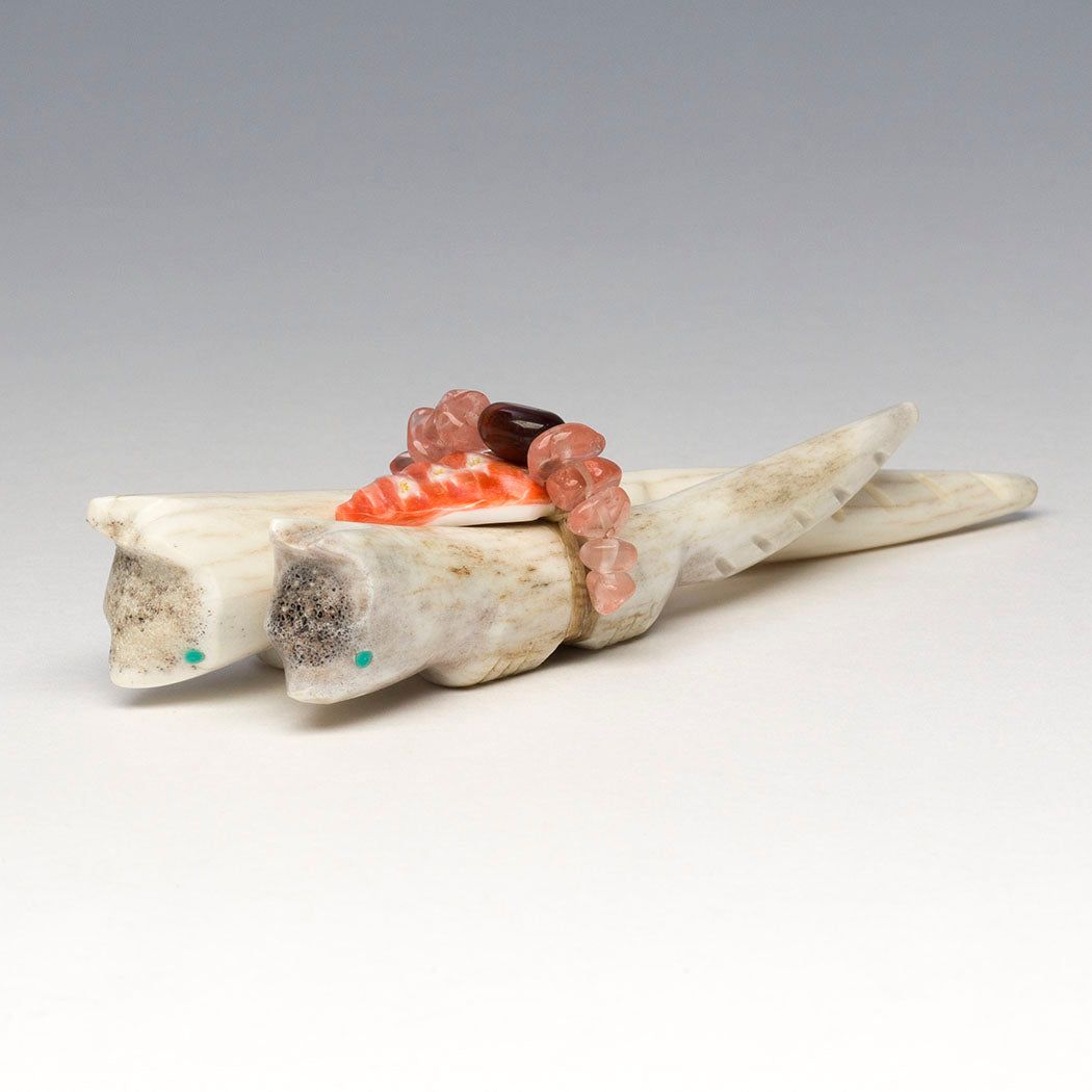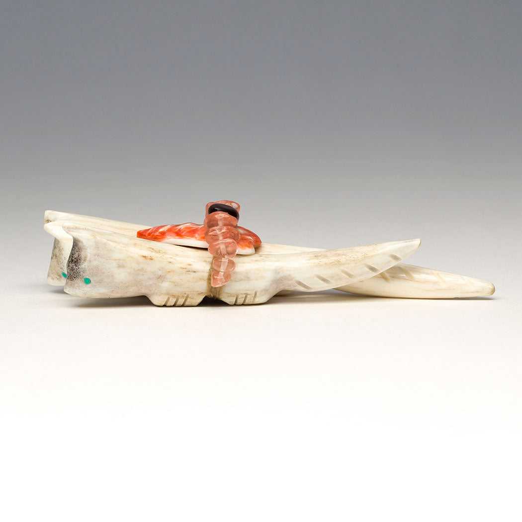 Zuni carver Robert Michael Weahkee said that when he's creating, he has a sense of connection to ancestors and family. We're delighted by his latest offering. Joined by lovely red tiger's eye and strawberry quartz beads plus an orange spiny oyster shell point offering bundle, two spirited bushytails (Fox, Wolf or Coyote) from antler go about their day in unity and understanding. Curious eyes from turquoise inlays see far and wide, while tails are etched in a cool way. About 4 3/4" long, 1 1/2" wide and 1" tall.