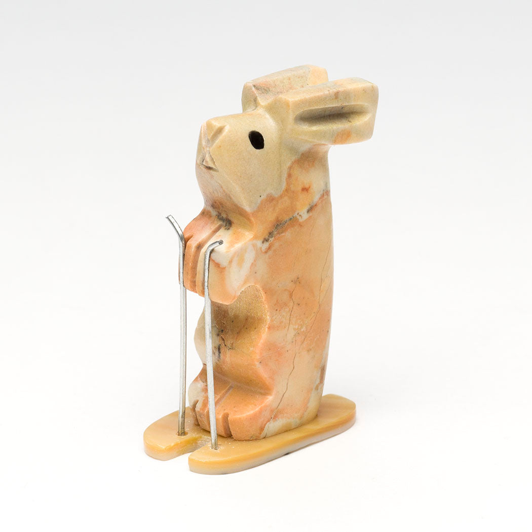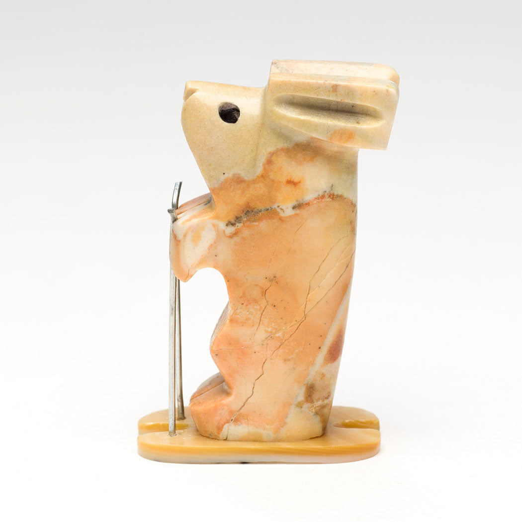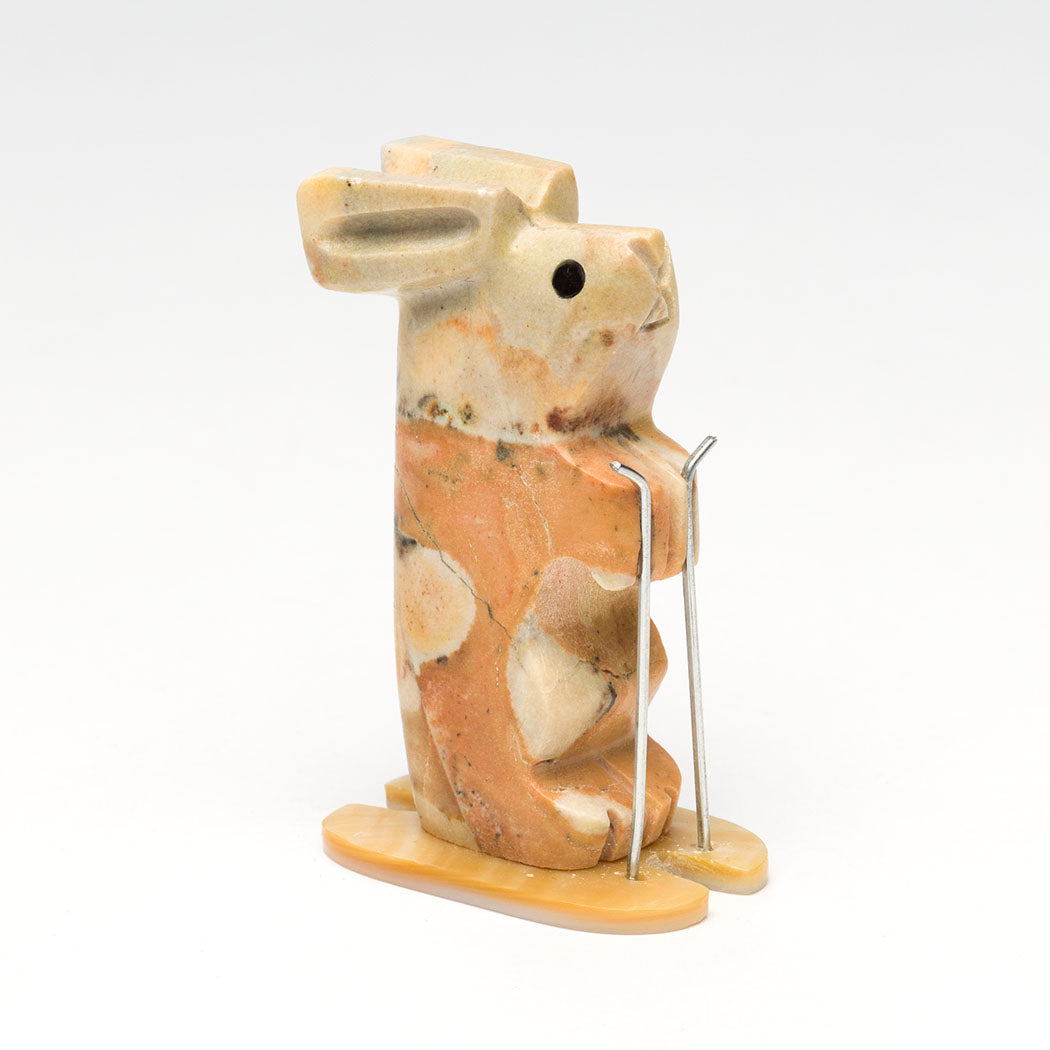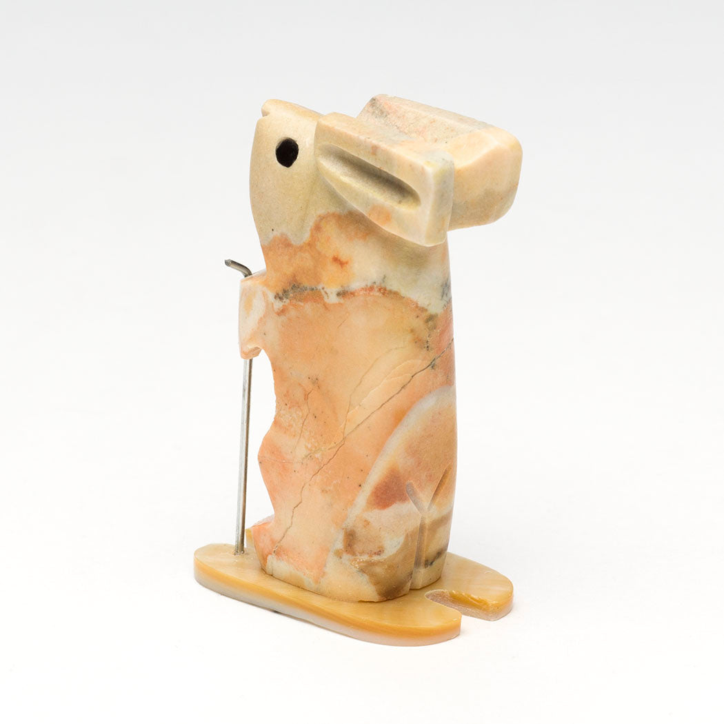 A sporty tidgilite Rabbit swishes down the slopes slaloming deftly on gold lip shell skis. Carved animals by Waldo Davis are always unique and this bunny is no exception. Poles are from cleverly trimmed silver paper clips and adorable eyes are from pen shell inlays. About 2 3/8" tall, 7/8" wide and roughly 1 1/2" deep.