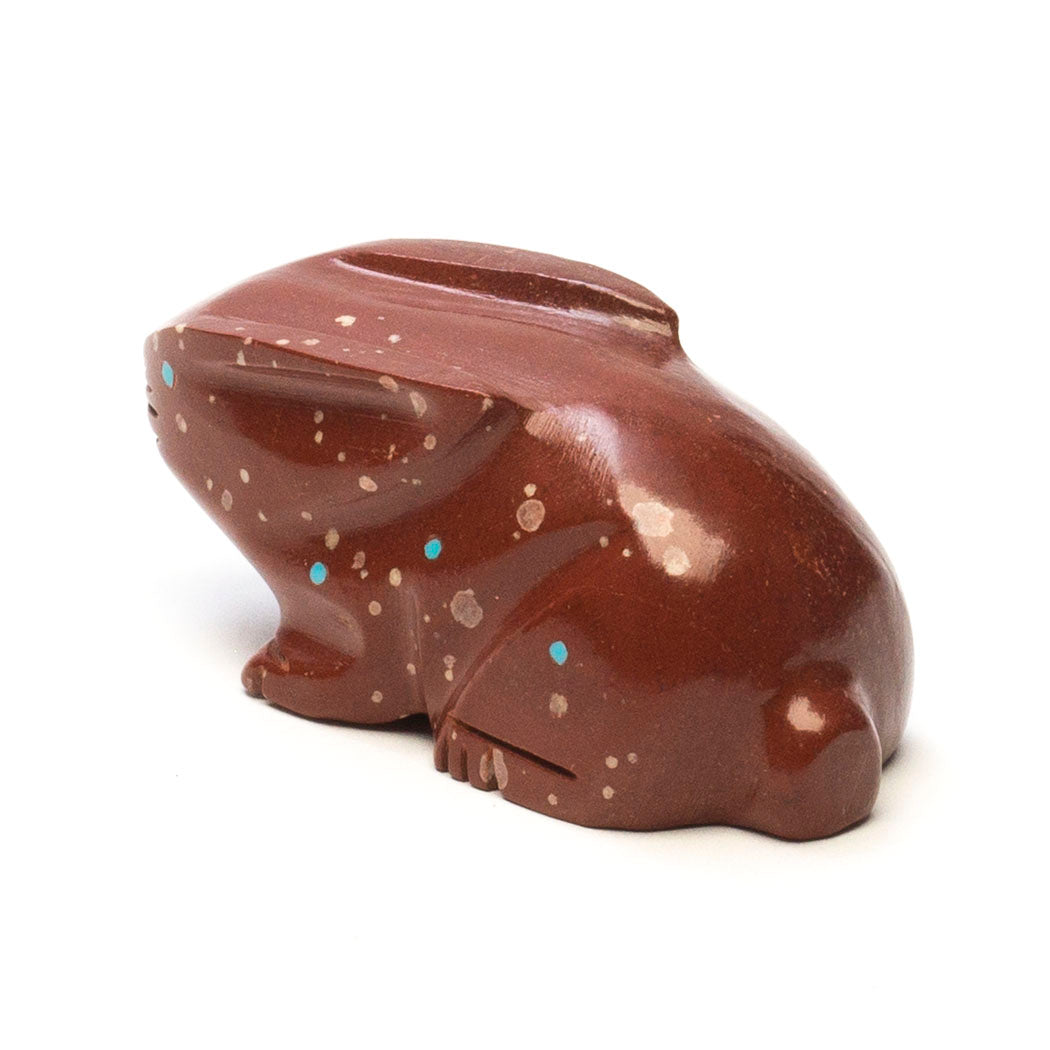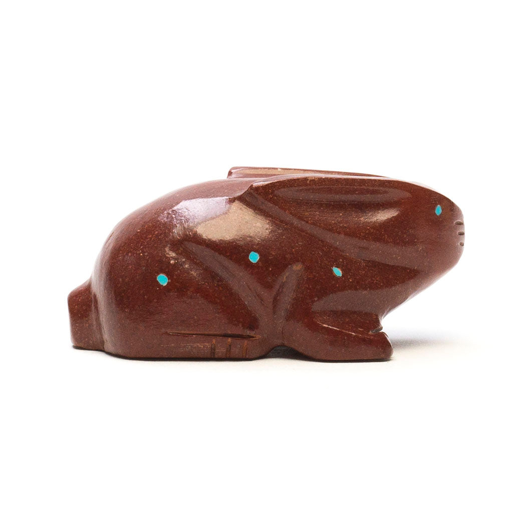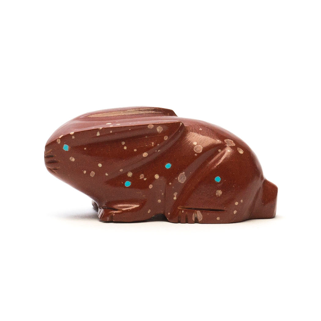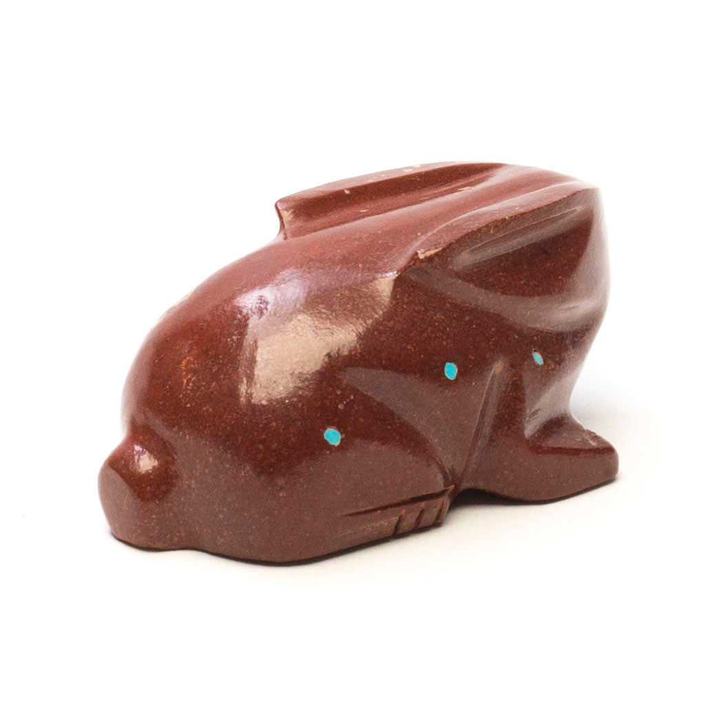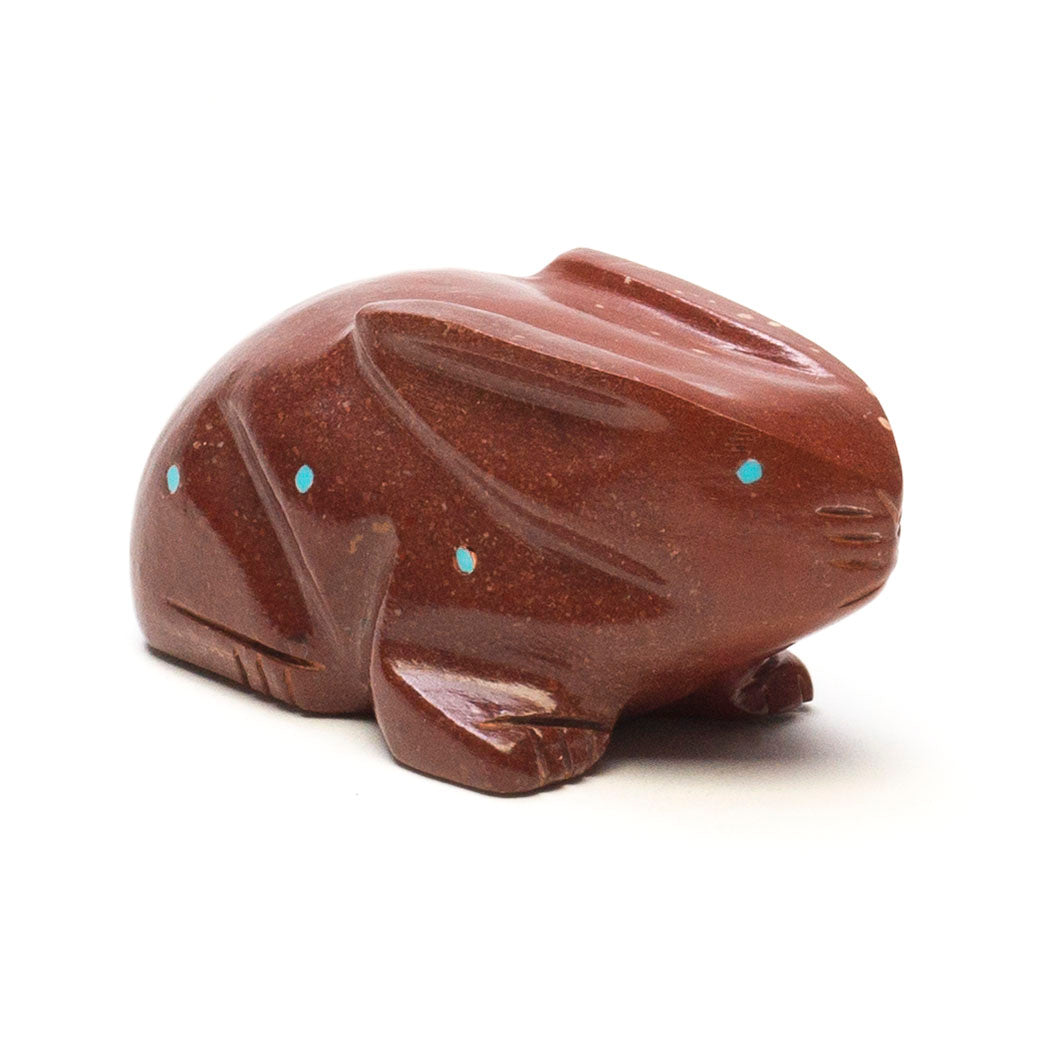 Rabbit is carved from a rich pipestone with some of those amazing spots accented with turquoise inlays. Ears are pressed back and whiskers are incised. About 2 1/4" long, 1 1/4" wide and 1" tall.