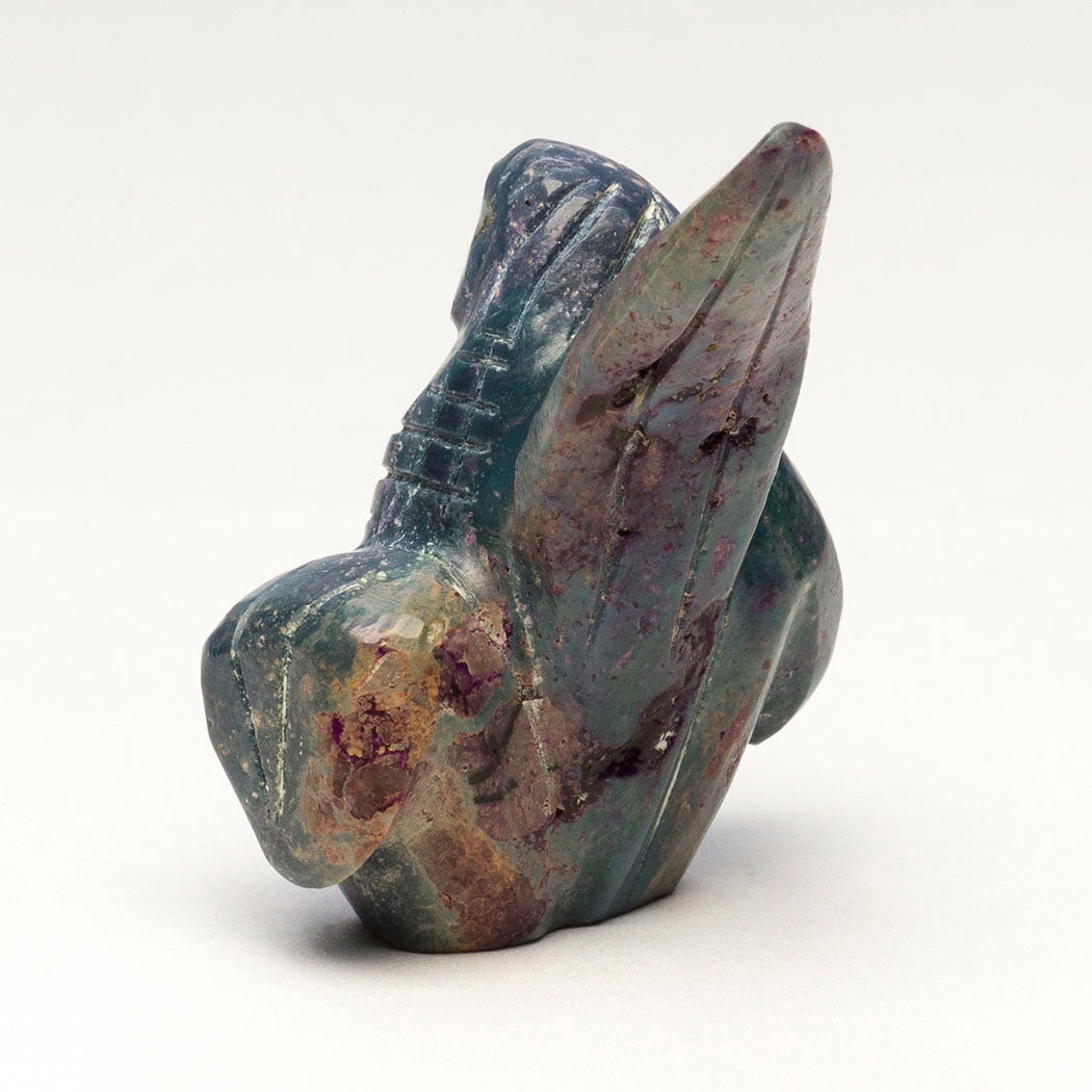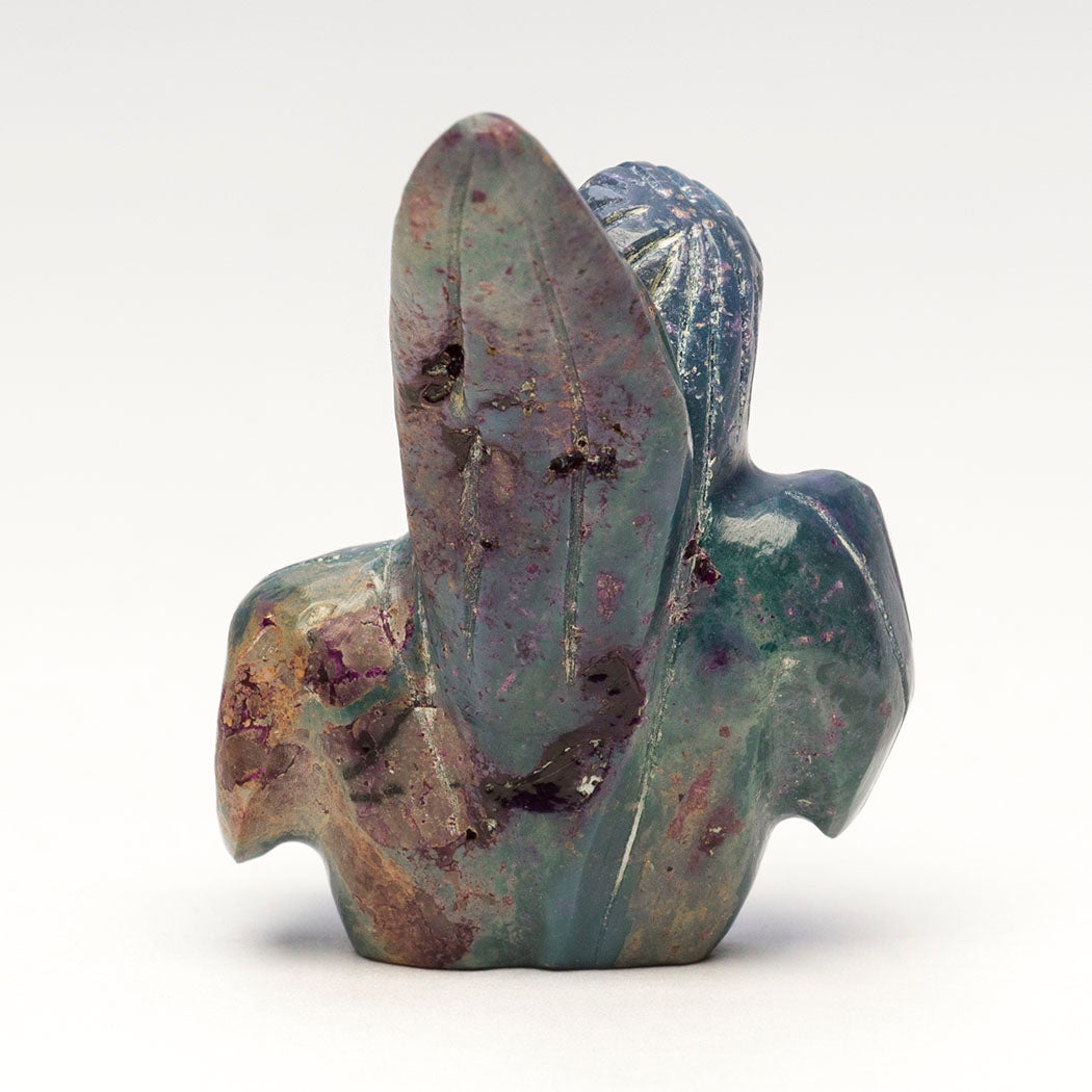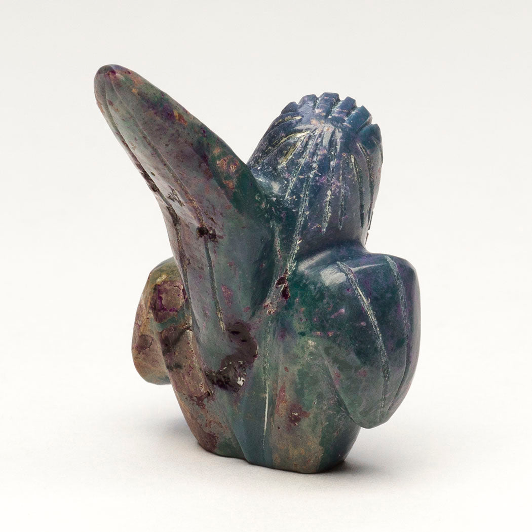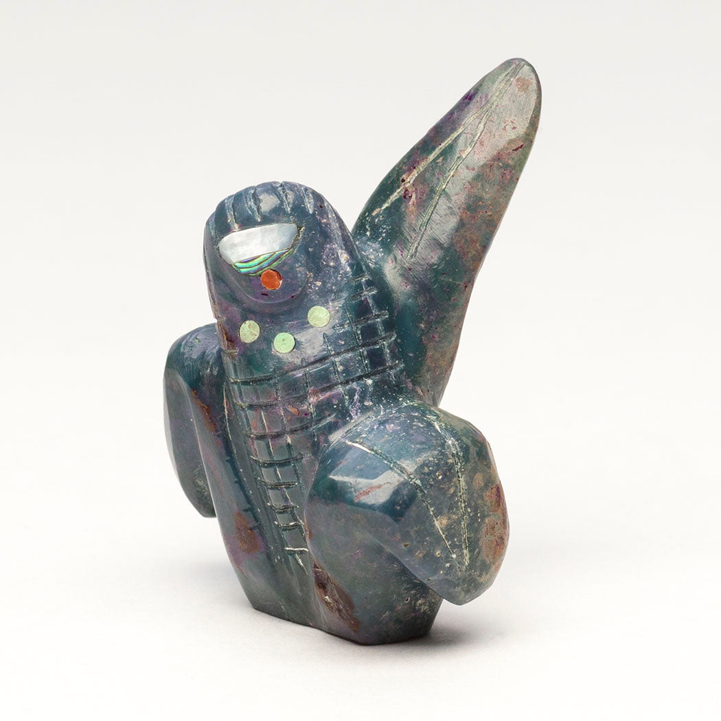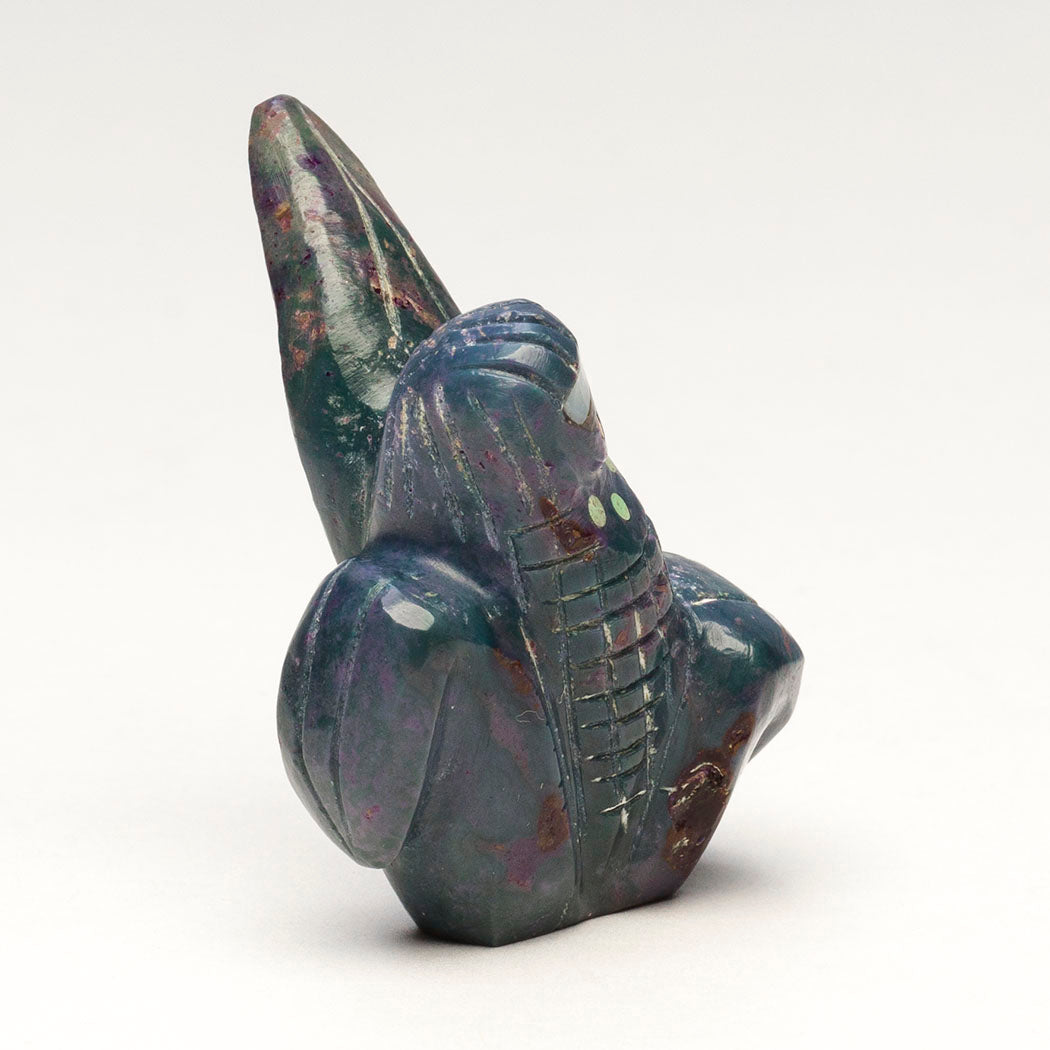 corn with etched kernels on her body. Dee's stylized Corn Maiden is carved from dyed alunite adorned with turquoise inlays. Facial features are from iridescent mother-of-pearl, watery abalone and bright red coral inlays. Approximately 1 5/8" tall, 1 1/4" wide and 1 1/4" deep.