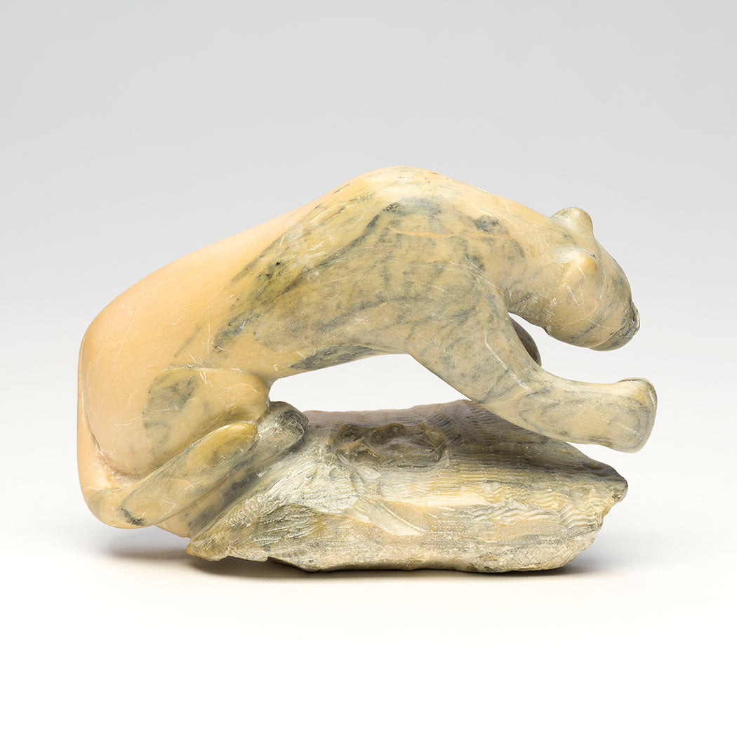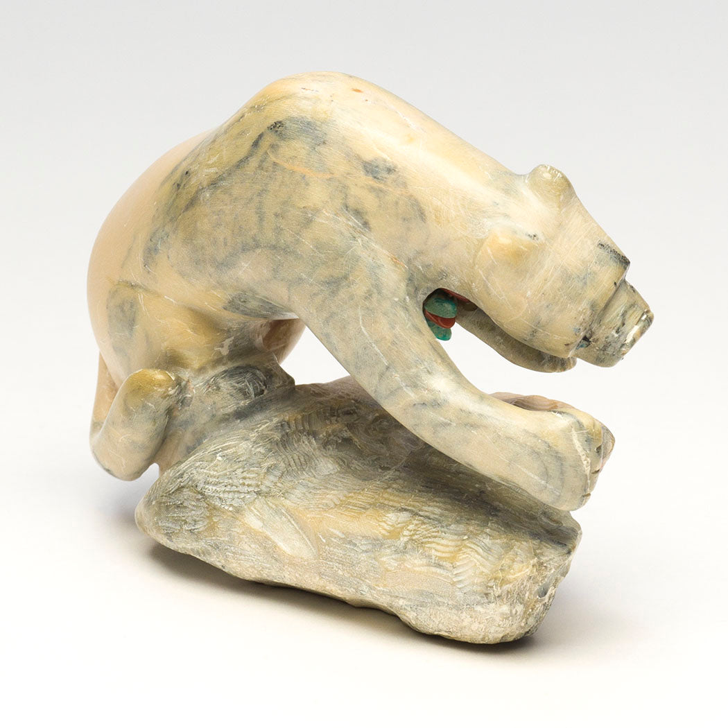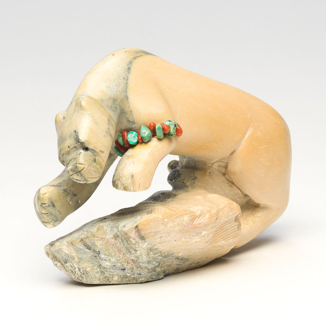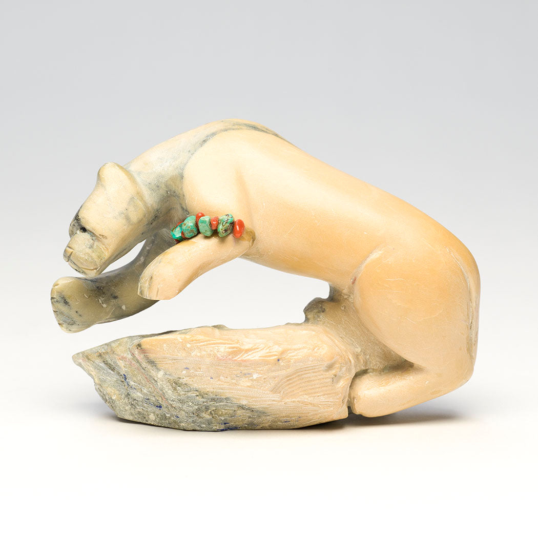 Mountain-lion, puma or panther) springs forth using powerful hind legs and a balancing tail. Carved from one gorgeous dolomite specimen, this powerful feline has directed eyes accented with jet paste. Colorful green turquoise and red coral beads give thanks for mountain lion, the elder brother of theĀ