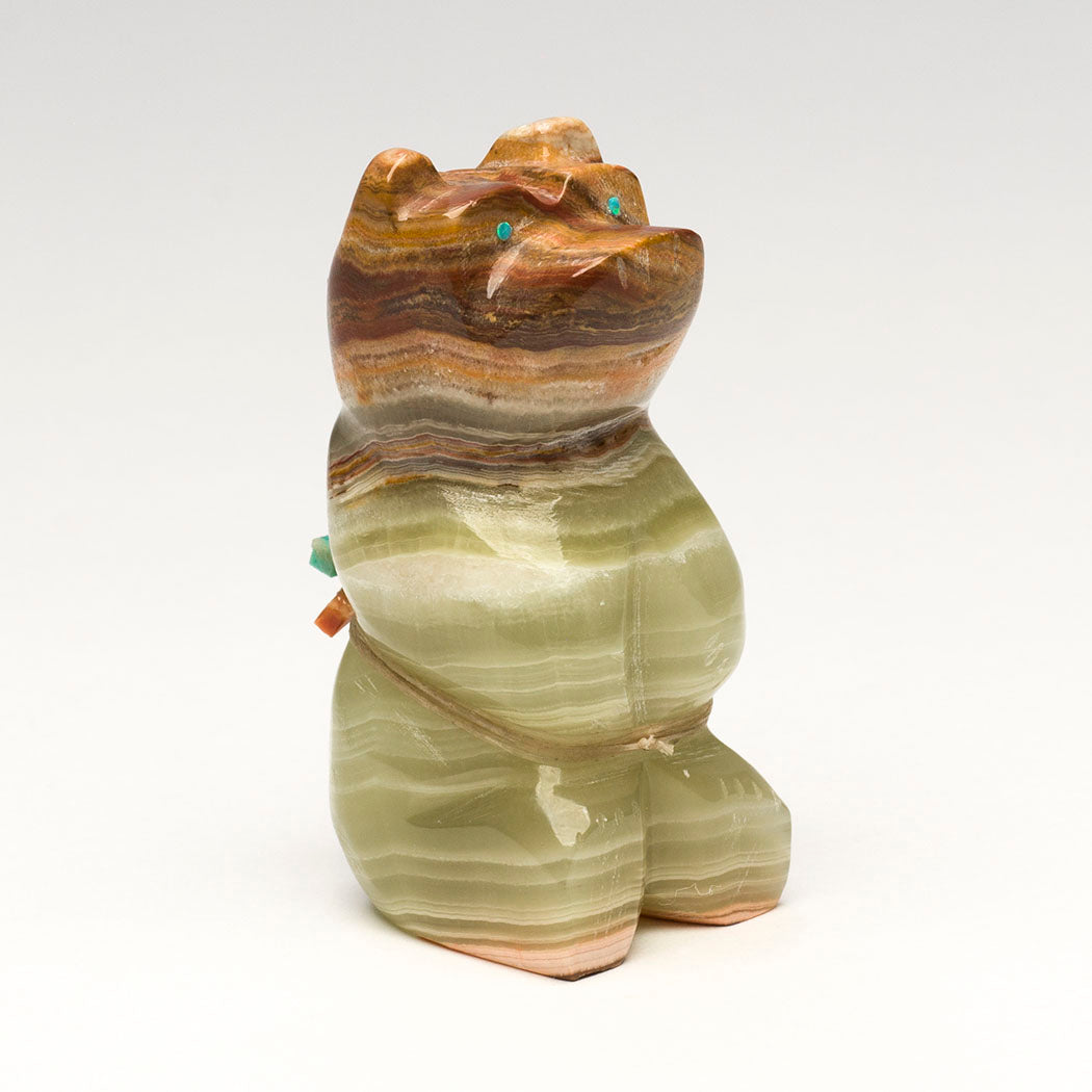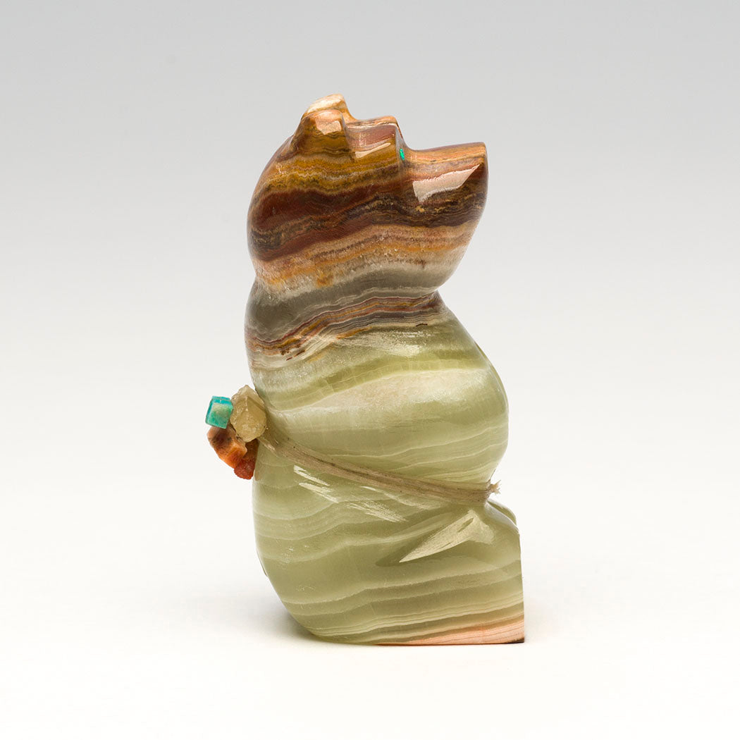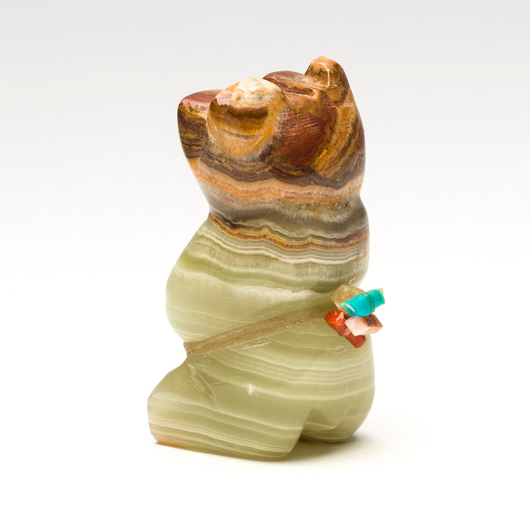 Mother Bear keeps a close eye on the playing cubs. She's fiercely protective of her offspring spending several years building a strong family bond and ensuring they have the necessary skills to thrive on their own. Daryl Shack, Sr.'s guardian is sculpted from onyx and has focused eyes from cultured opal inlays. About 2 5/8" tall, 1 1/8" wide and 1 1/2" deep.