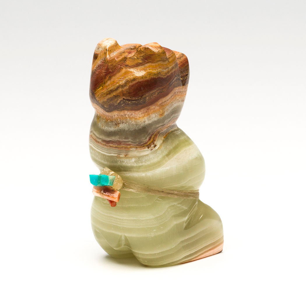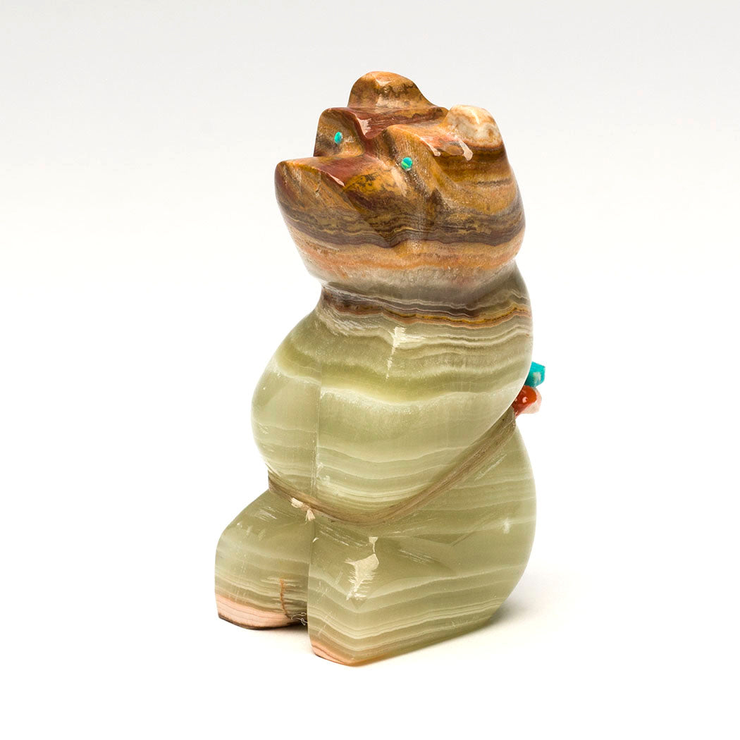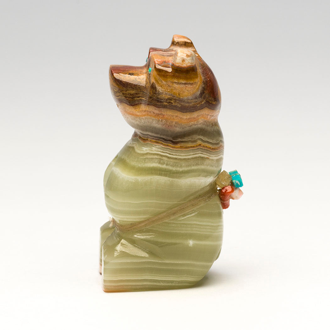 Mother Bear keeps a close eye on the playing cubs. She's fiercely protective of her offspring spending several years building a strong family bond and ensuring they have the necessary skills to thrive on their own. Daryl Shack, Sr.'s guardian is sculpted from onyx and has focused eyes from cultured opal inlays. About 2 5/8" tall, 1 1/8" wide and 1 1/2" deep.