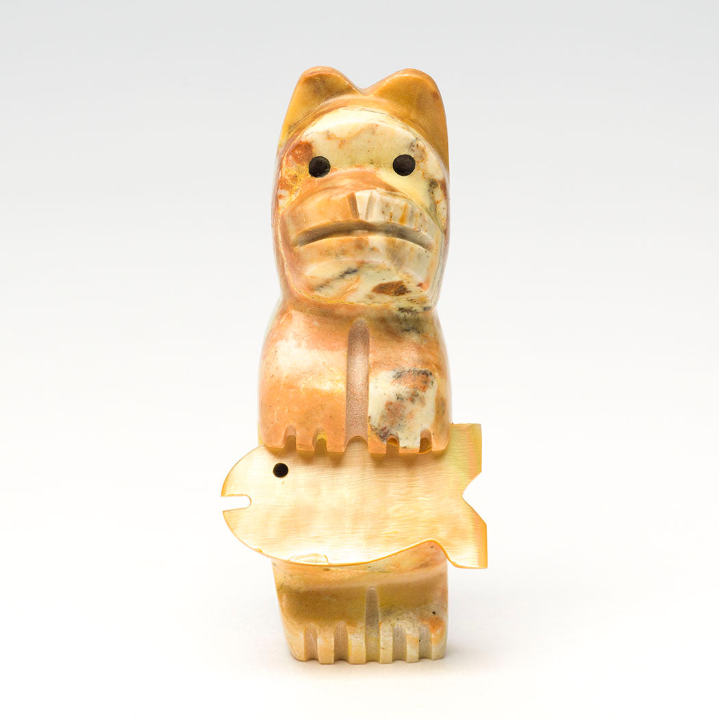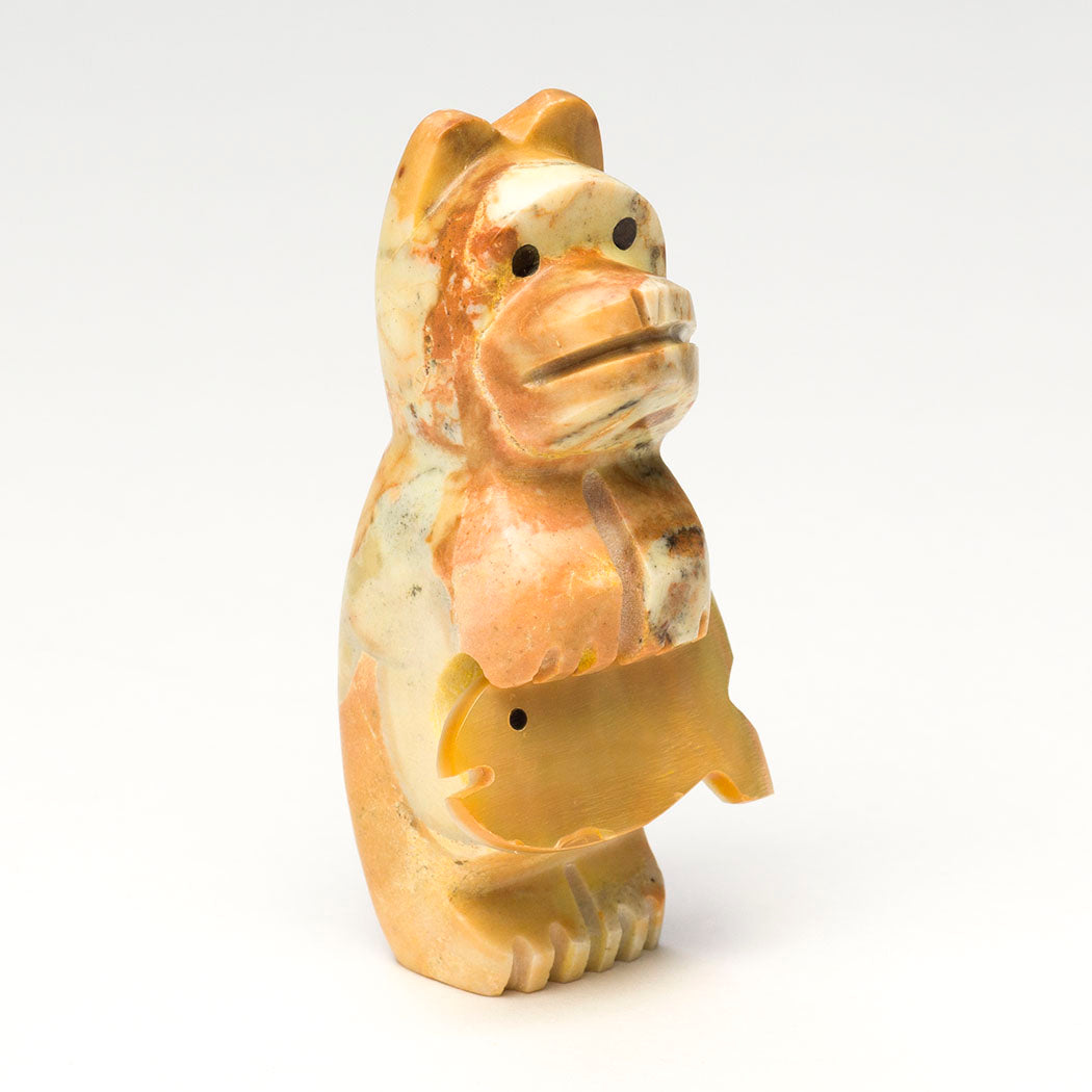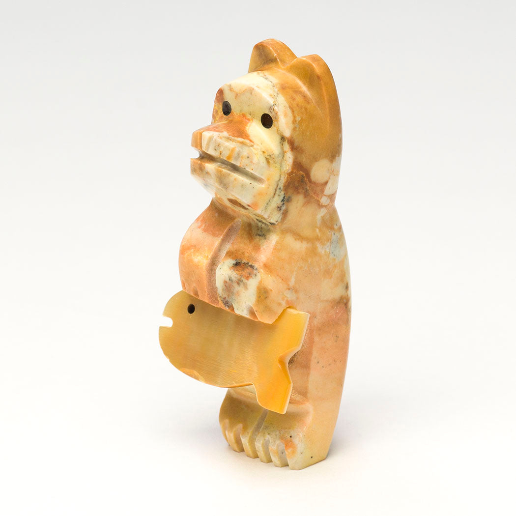 Waldo Davis' hungry Bear carved from tidgilite snatches an iridescent gold lip shell fish right from the rushing river. Fishing activity increases a lot during salmon and trout spawning runs when fish are concentrated and easier to catch. The upright bear's eyes are from pen shell inlays, so are the water creature's. Together they measure approximately 2 3/4" tall, 1 1/4" wide and 1 1/8" deep.