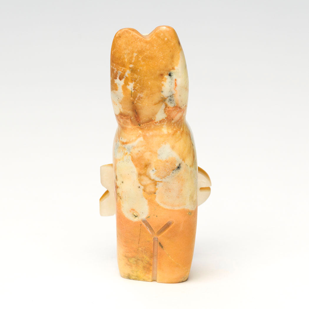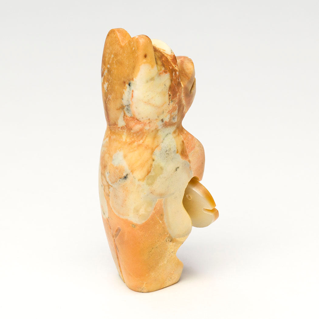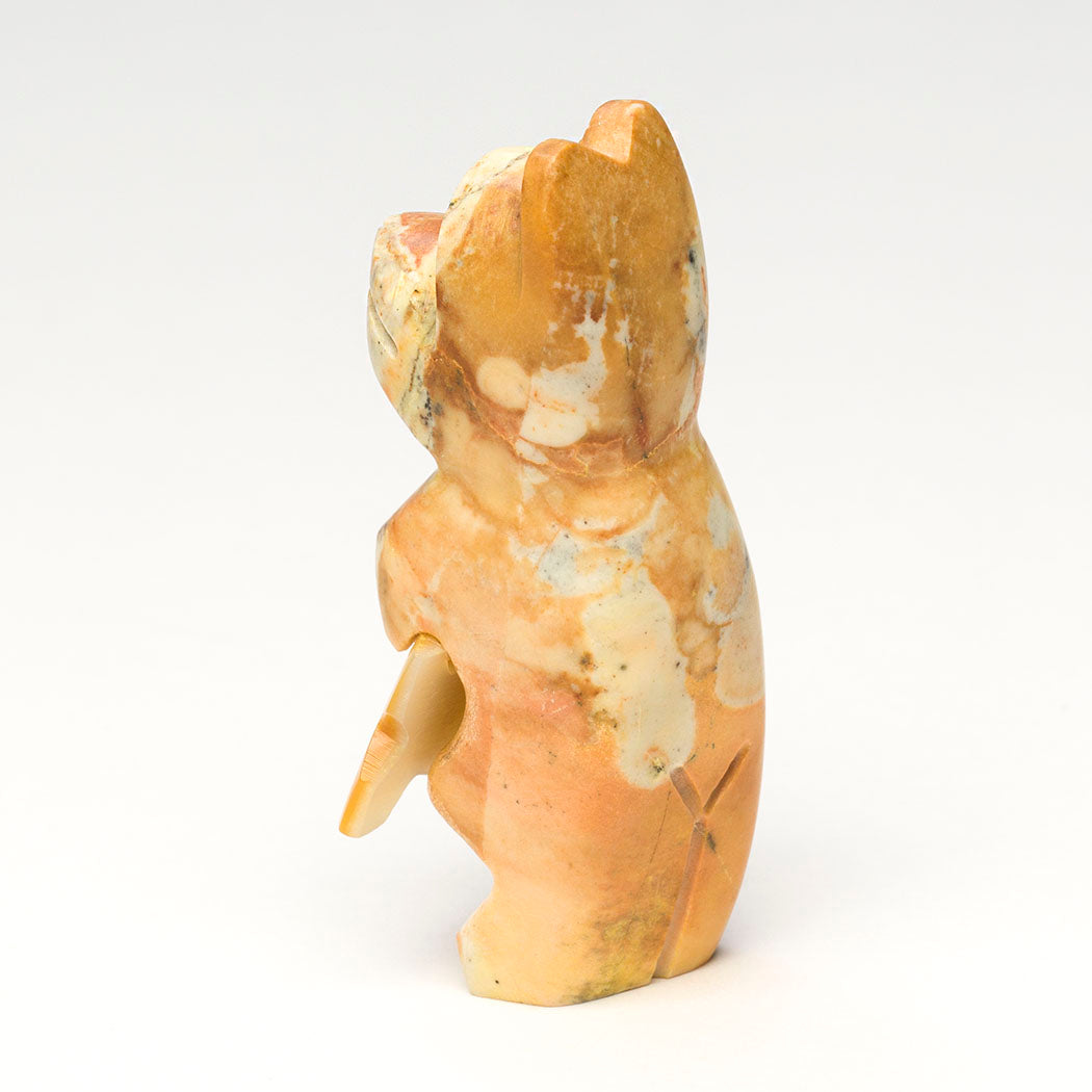 Waldo Davis' hungry Bear carved from tidgilite snatches an iridescent gold lip shell fish right from the rushing river. Fishing activity increases a lot during salmon and trout spawning runs when fish are concentrated and easier to catch. The upright bear's eyes are from pen shell inlays, so are the water creature's. Together they measure approximately 2 3/4" tall, 1 1/4" wide and 1 1/8" deep.