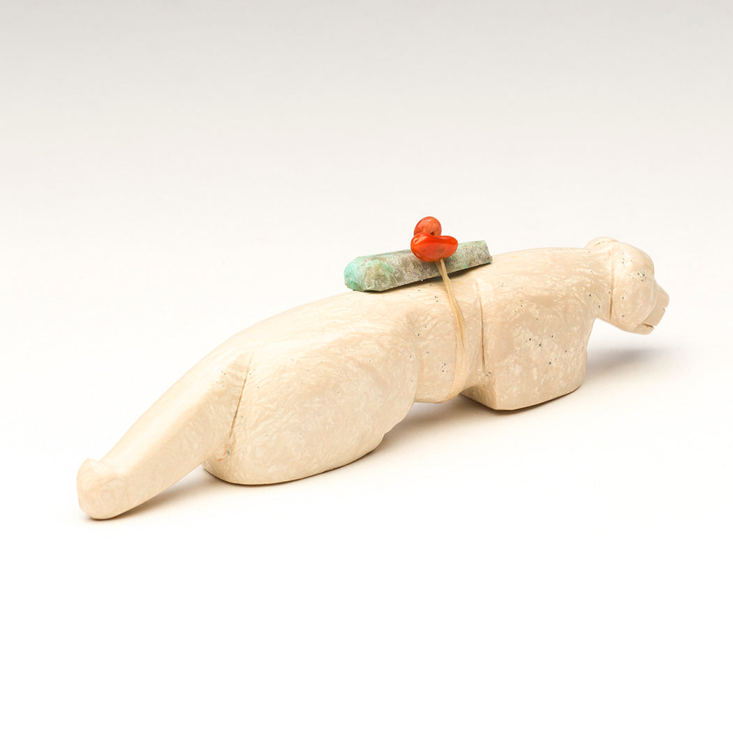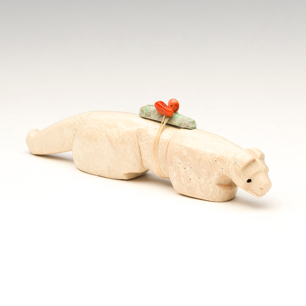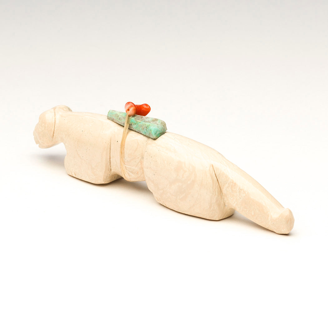 A young Mountain-lion (puma, cougar or panther) learns the lay of the land captivated by the scents and sounds of underground creatures. Curious eyes from jet inlays soak up the activity and a smooth coat is thanks to the skilled carving and polishing work of Fitz and Marlo Kiyite. A fabulous red coral bead and turquoise point offering bundle is secured to this approximately 4 1/8" long, 3/4" wide and 1 1/8" tall fish rock serpentine feline.