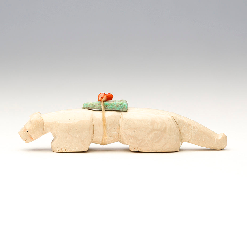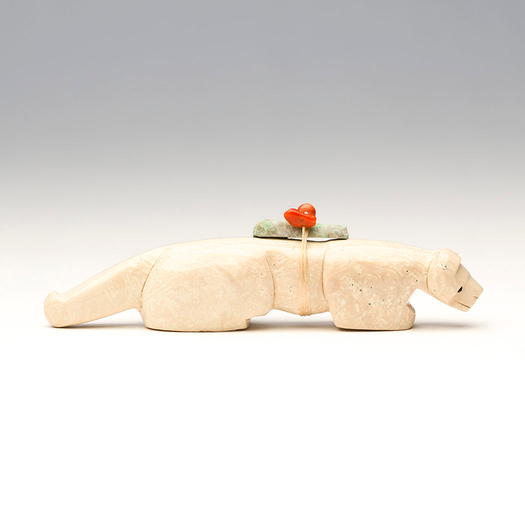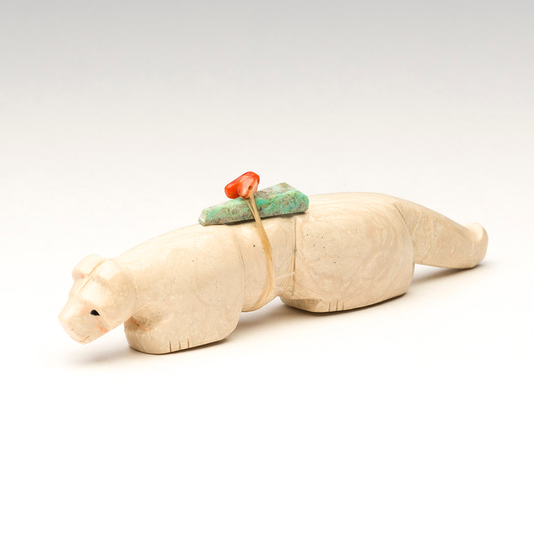 A young Mountain-lion (puma, cougar or panther) learns the lay of the land captivated by the scents and sounds of underground creatures. Curious eyes from jet inlays soak up the activity and a smooth coat is thanks to the skilled carving and polishing work of Fitz and Marlo Kiyite. A fabulous red coral bead and turquoise point offering bundle is secured to this approximately 4 1/8" long, 3/4" wide and 1 1/8" tall fish rock serpentine feline.