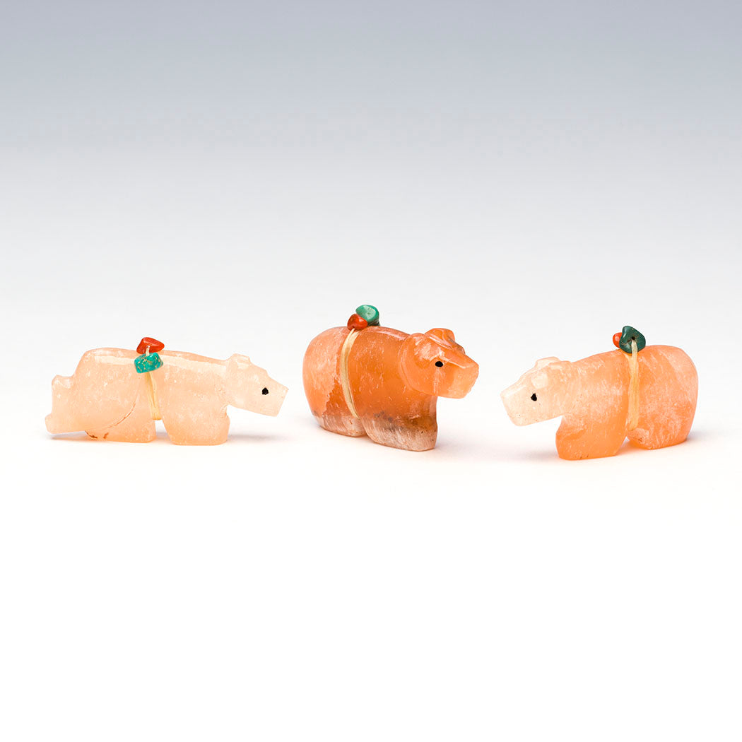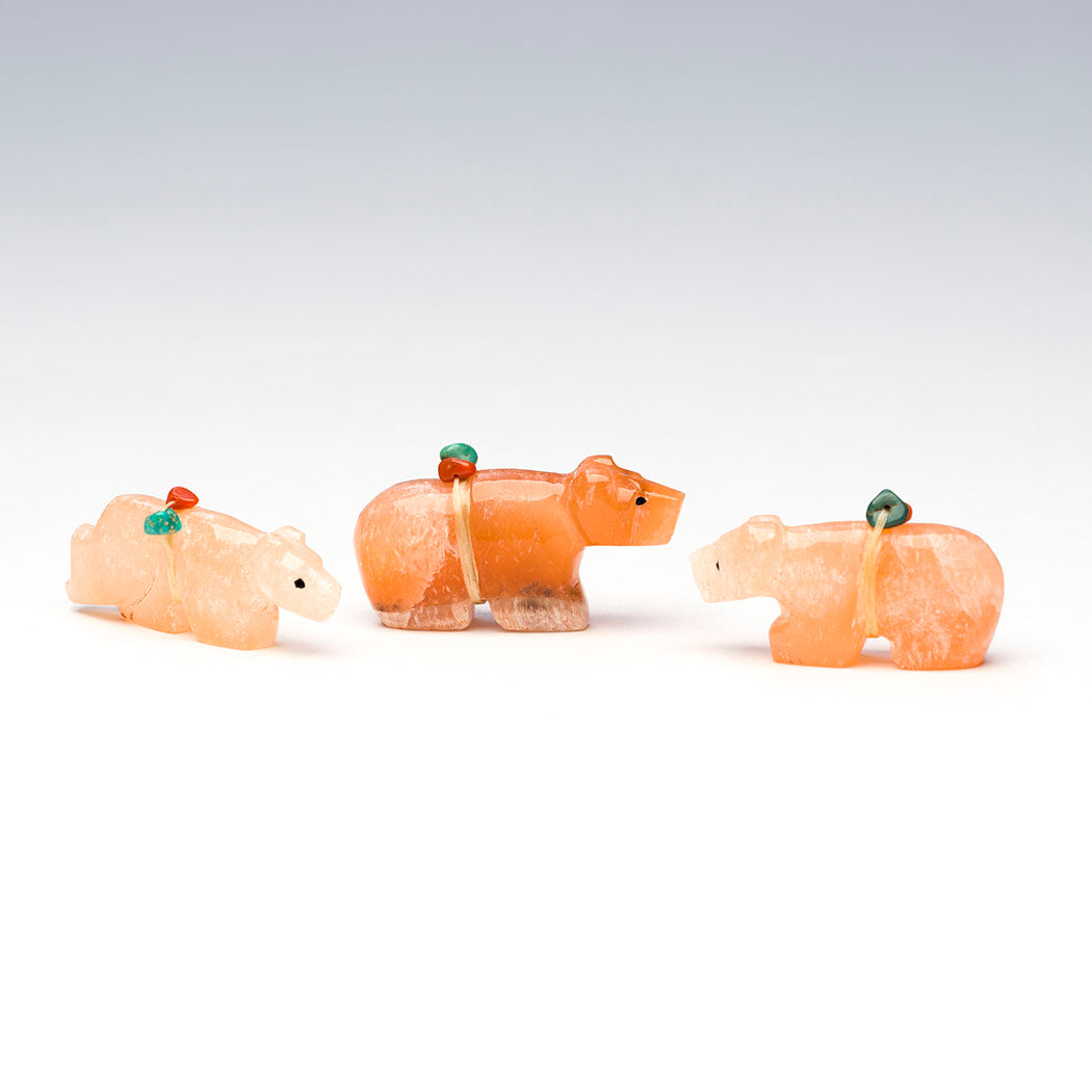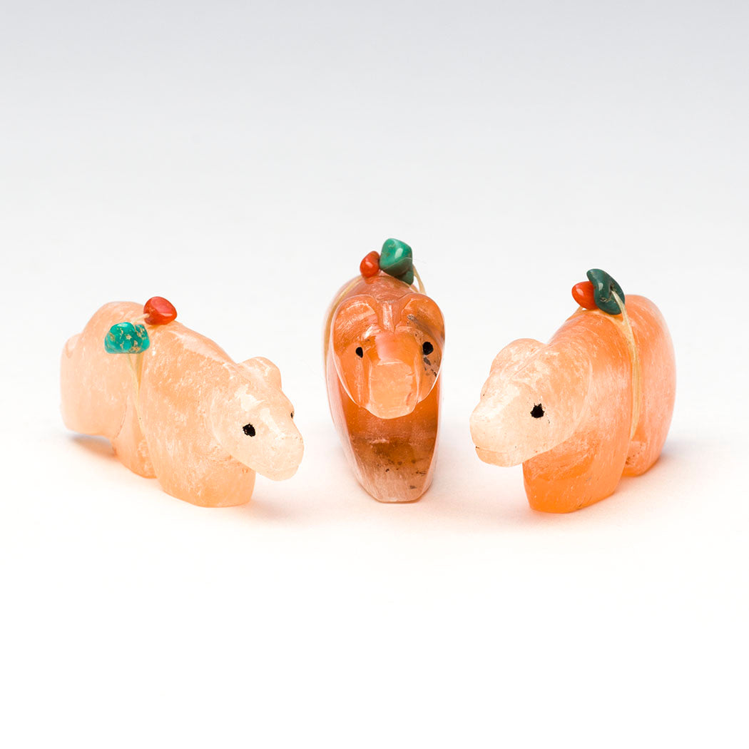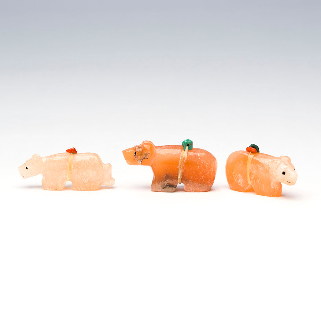 Bears have a blast spreading joy wherever their little paws take them. They have sweet expressions from jet paste eyes and tote tiny offering bundles with red coral and turquoise beads. Carved from refreshing alabaster, dimensions are from left to right: Left bear is approximately 1 7/8" long, 3/8" wide and 3/4" tall. The bear in the center is roughly 1 7/8" long, 1/2" wide and 1" tall. Right bear is 1 5/8" long, 3/8" wide and 7/8" tall.