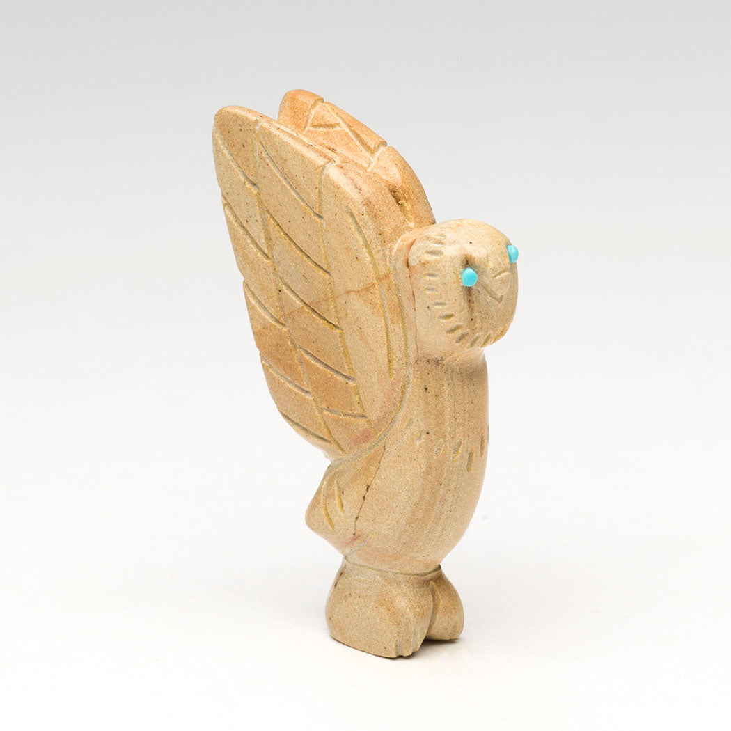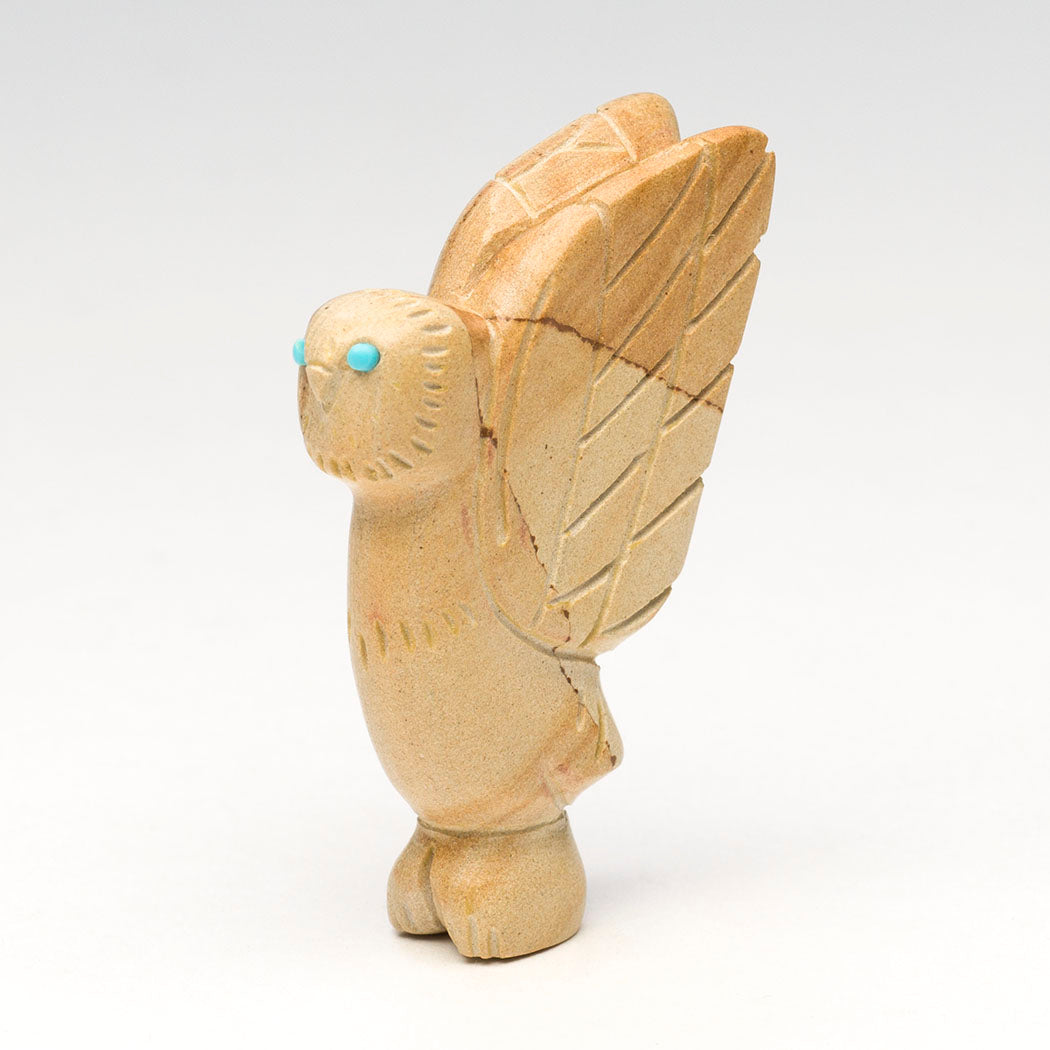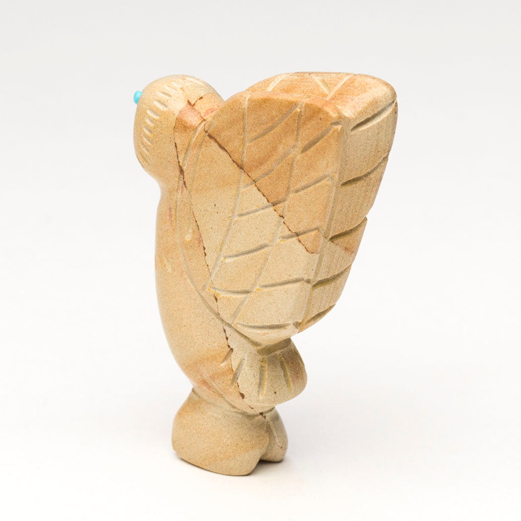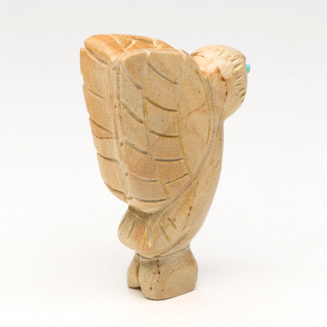 In January of this year, a 1,400-year-old stunning Zapotec tomb in Oaxaca has excited the archeological world as a well-preserved and enormous sculpture of a wide-eyed Owl with a painted Zapotec lord in its beak was found. The Zapotecs are known as the Cloud People and their descendant still speak Indigenous Zapotec. In ancient Zapotec culture, the owl represents power and the passing of life. Cody Chavez's picture jasper raptor with sky blue turquoise eyes holds all the power and respect that the A:Shiwi (Zuni) have for the Night Grandfather. About 2 1/8" tall, 3/8" wide and 1 1/2" deep. Etched facial disc feathers and wings are lovely.