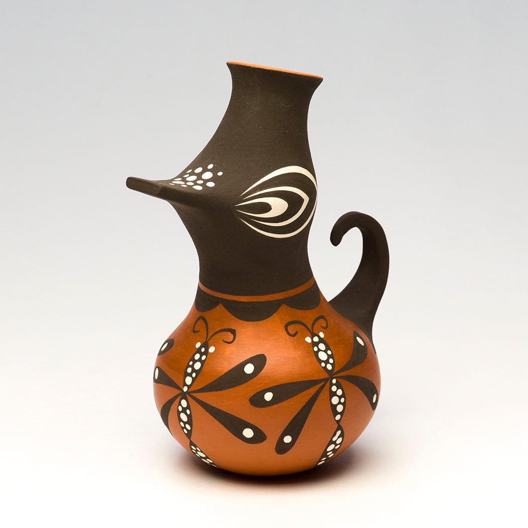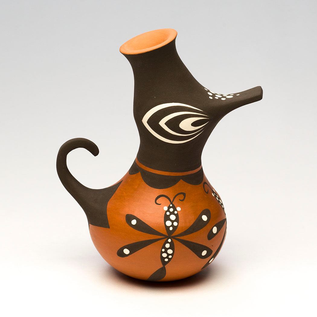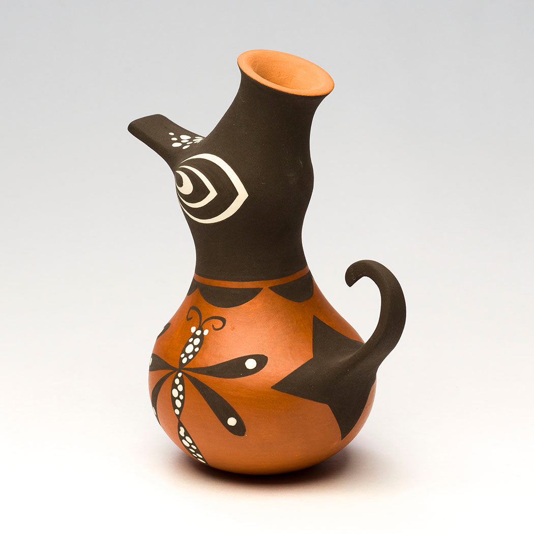 Mother and son Avelia and Anderson Jamie Peynetsa who are both noted Zuni potters collaborated in the creation of a delightful and collectible pottery duck who honors the miracle of life that water brings. Graphic eye rings, dotted beak and stylized tail feathers decorate the fabulous water fowl. Robust Dragonflies also adorn the skillfully hand-built with natural clay and painted with mineral pigments small-sized pottery. About 4 1/2" long, 3" wide and 5 5/8" tall. Signed by the artists. This link will take you to an informative write-up on Zuni pottery.