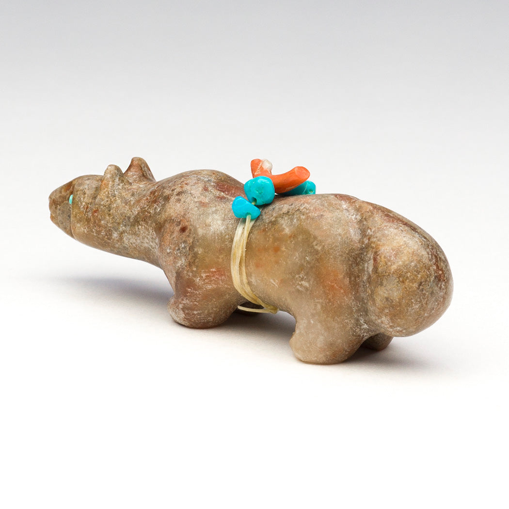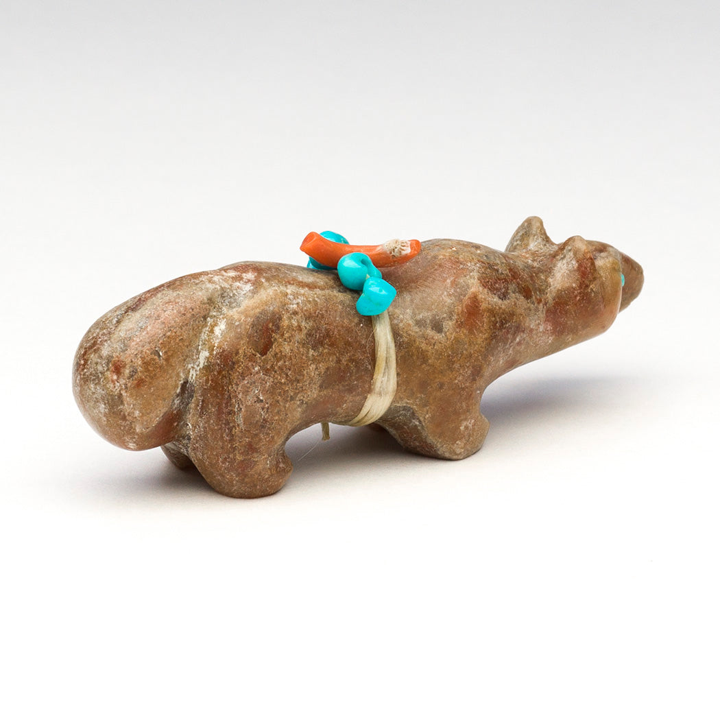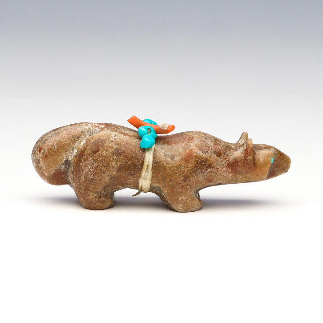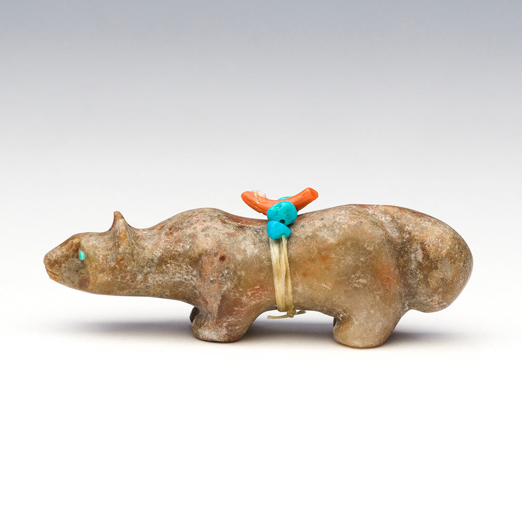 We had the pleasure to chat with Zuni artist Gabriel Sice on a recent visit to our Keshi gallery. When asked about his use of lovely Utah alabaster, he shared that he really enjoys pushing himself to work with different stones. It seems that this curiosity of different stones is what keeps him creative. As he said "I'm always learning something." His lively Utah alabaster Fox (Wolf or Coyote) has sky blue turquoise eyes and an offering bundle from branch red coral and turquoise beads, a carving representative of his fearless and creative spirit. About 2 1/2" long, 5/8" wide and 7/8" tall.