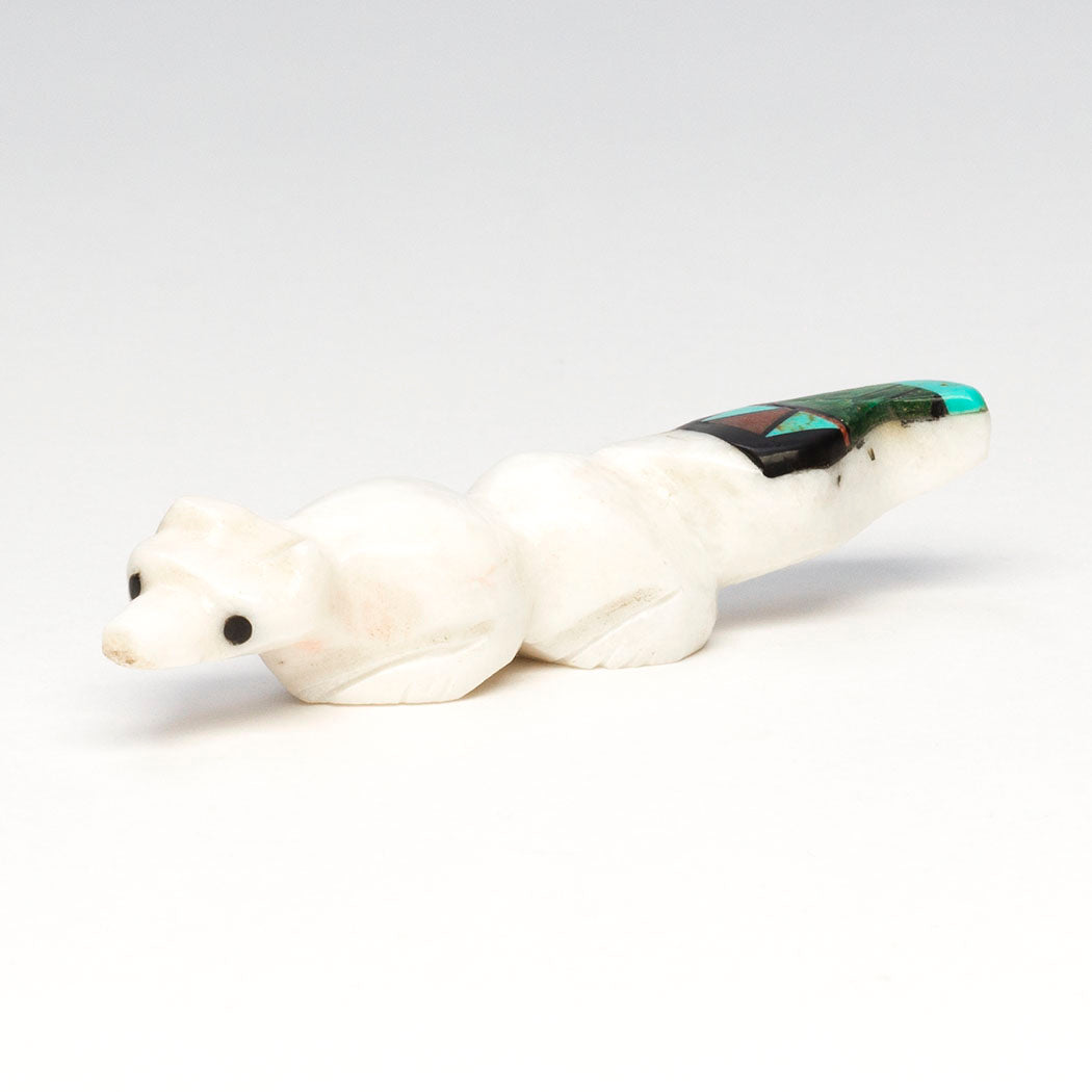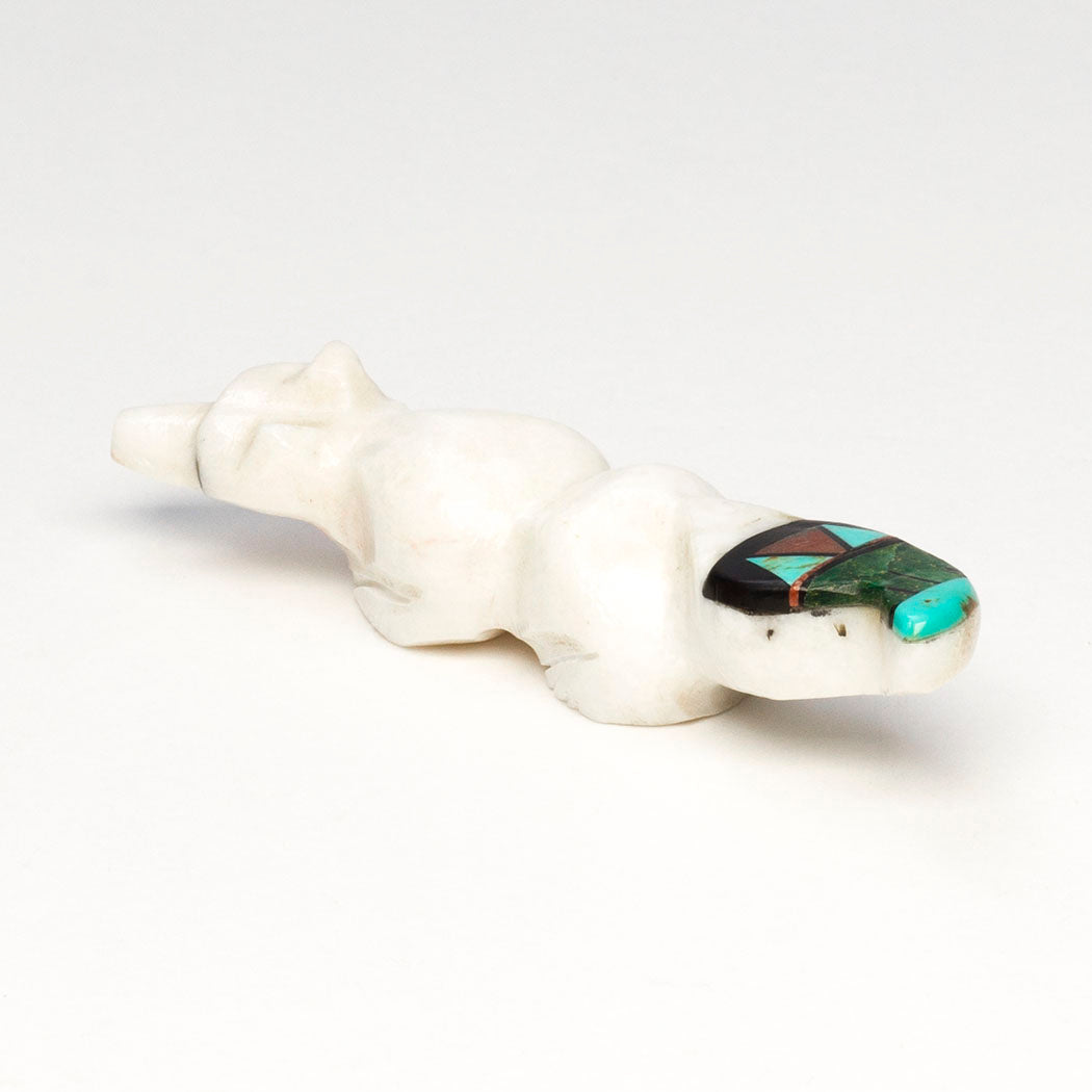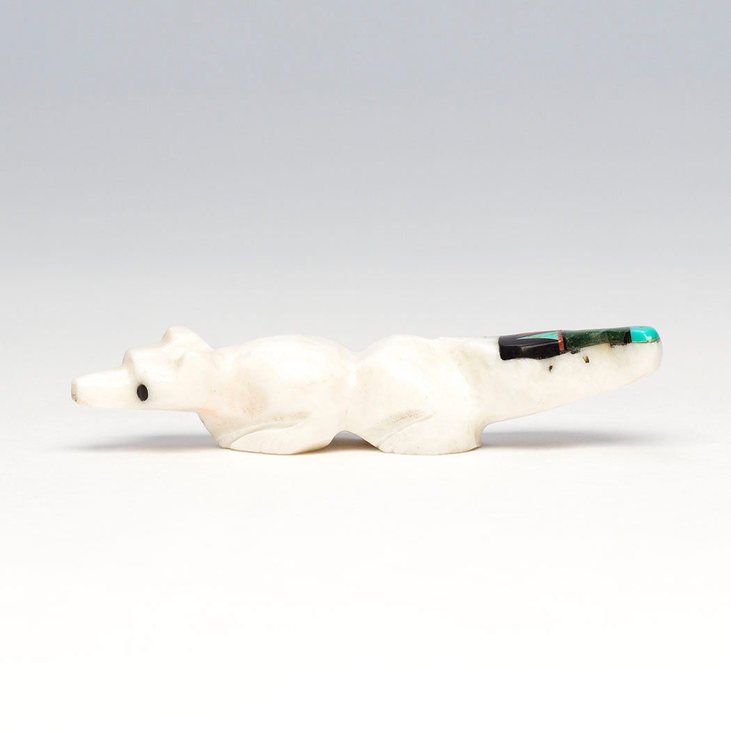 An Arctic Fox's fur turns white in the winter like Stevan Natachu's nomadic wild canine sculpted from marble. We're admiring its jet-eyed expression and voluminous tail overlaid with a gorgeous mosaic from materials like turquoise, jet, malachite, coral and pipestone. Approximately 3 3/8" long, 3/4" wide and 5/8" tall.