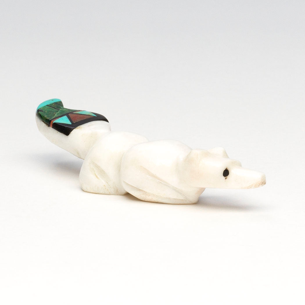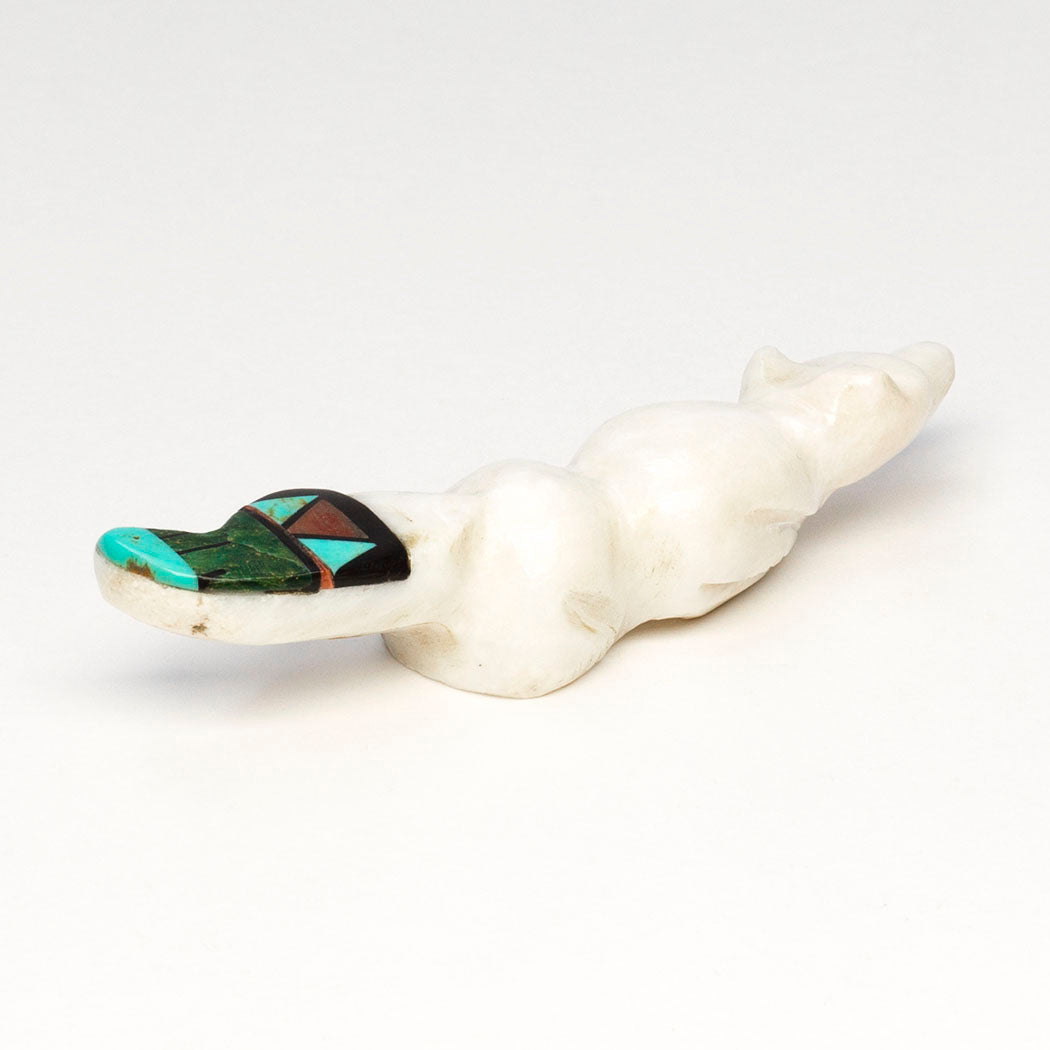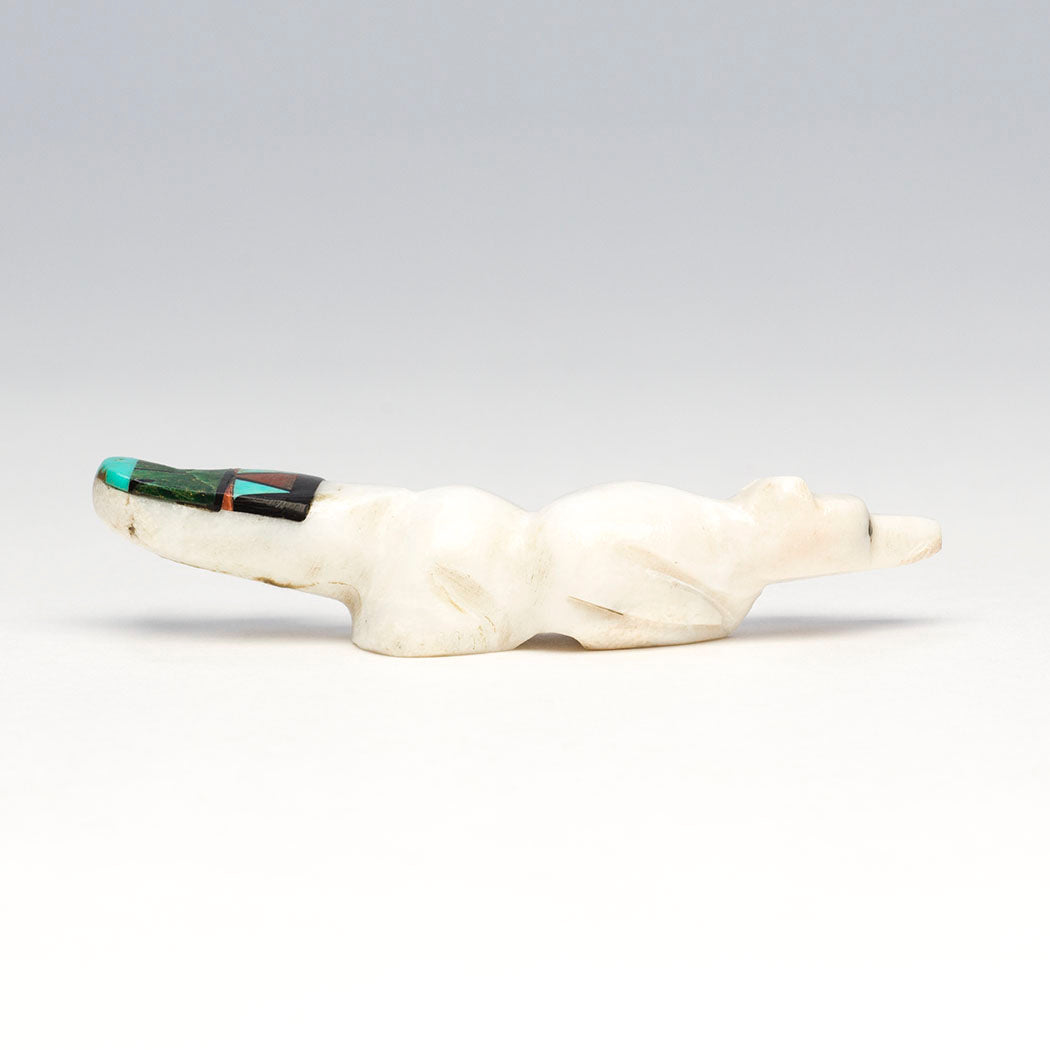 An Arctic Fox's fur turns white in the winter like Stevan Natachu's nomadic wild canine sculpted from marble. We're admiring its jet-eyed expression and voluminous tail overlaid with a gorgeous mosaic from materials like turquoise, jet, malachite, coral and pipestone. Approximately 3 3/8" long, 3/4" wide and 5/8" tall.