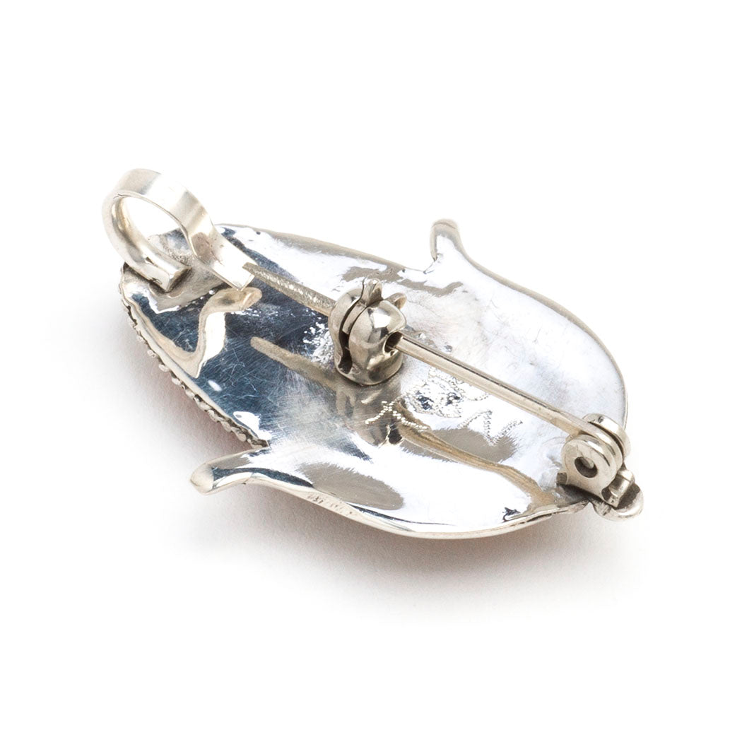 Jeweler Tracey Bowekaty's refreshing corn pin/pendant is from handmade from sterling silver and carved orange spiny oyster shell set with colorful stones and shell like turquoise, alunite, pen shell, malachite and lapis. About 1 1/4" long and 7/8" wide. Signed by the artist.