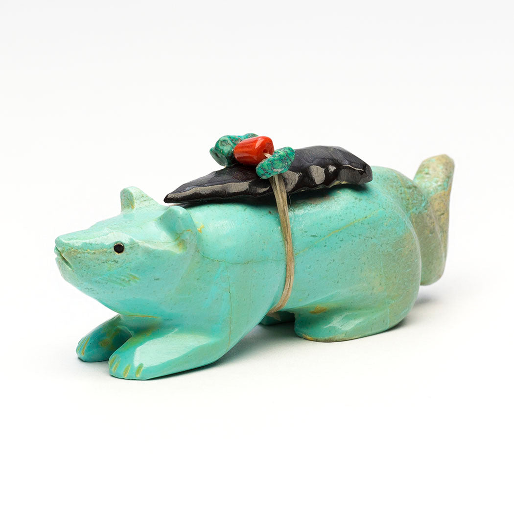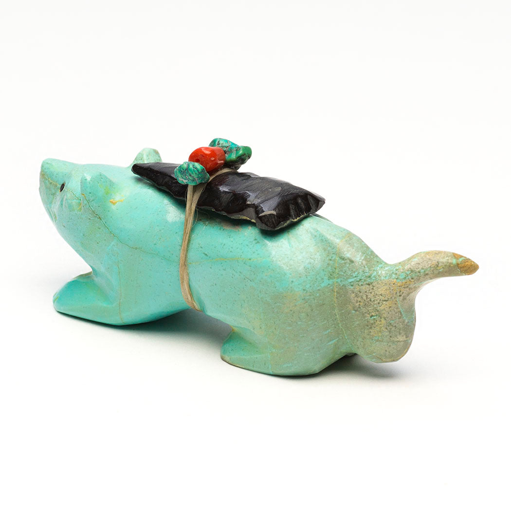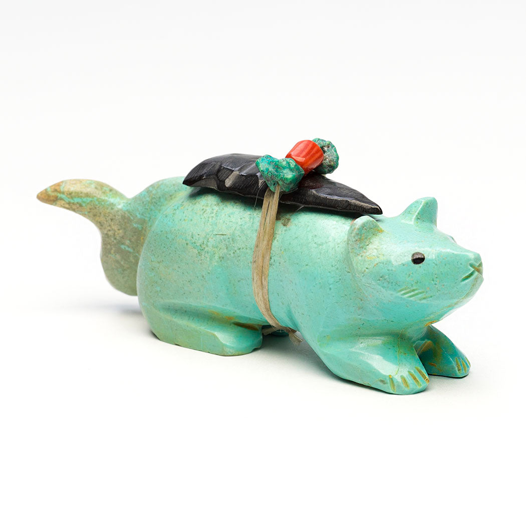 Mountain-lion's (puma's, cougar's or panther's) long tail provides balance and control essential for success as an ambush predator. The awesome tail enables it to stalk quietly and launch precise attacks. Calvert Bowannie's turquoise feline's tail is a lovely one. Discriminating eyes are from jet inlays. Tiny etching gives whiskers to this approximately 3 3/8" long, 3/4" wide and 1 3/8" tall great cat. The offering bundle has a gorgeous black marble point with branch red coral and turquoise beads.