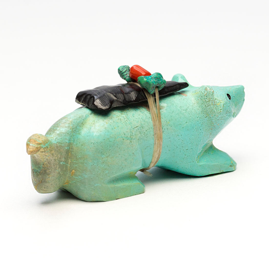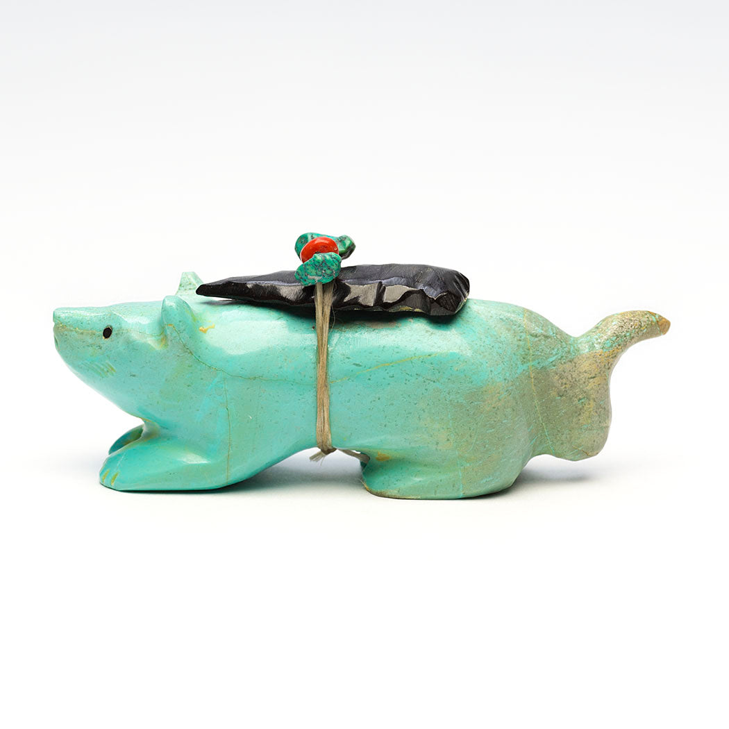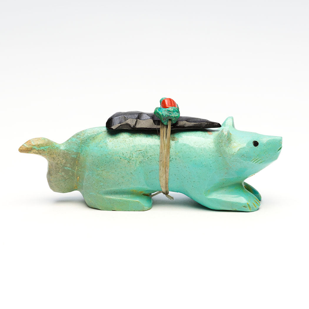 Mountain-lion's (puma's, cougar's or panther's) long tail provides balance and control essential for success as an ambush predator. The awesome tail enables it to stalk quietly and launch precise attacks. Calvert Bowannie's turquoise feline's tail is a lovely one. Discriminating eyes are from jet inlays. Tiny etching gives whiskers to this approximately 3 3/8" long, 3/4" wide and 1 3/8" tall great cat. The offering bundle has a gorgeous black marble point with branch red coral and turquoise beads.
