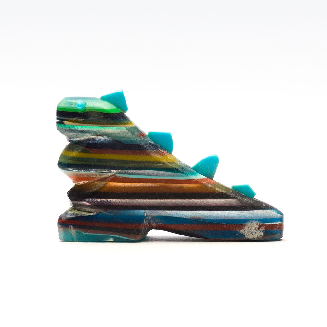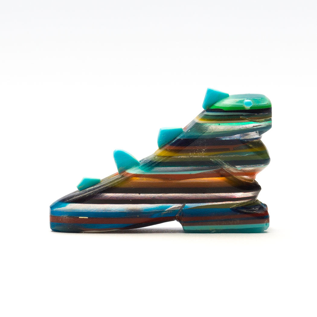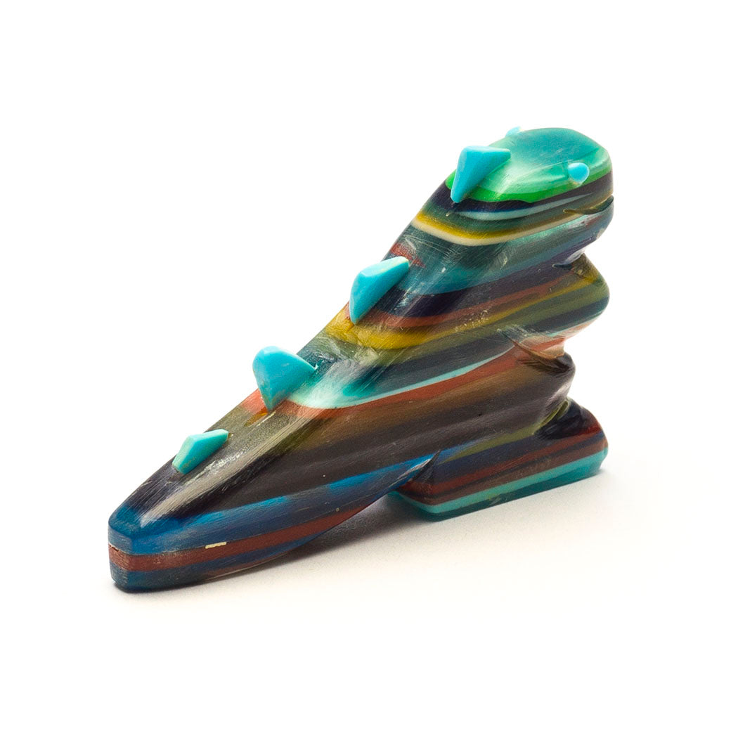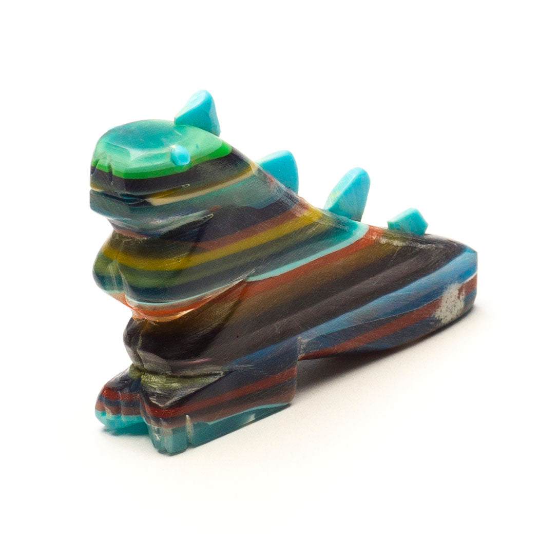 Cody Chavez's optimistic baby dinosaur is carved from upcycled surfite, a by-product from surfboard manufacturing. This just might be the cutest ancient Lizard there ever was because Cody carves wonderfully dreamy dinosaurs. Adorable spikes and sweet eyes are from turquoise. The colors are bright and uplifting like a rainbow. About 1 3/4" long, 3/8" wide and 1 1/4" tall.