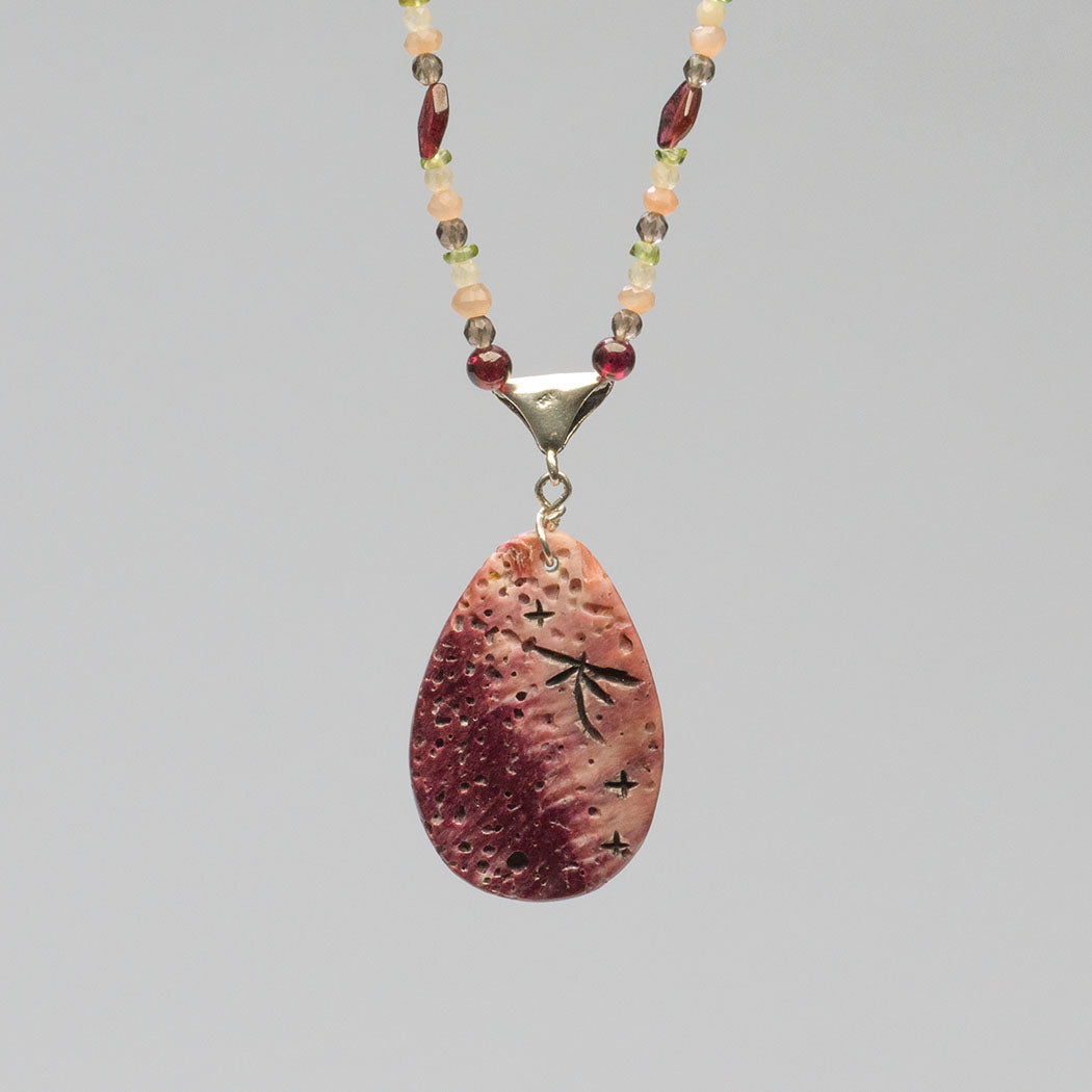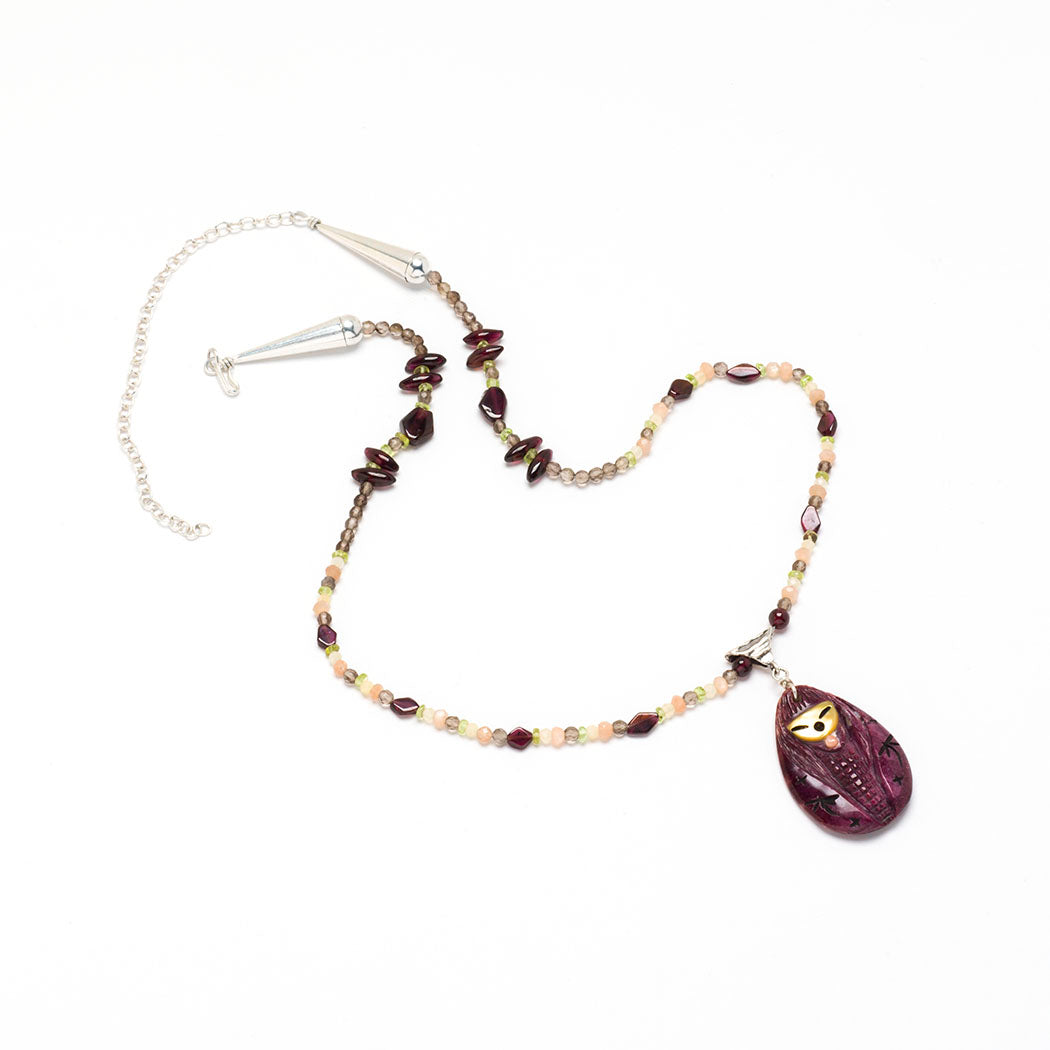 A deluxe assortment of luscious beads, some faceted, are from rich garnet, refreshing peridot, intriguing moonstone and perhaps smoky quartz in Kateri Quandelacy Sanchez's reversible Corn-Maiden pendant necklace. The soothing Corn Maiden is carved from colorful purple spiny oyster shell decorated with stars and Dragonflies that have been etched and filled with jet paste. An angel skin pink coral piece accents the Corn body. An iridescent gold lip shell face is etched and filled with jet paste as well. The fabulous pendant itself is about 2 1/8" long, 1" wide and 1/4" deep including the handmade sterling silver bale. Sterling silver clasps and extension chain are nice features on this necklace whose shortest total length is approximately 19 1/2", while the longest total length is about 24".